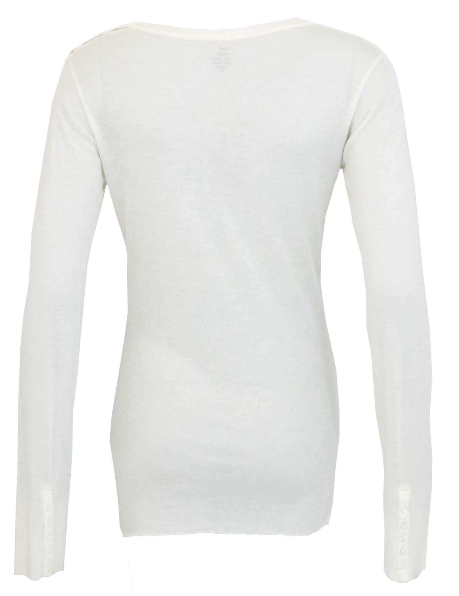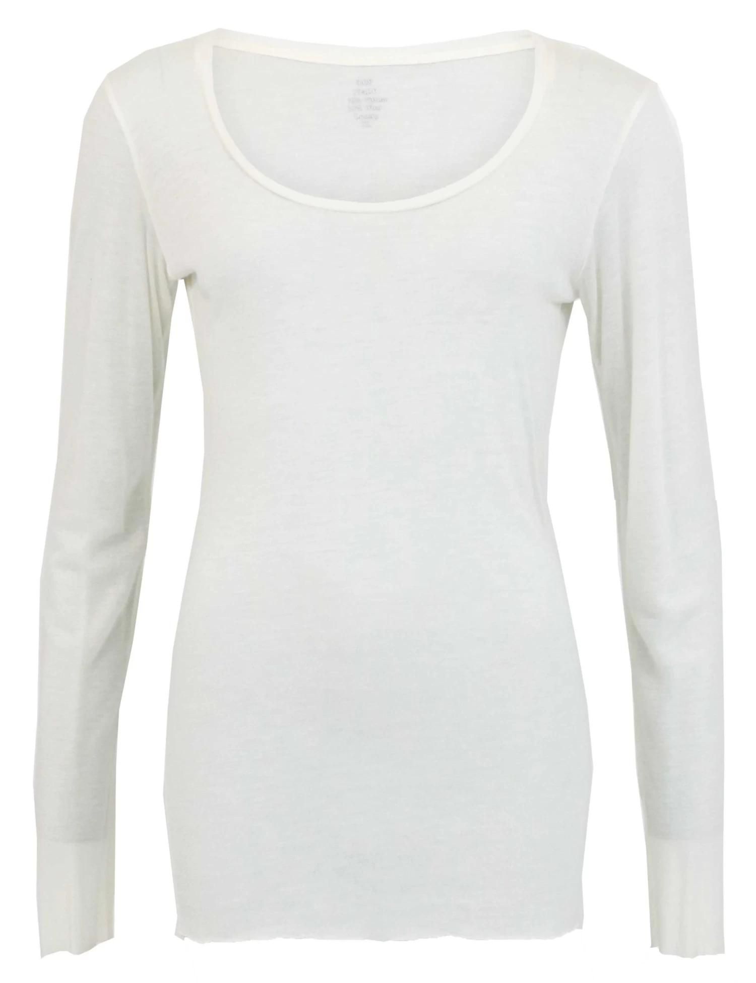 Een lang shirt van het merk 0039 in de kleur roomwit. Het shirt is licht transparant en heeft een brede ronde hals en lange mouwen. Dit shirt mag op de hand worden gewassen.