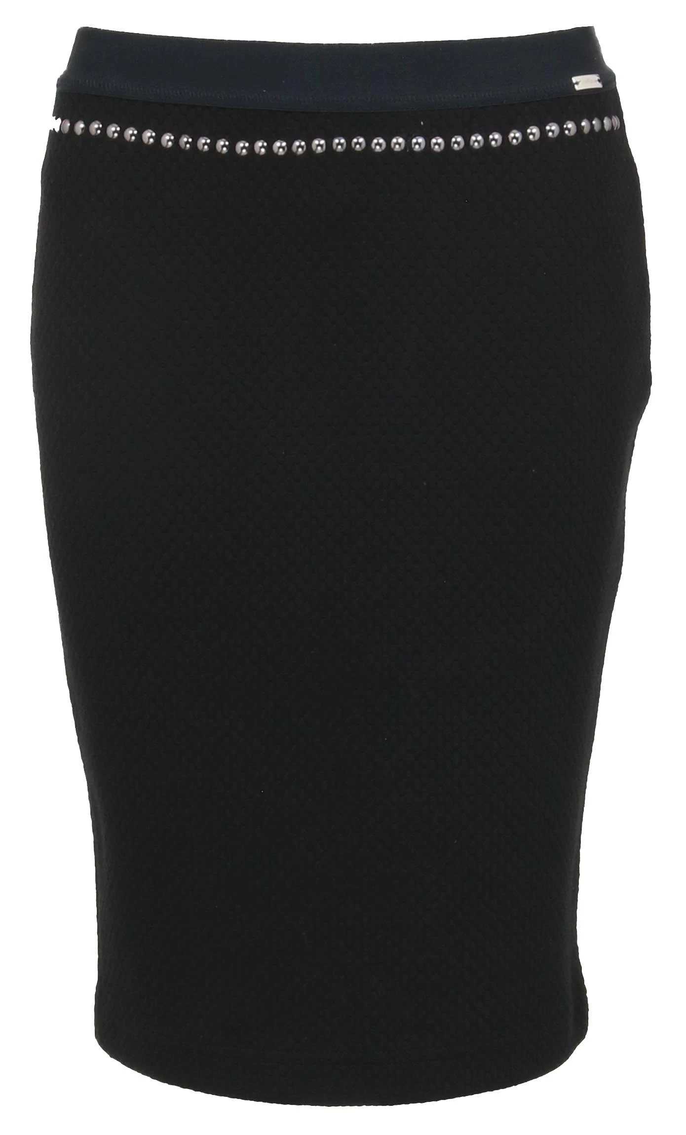Een rok van Airfield in een fijn ribbel patroon met onder de elastieken tailleband nikkelen studjes bevestigd in éen rij. De rok valt boven de knie en mag op de hand worden gewassen.
