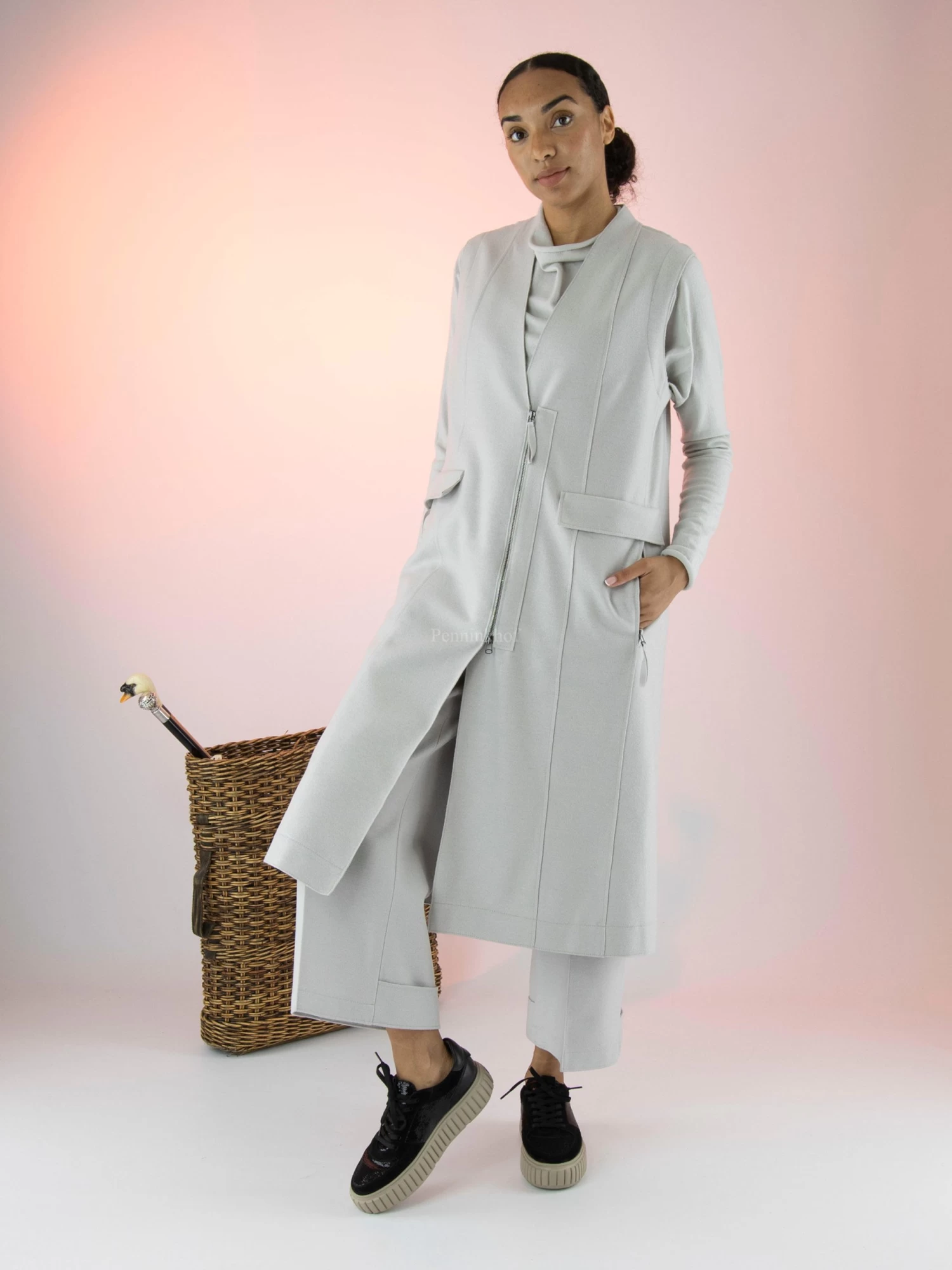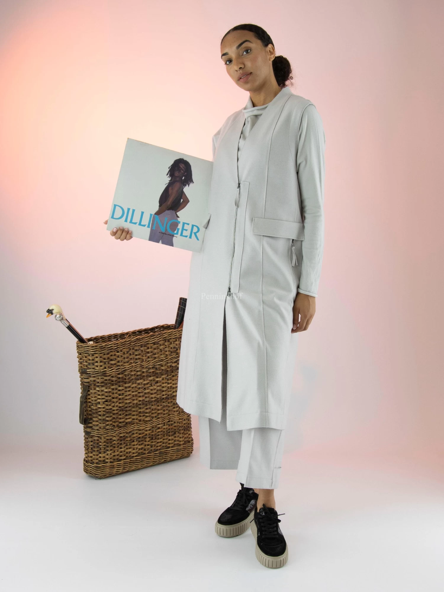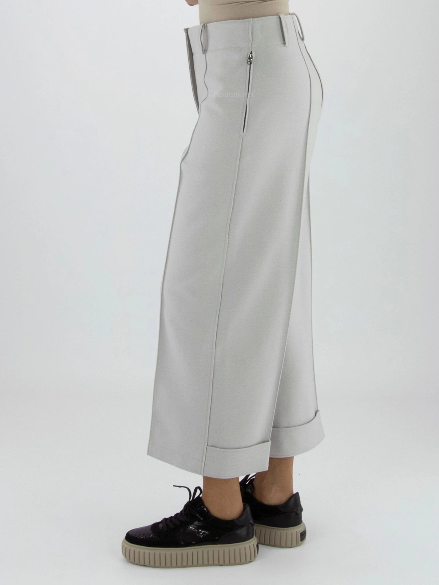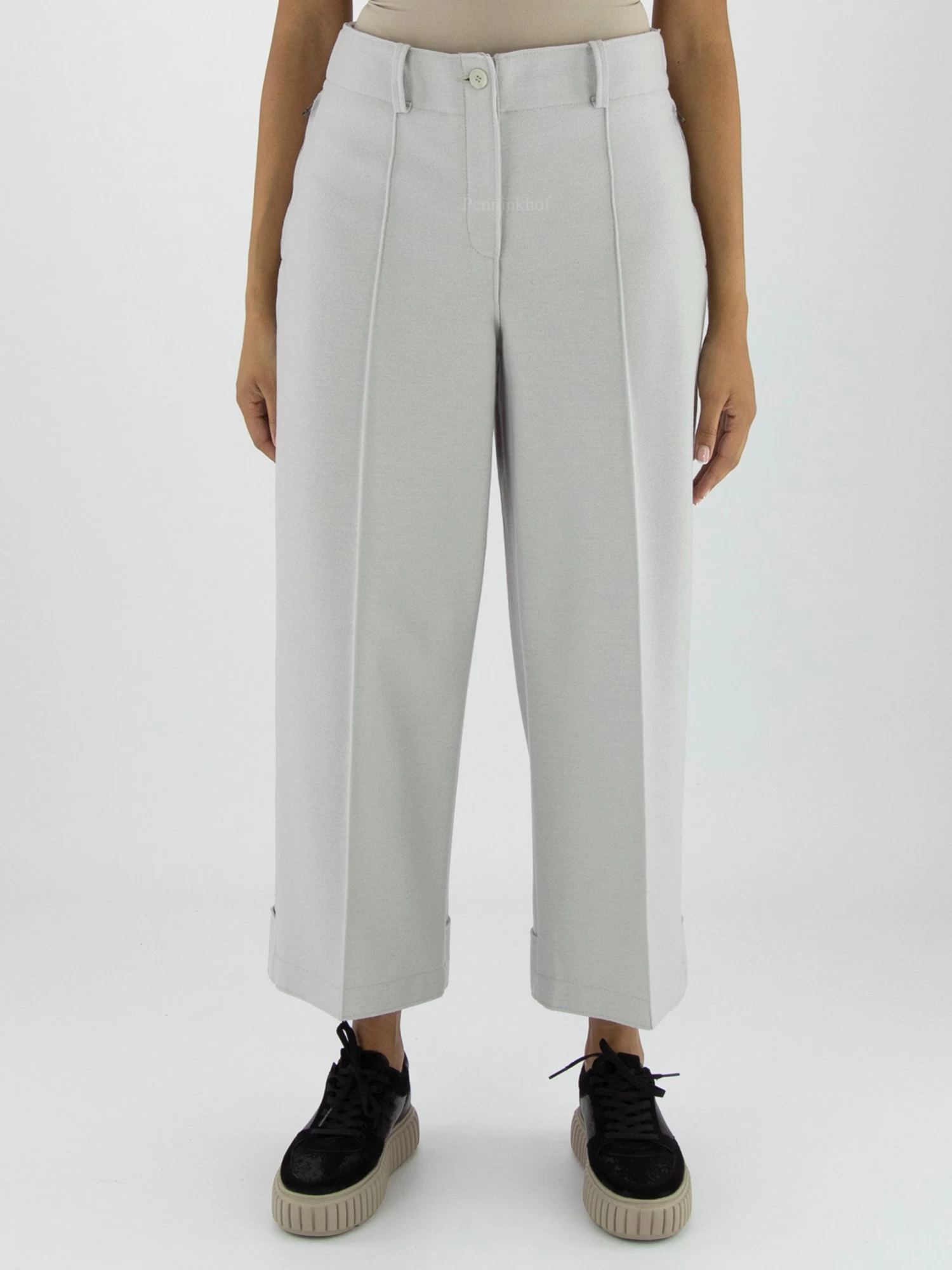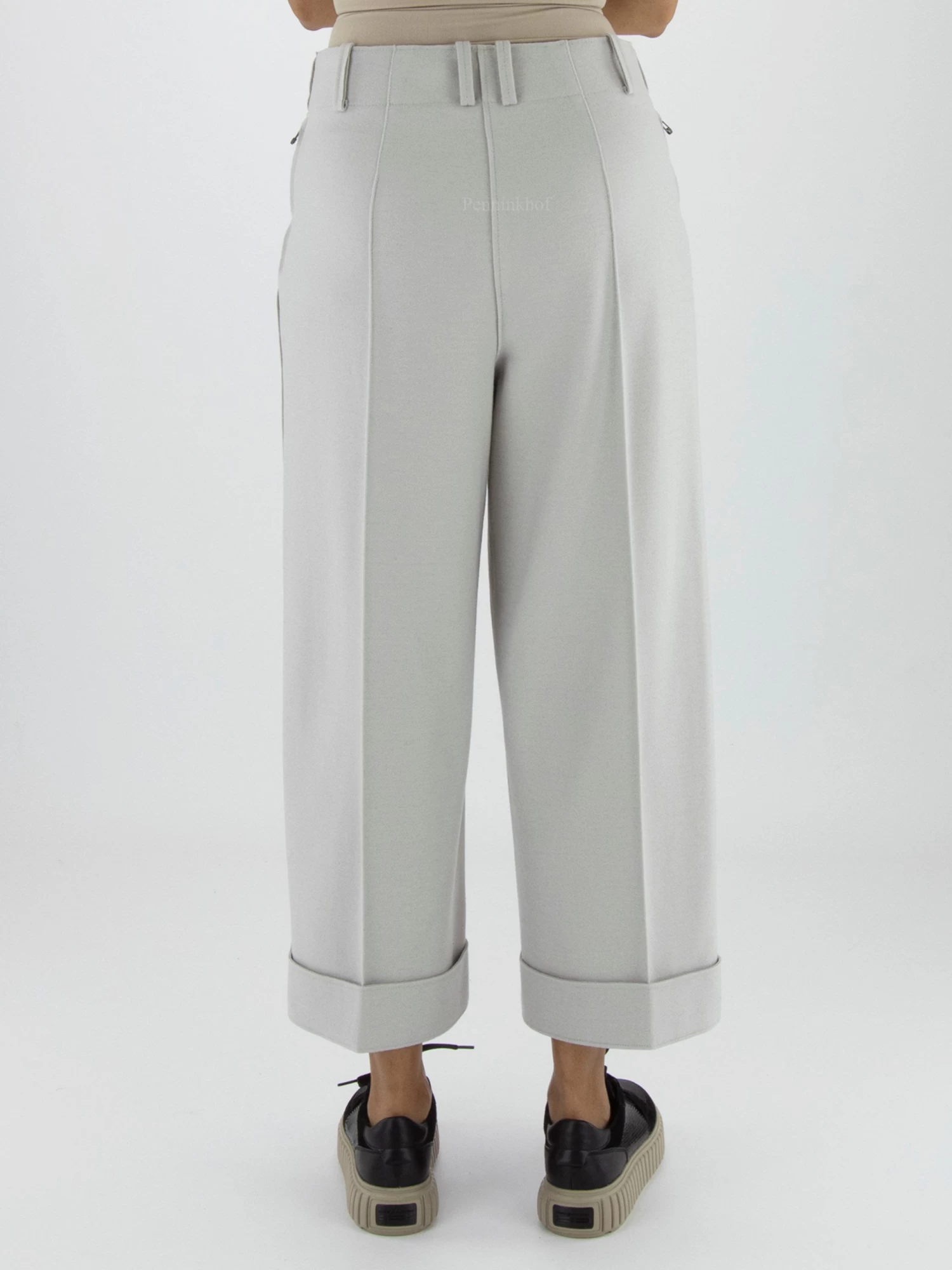 Een broek van Annette Görtz in een lichtgrijze kleur. Aan de voor en achterkant is in het midden van de pijpen een omgekeerde stiknaad. Aan de onderkant van de pijpen is aan de achterkant een brede omslag. Deze broek mag op de hand worden gewassen.