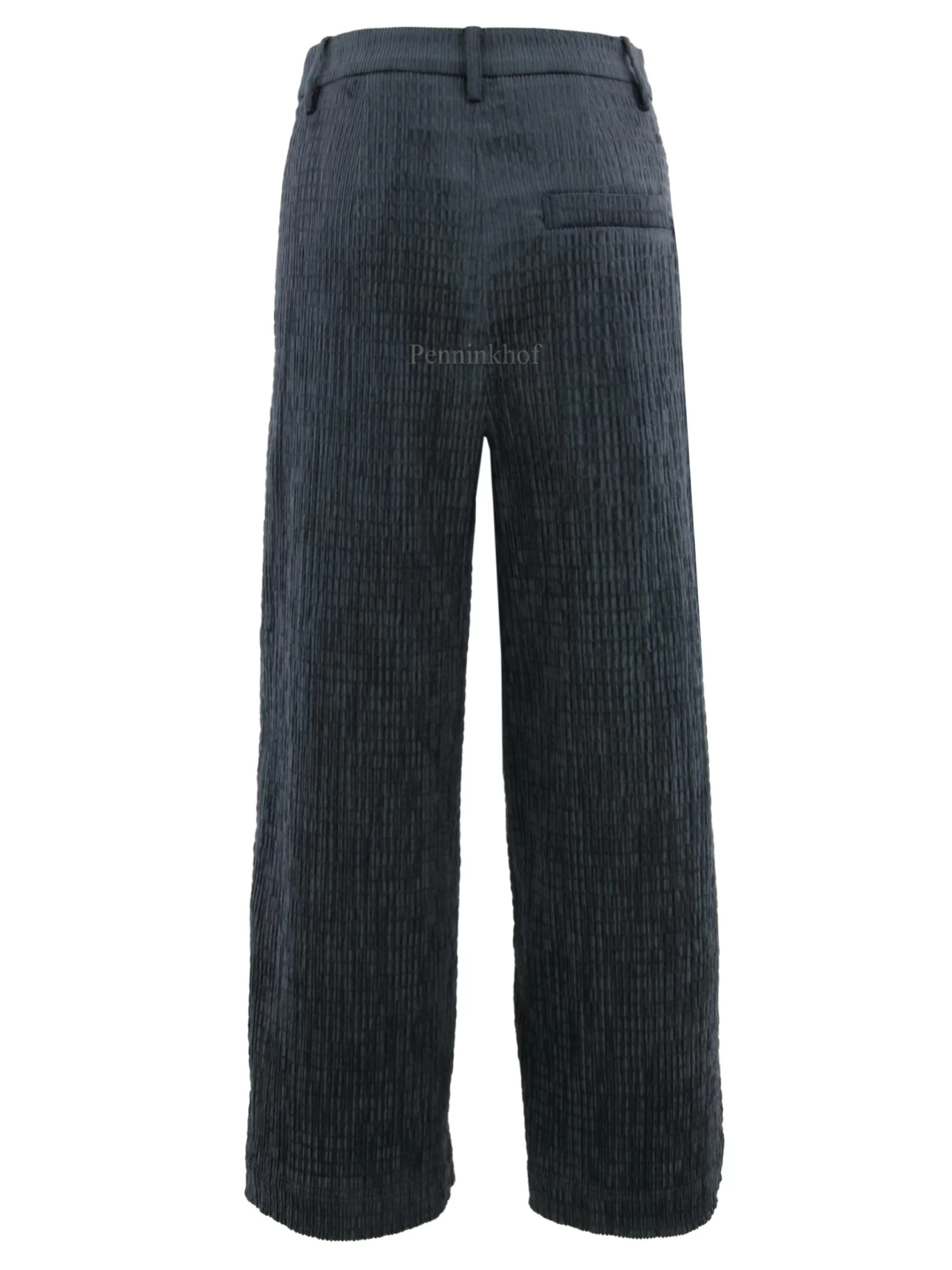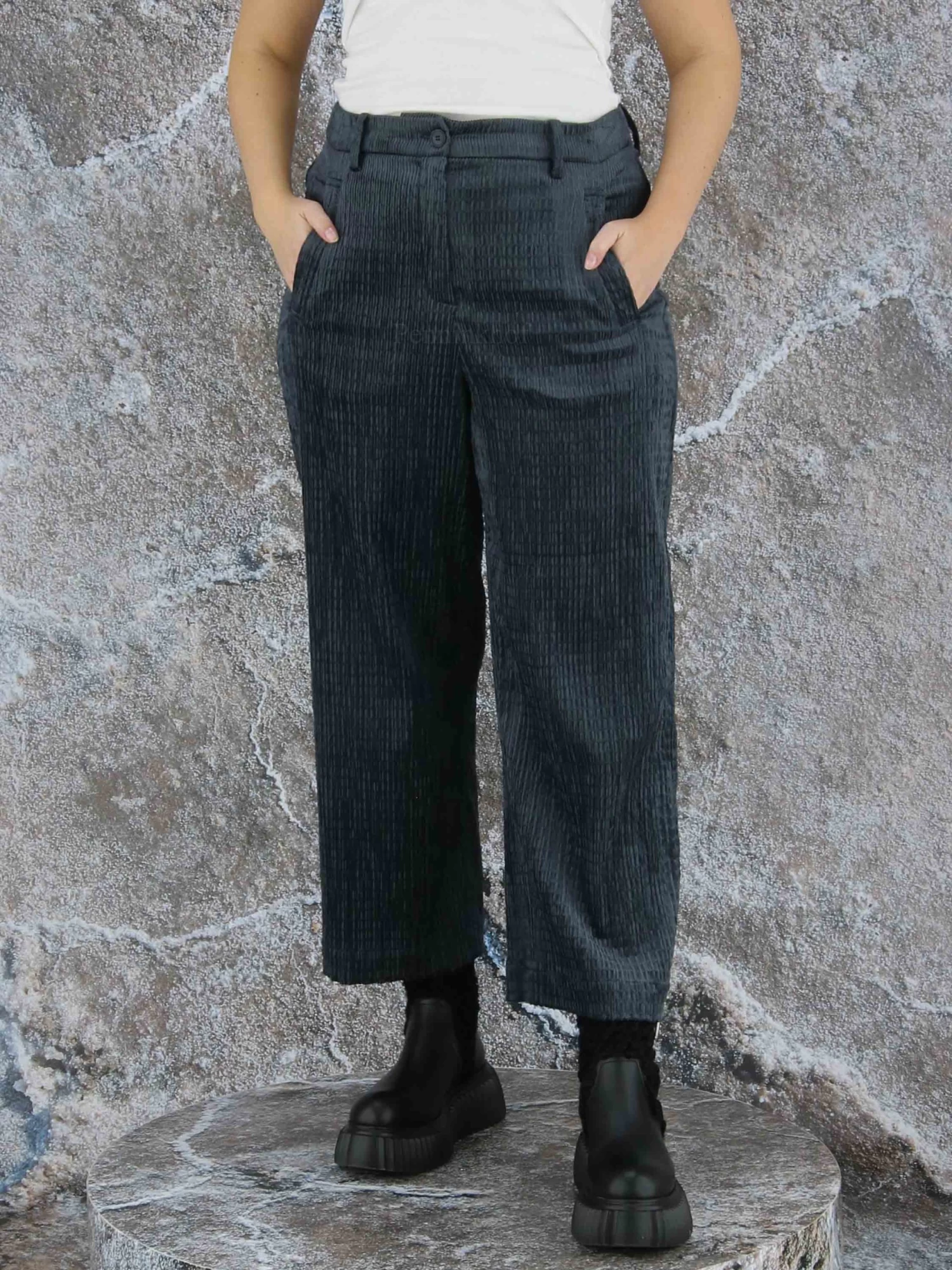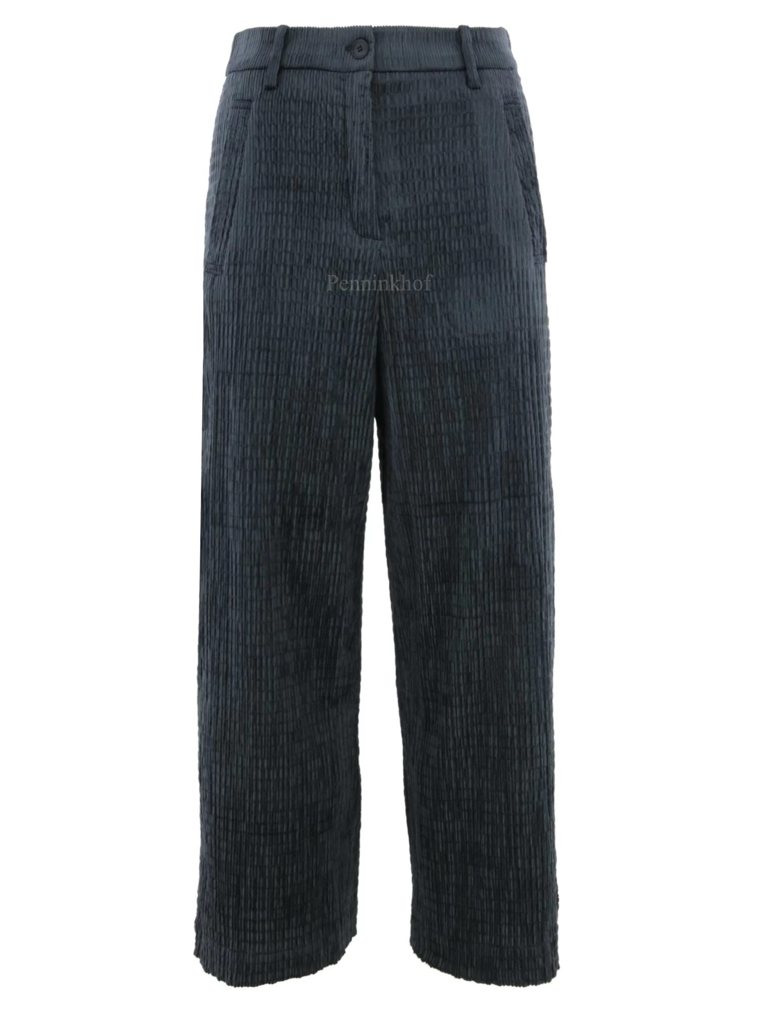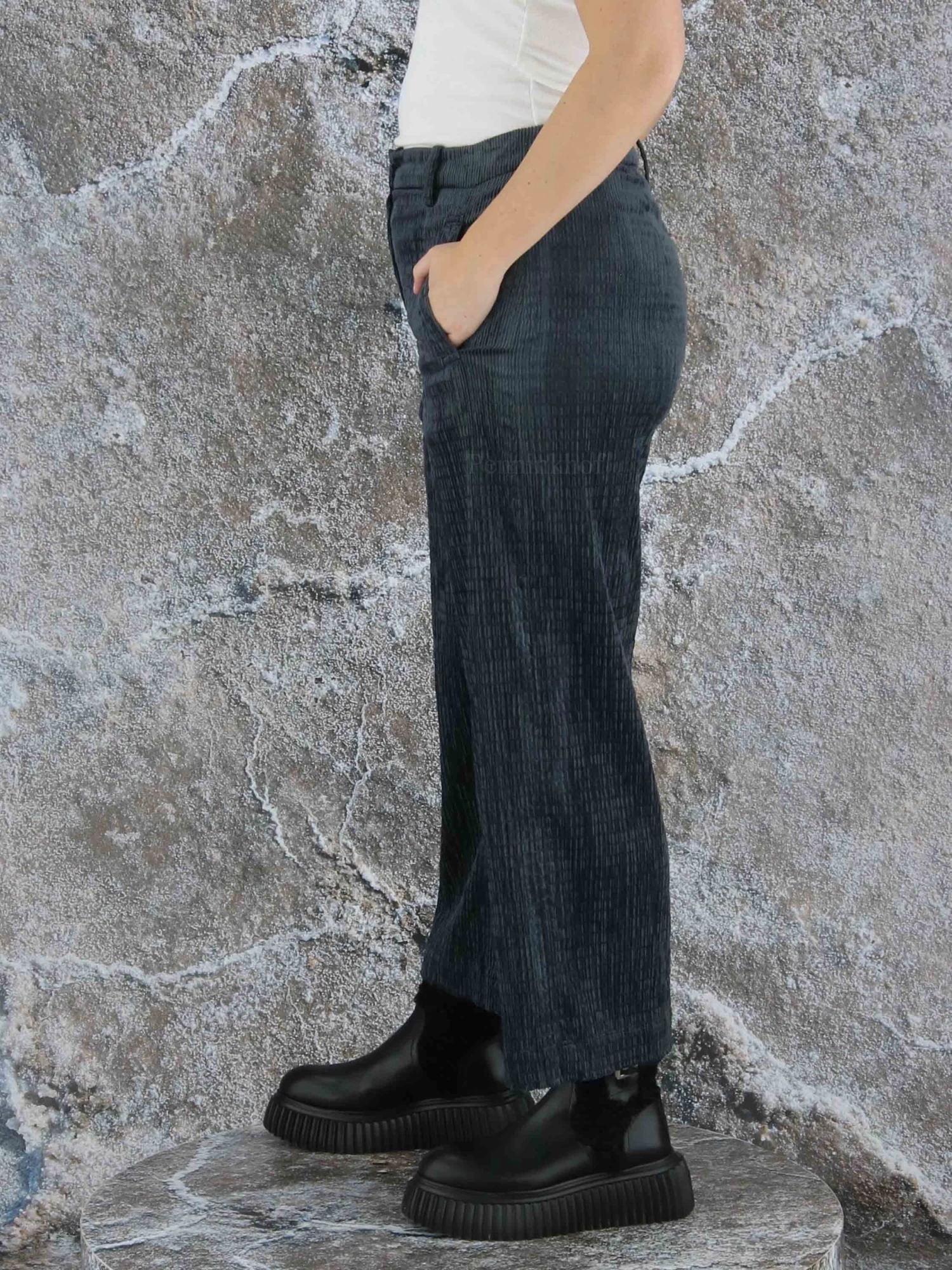 Een rib cord broek van Annette Görtz in de kleur donker grijs. De structuur van de broek heeft een vlecht look. De broek heeft steekzakken en mag op de hand worden gewassen.