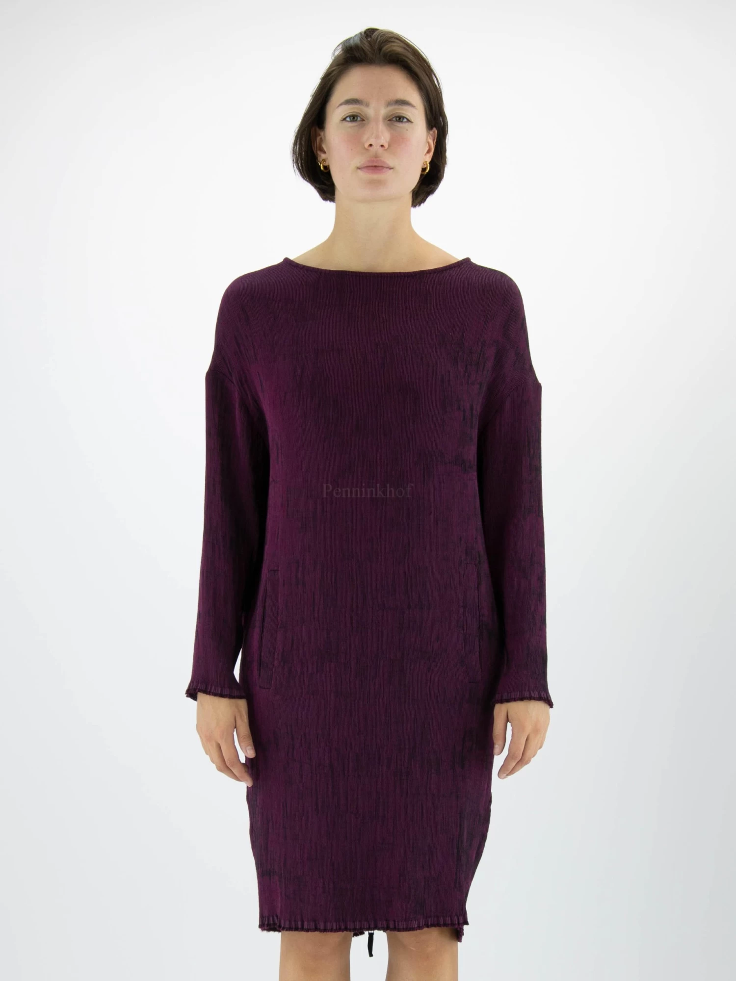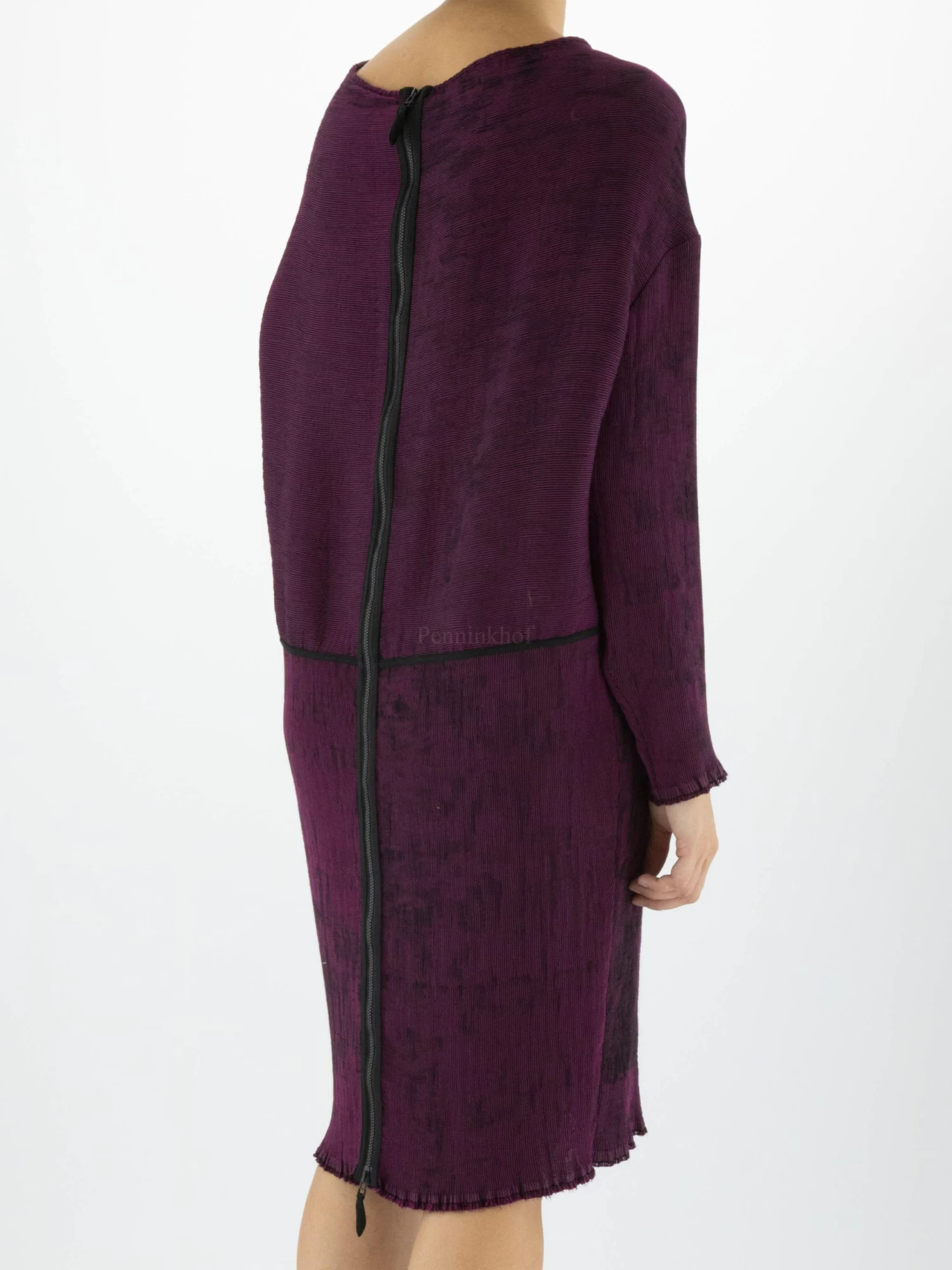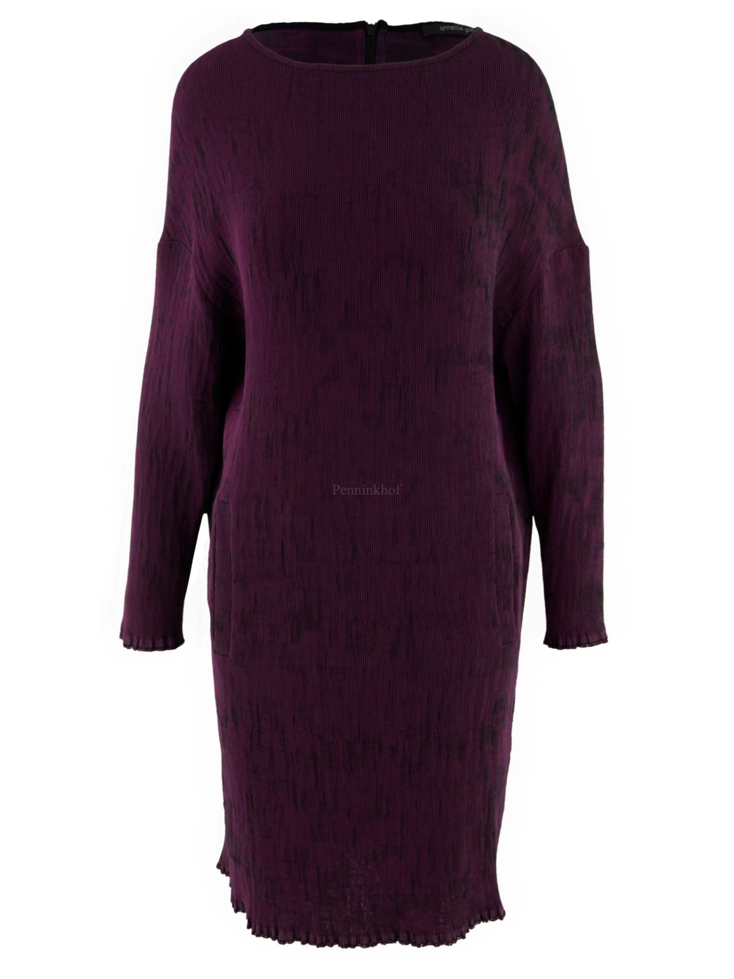Een jurk van Annette Görtz in een geribbelde structuur met de kleuren fuchsia en zwart. Ter hoogte van de taille zijn steekzakken. Aan de achterkant is een rits over de gehele lengte van de jurk. Aan het uiteinde van de lange mouwen en aan de onderkant vande jurk is de stof zeer fijn gerafeld./ Deze jurk mag op 30 graden worden gewassen.