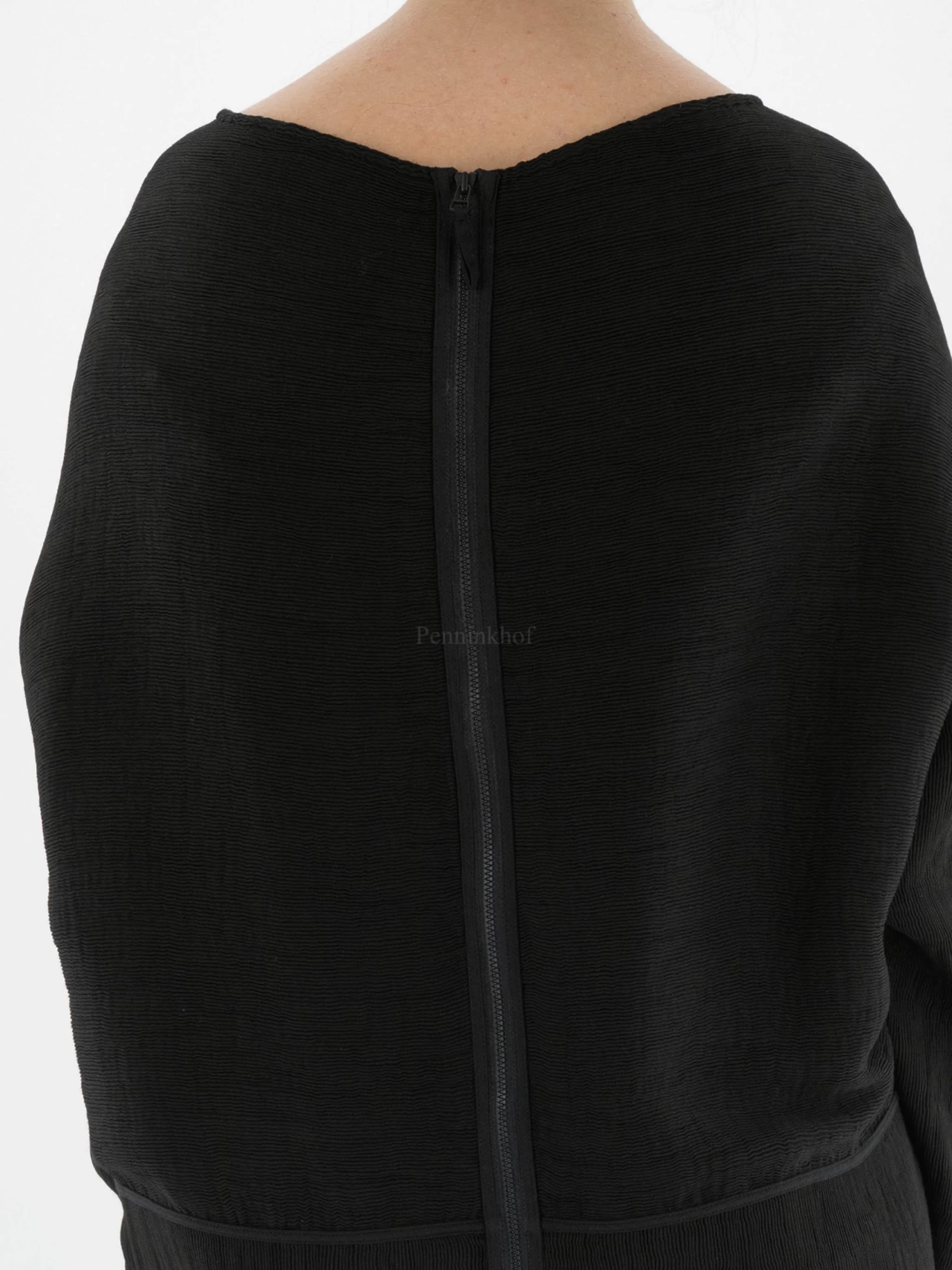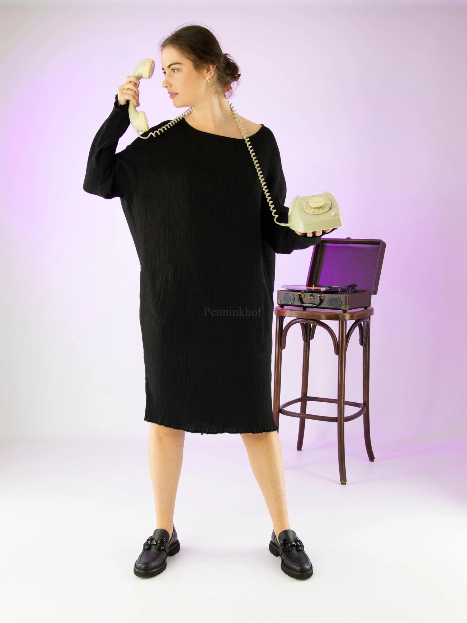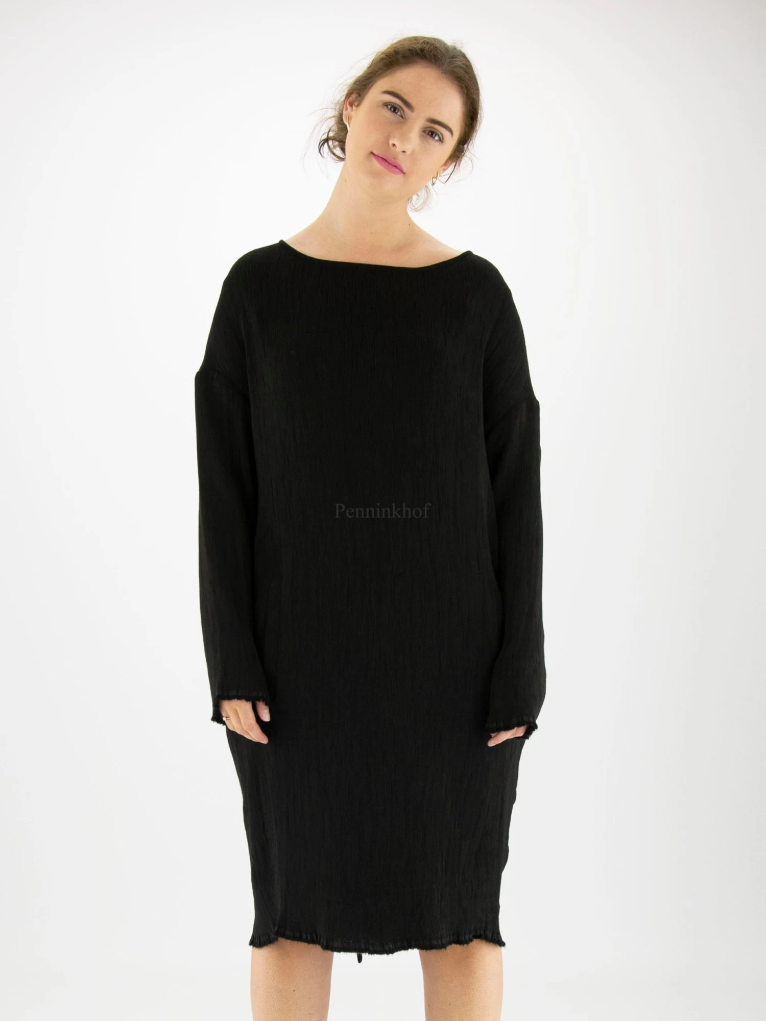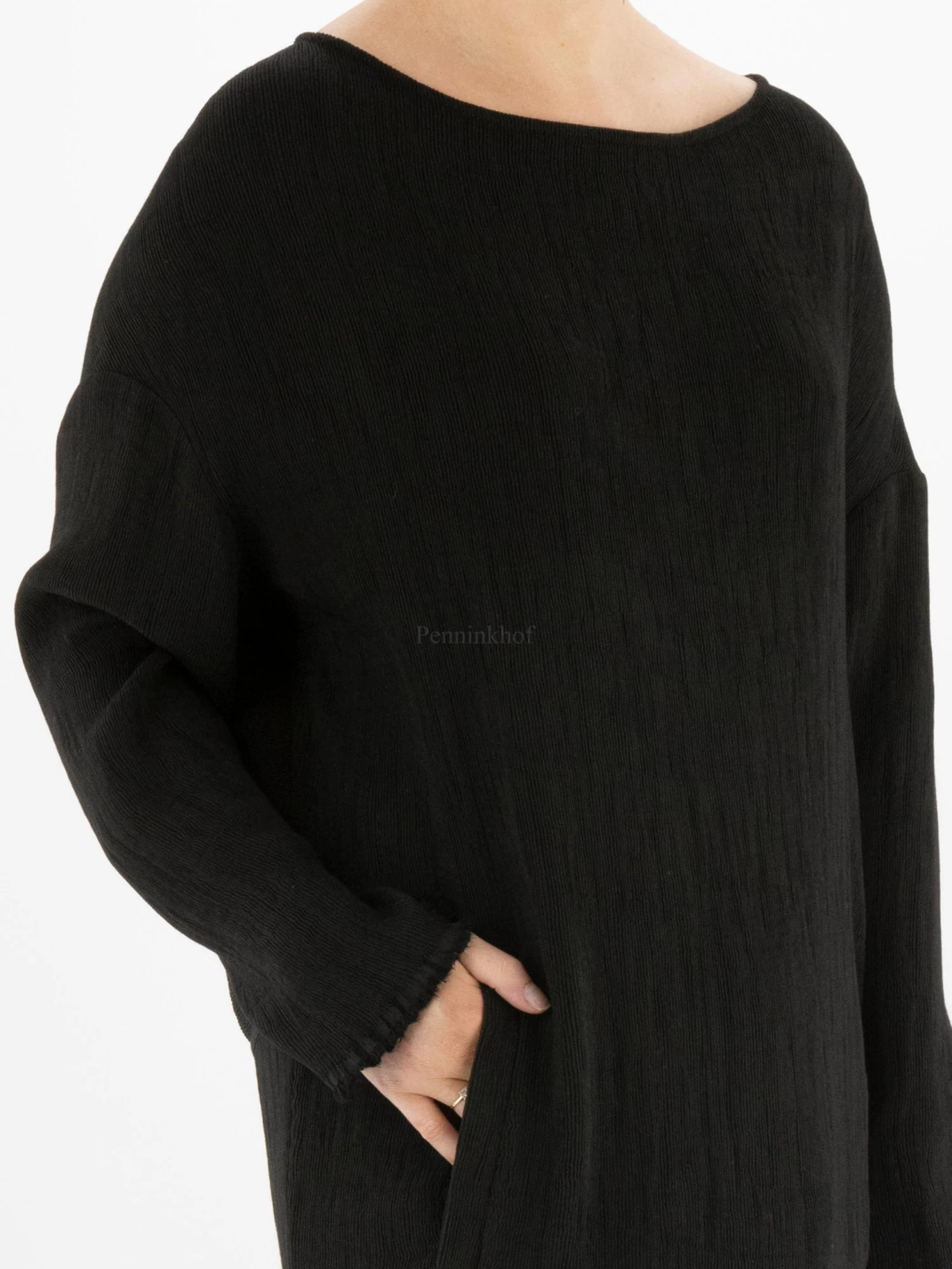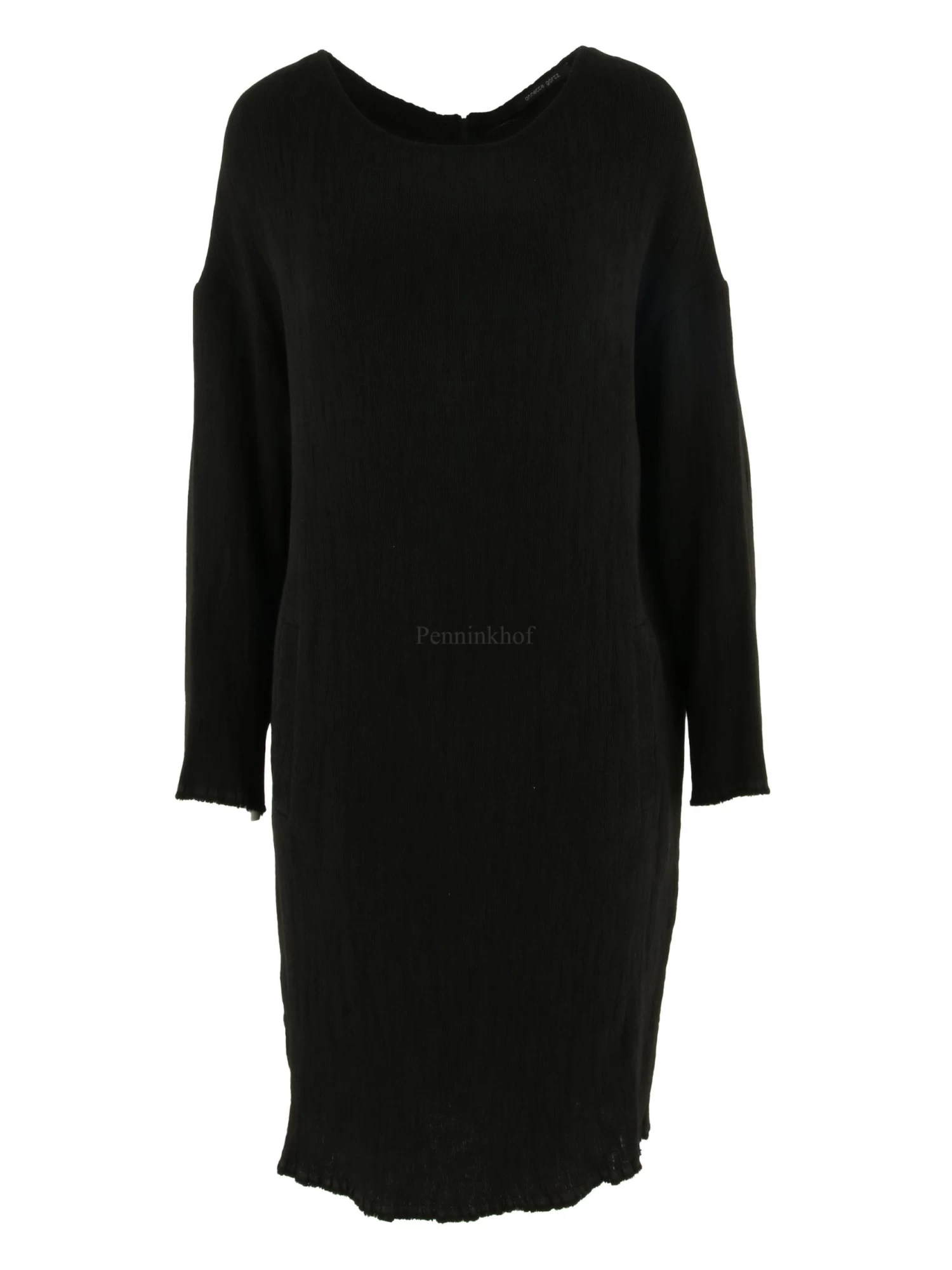 Een jurk van Annette Görtz in de kleur zwart. De fijn geribbelde stof is elastisch. Ter hoogte van de taille zijn steekzakken. De jurk heeft een ronde hals en mag op de hand worden gewassen.