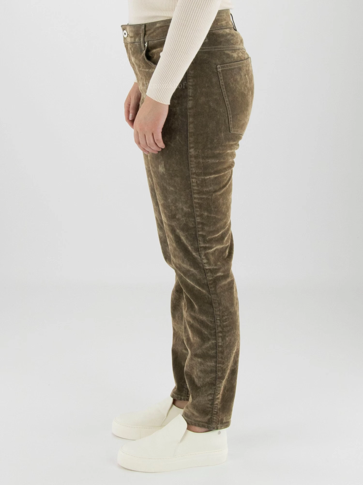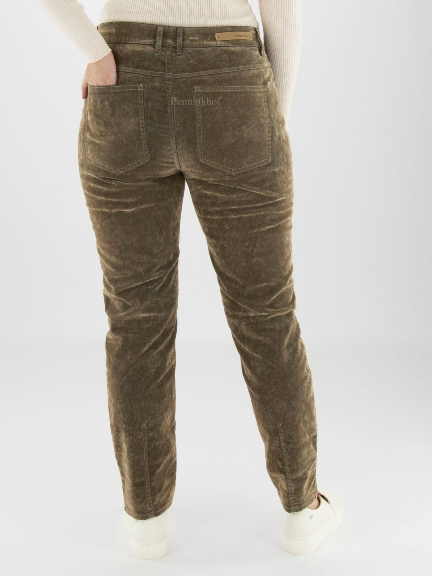 Een velours jeans van Annette Görtz in de kleur taupe. De jeans is in een 5 pocket model en mag op 30 graden worden gewassen.