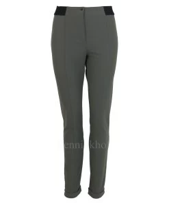 Een broek van Annette Görtz in een zachte olijfgroene kleur. In de taille is een zwarte elastieken band. In het midden van de voor – en achterkant is een doorgestikte naad. Aan de onderkant van de pijpen is een korte omslag. deze broek mag op 30 graden worden gewassen.