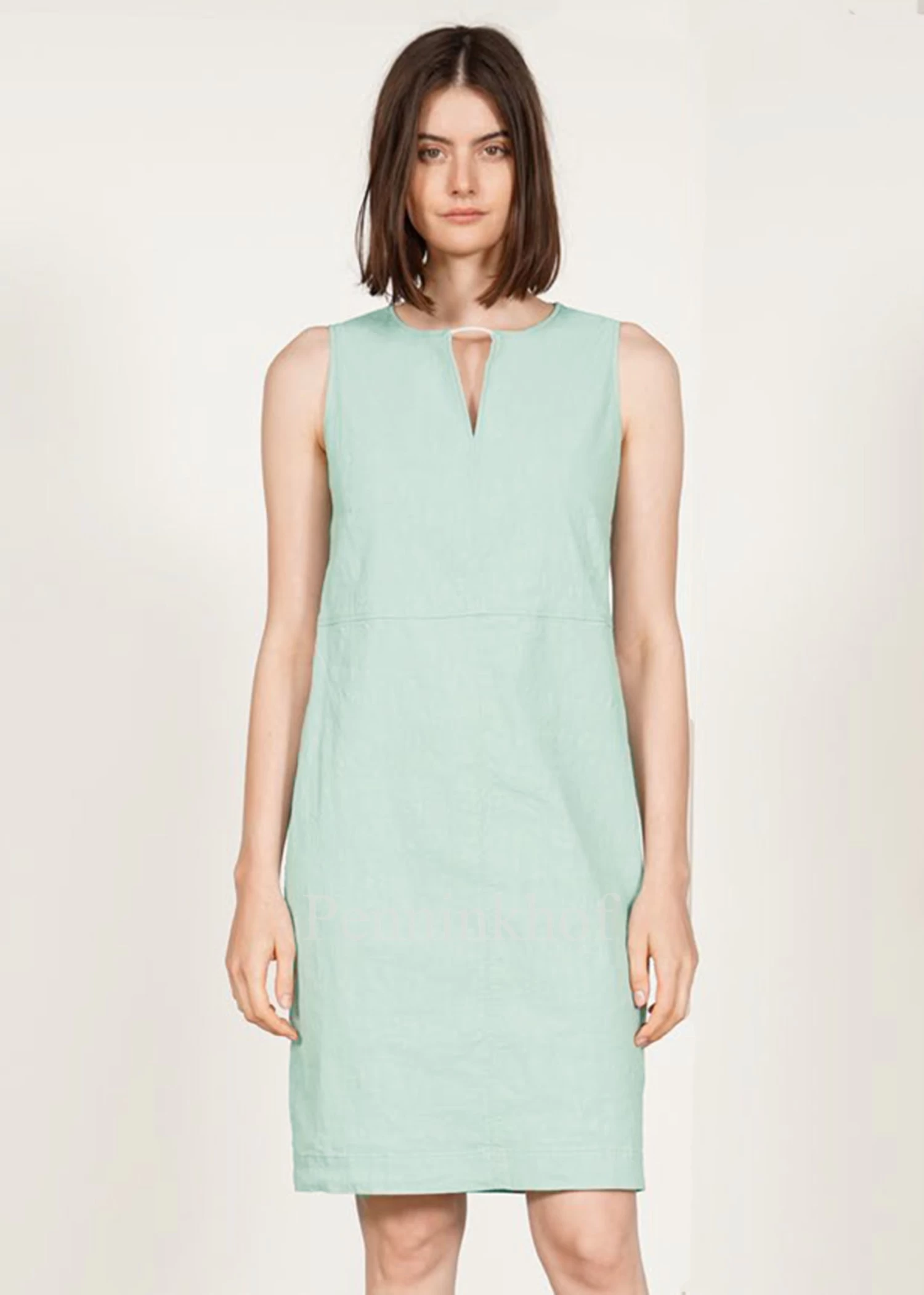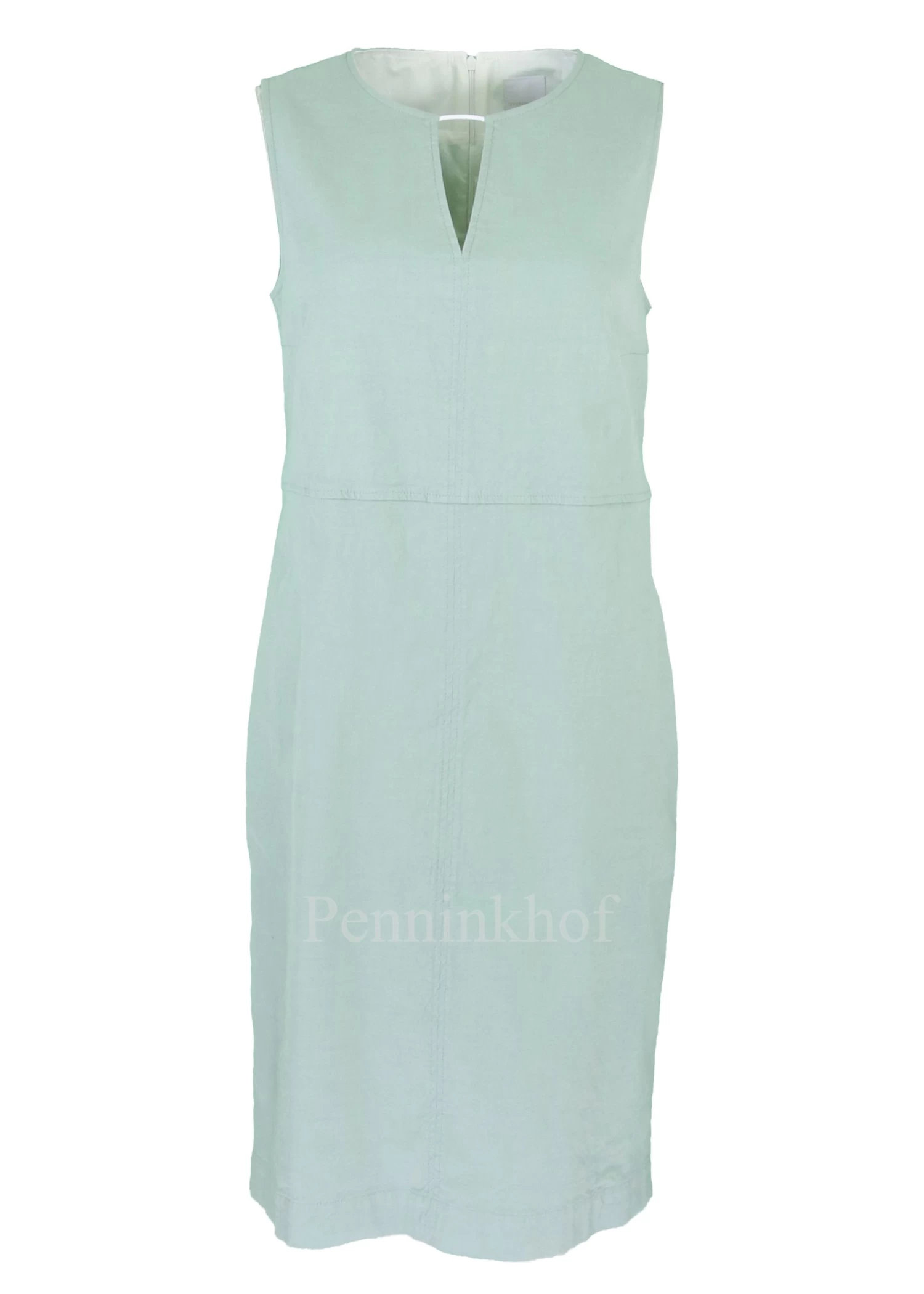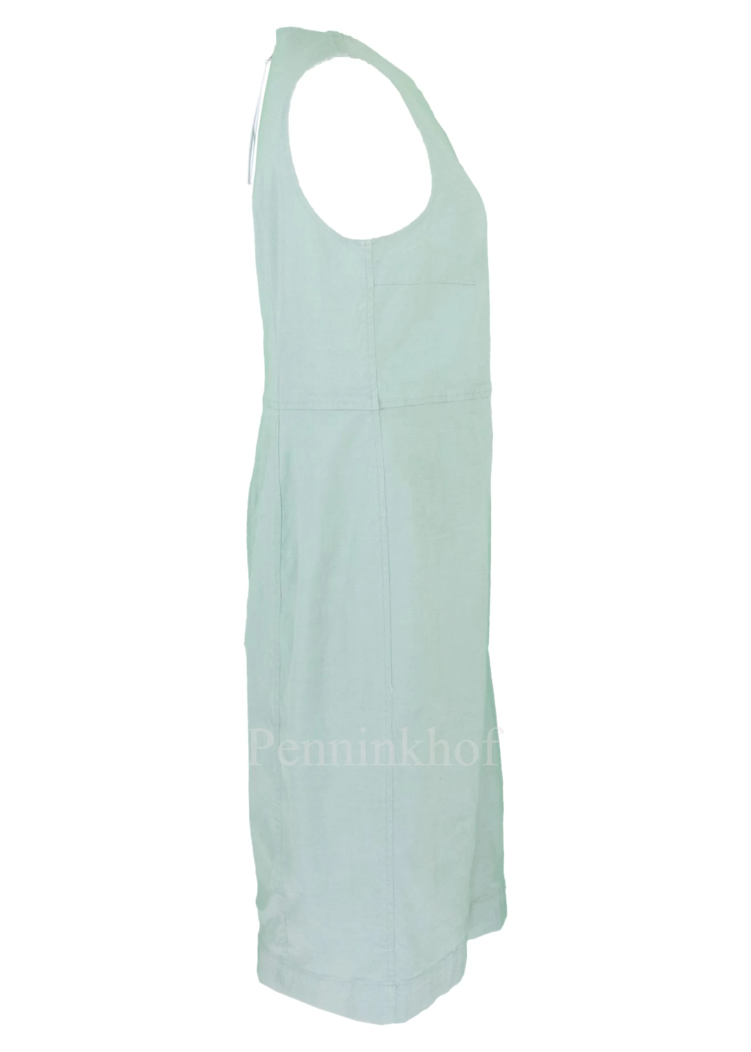 Een jurk van Annette Görtz in de kleur mintgroen. In het midden van de ronde hals is een korte V – uitsnijding met een elastisch koordje er tussen. De stof van de jurk is zeer elastisch en deze jurk mag op 30 graden worden gewassen.