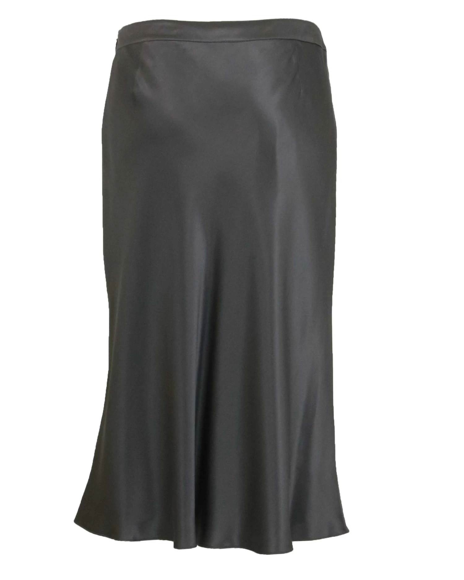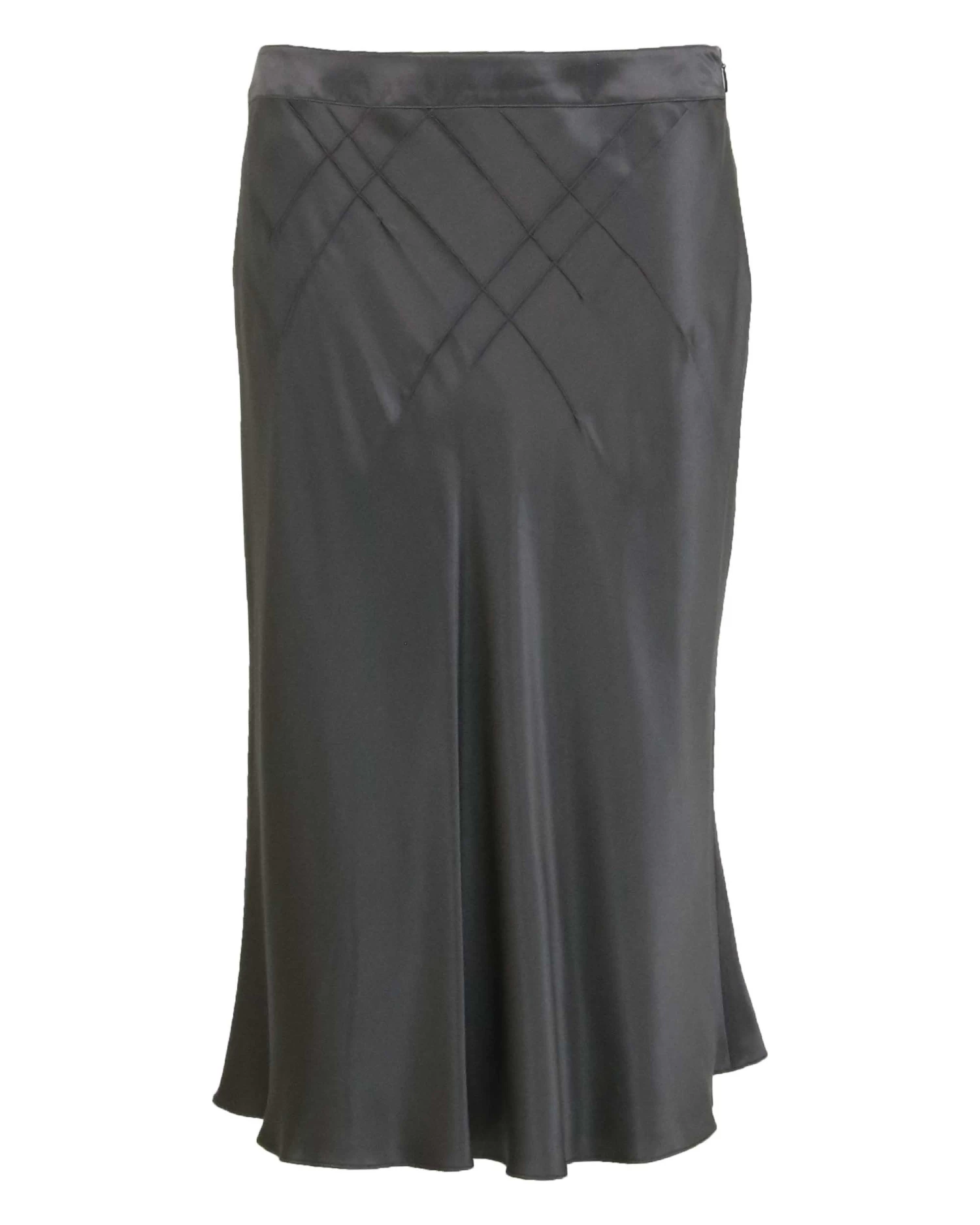 Een rok van Boss in een mat glanzende kwaliteit in een donkere taupe kleur. Onder de tailleband zijn meerdere diagonale stiknaden. De rok is gevoerd en mag niet worden gewassen.