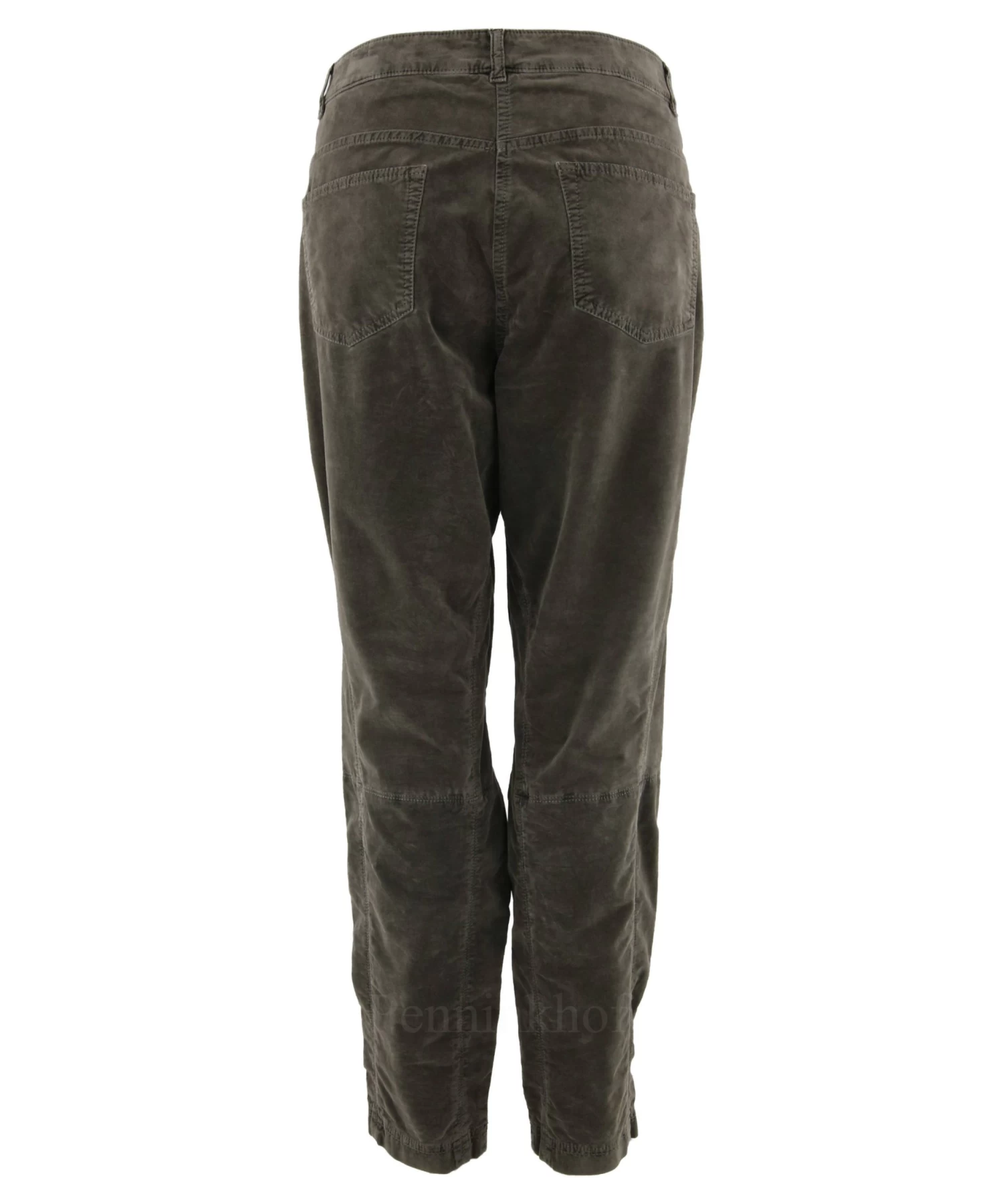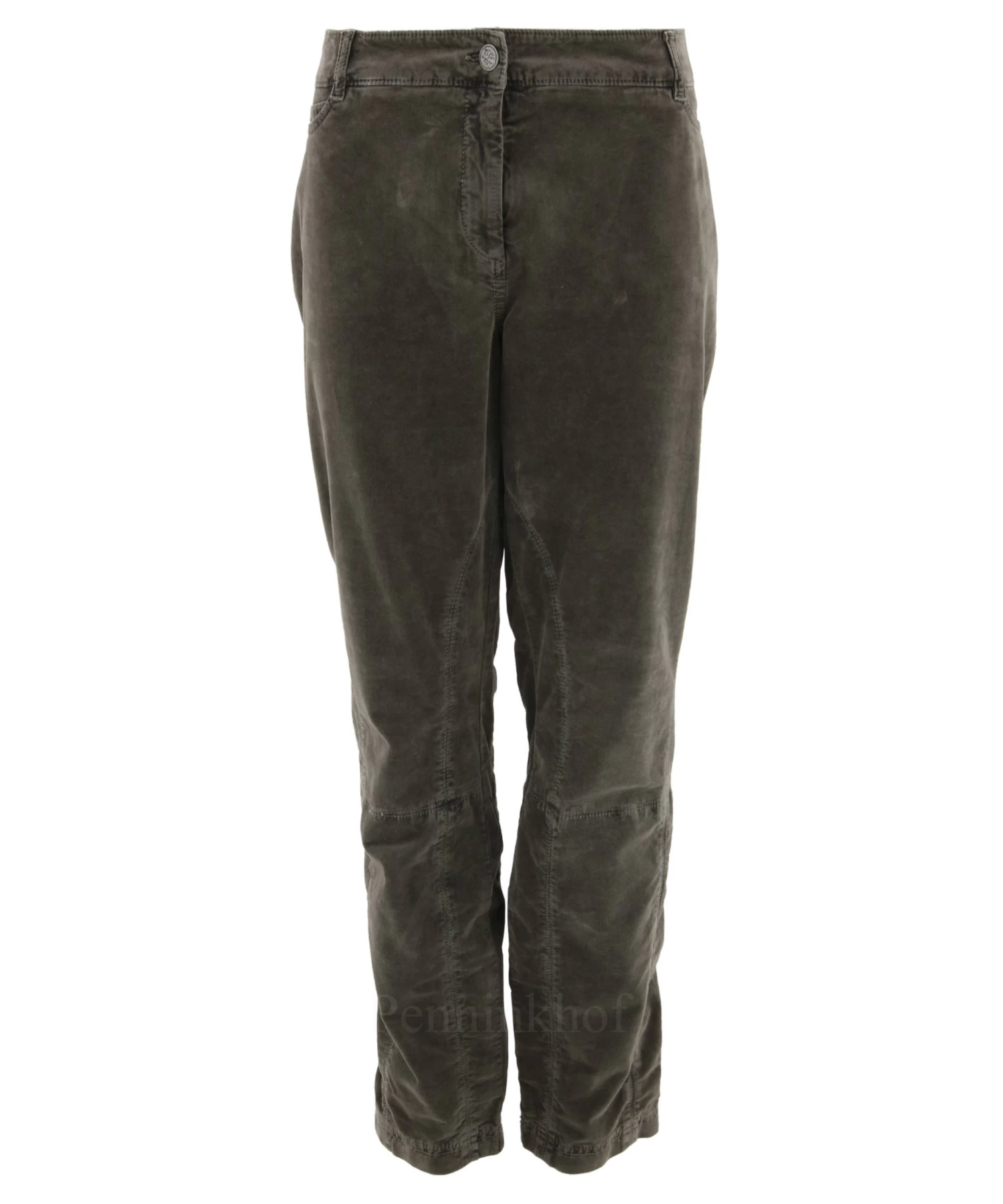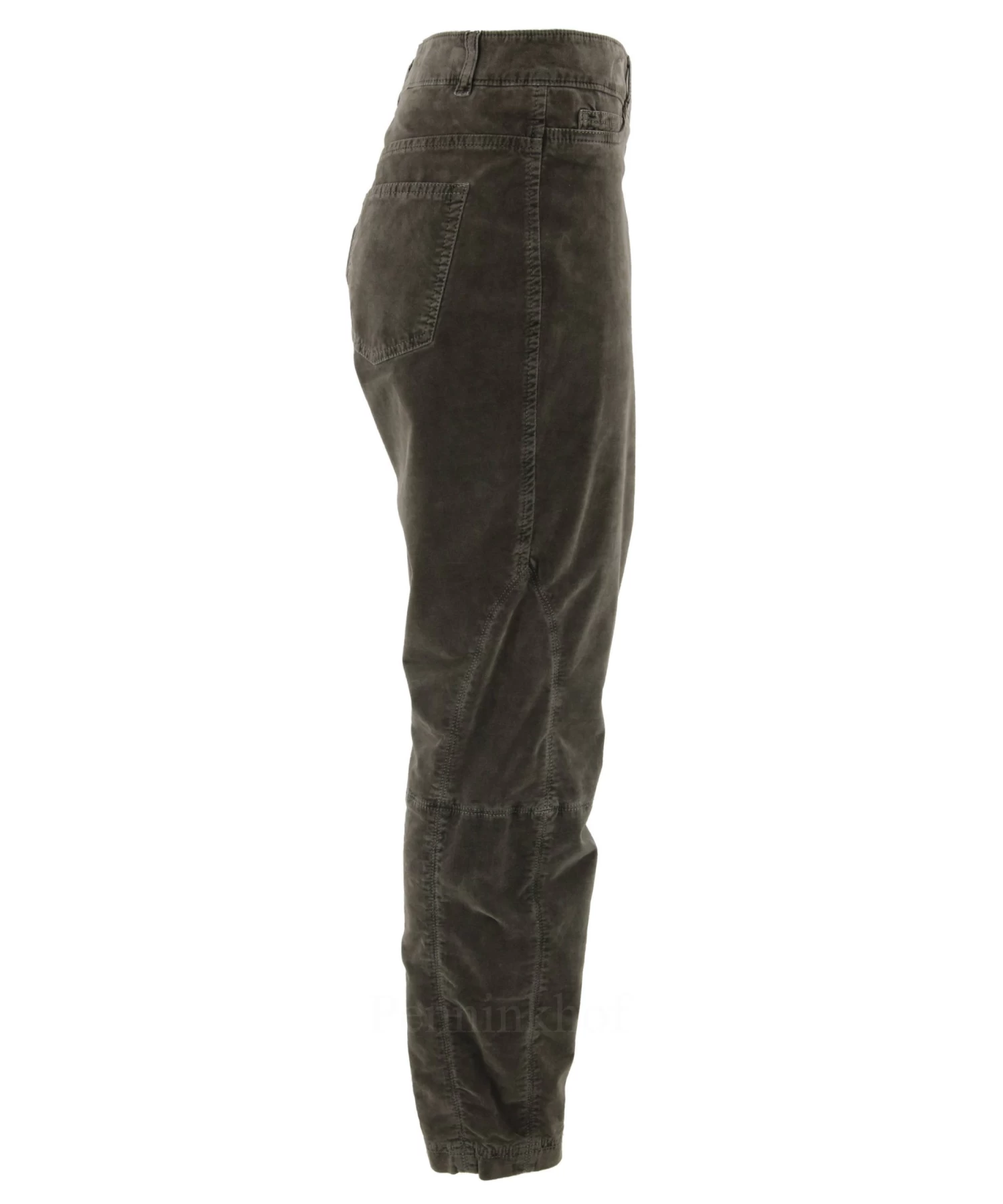 Een velour broek van Cambio in ee n donkere taupe kleur.De broek is in een 5 pocket model. Onder de knie is een horizontale stiknaad. deze broek mag op 30 graden worden gewassen.