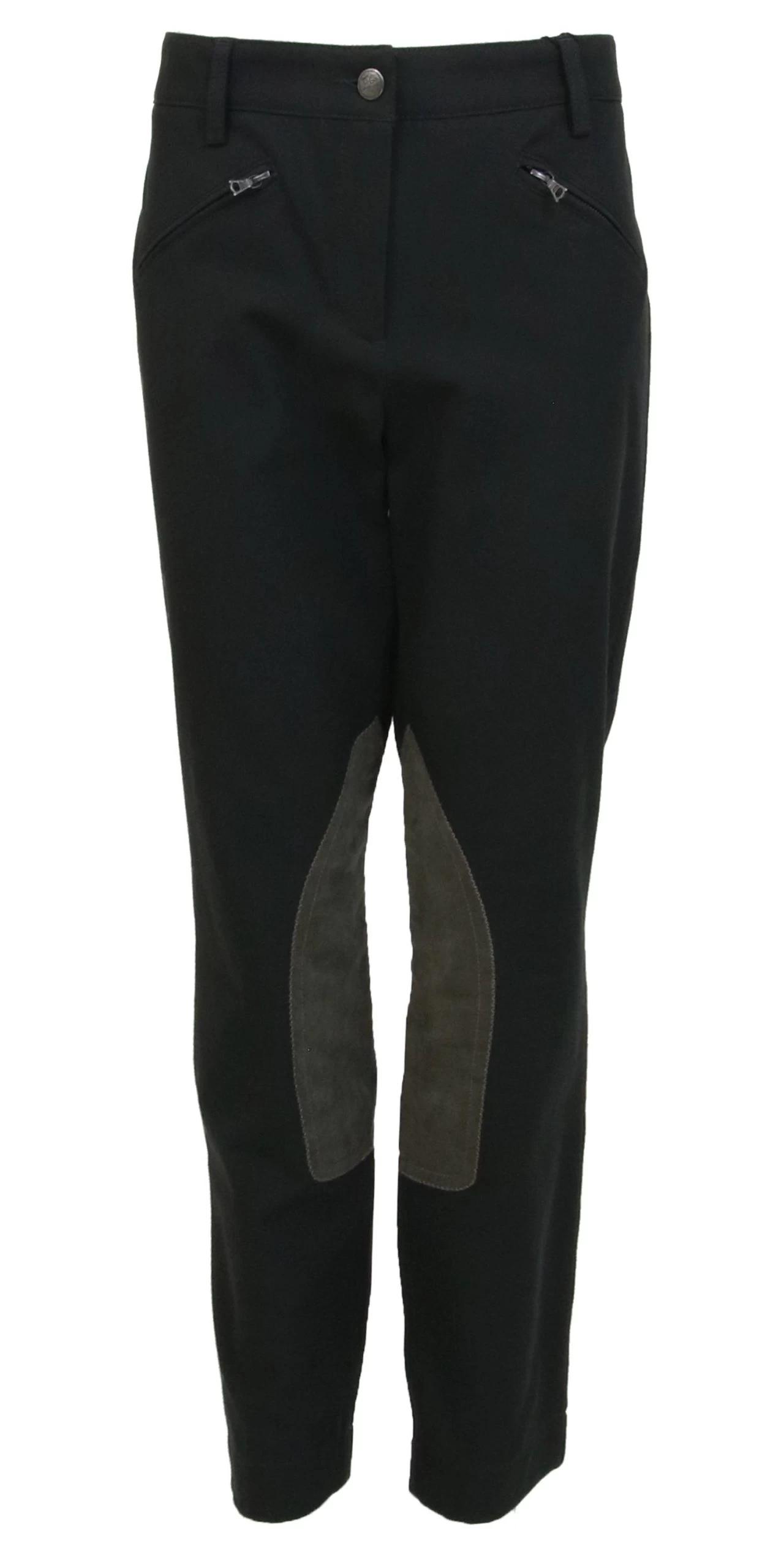 Een paardrijbroek van Cambio in de kleur antraciet met een taupe kleurig stuk suède bij de knieën. De zakken hebben een ritssluiting. Deze broek mag op 30 graden worden gewassen.