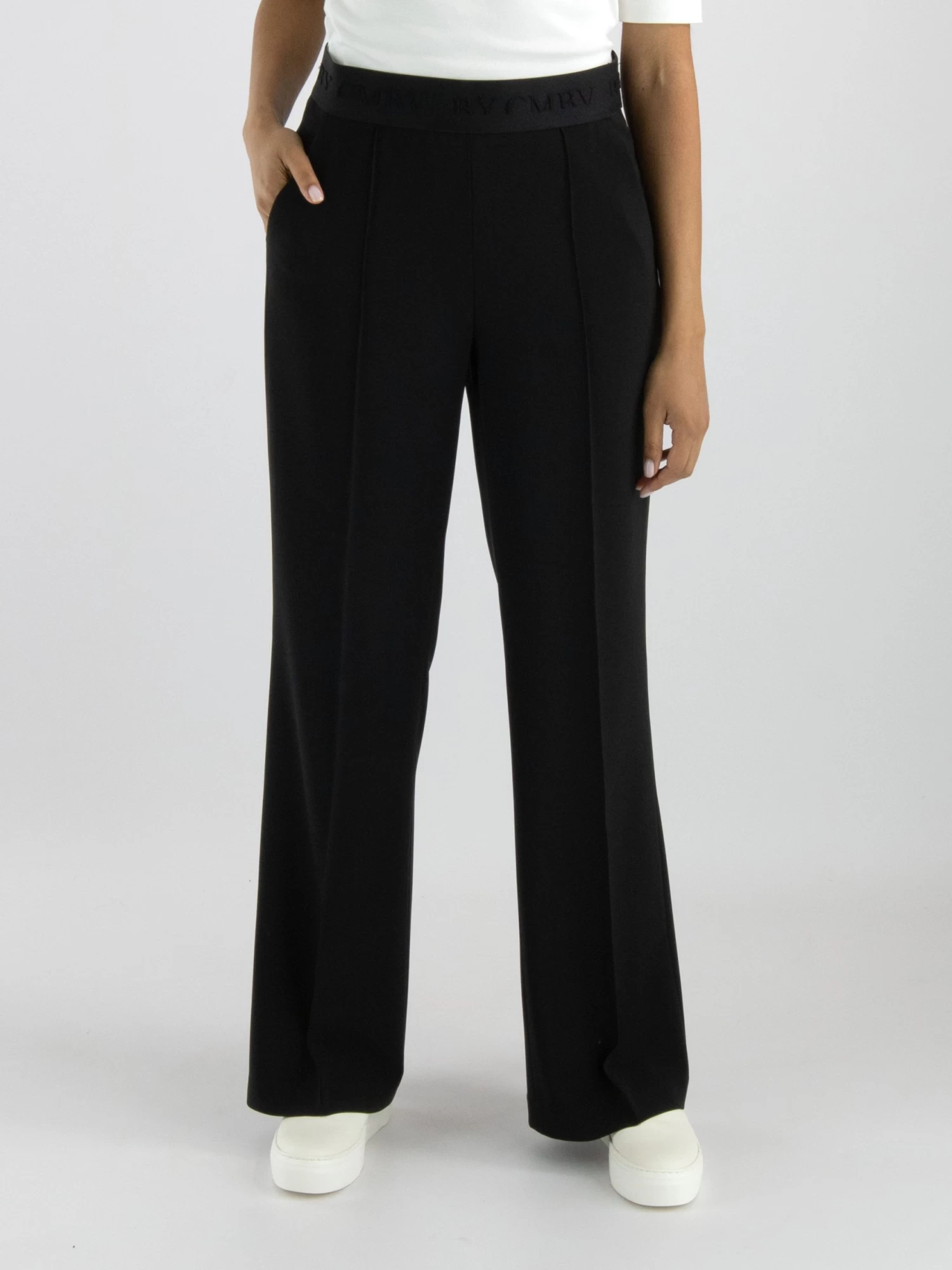 Een broek van Cambio in de kleur zwart. In de taille is een elastieken band. De broek heeft een recht gesneden pijp en in het midden van de pijpen is een doorgestikte naad. De broek heeft steekzakken en mag op 30 graden worden gewassen.
