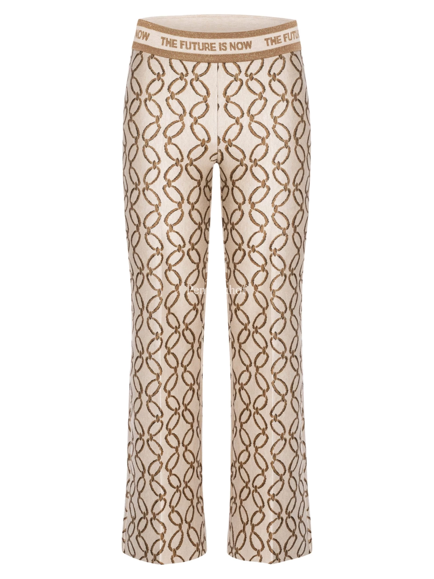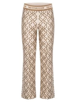 Een broek van Cambio in een schakelketting print met de kleuren taupe en donkerbruin op een beige achtergrond. Door de stof is een gouddraad geweven. In de taille is een elastieken band. Deze broek mag op de hand worden gewassen.