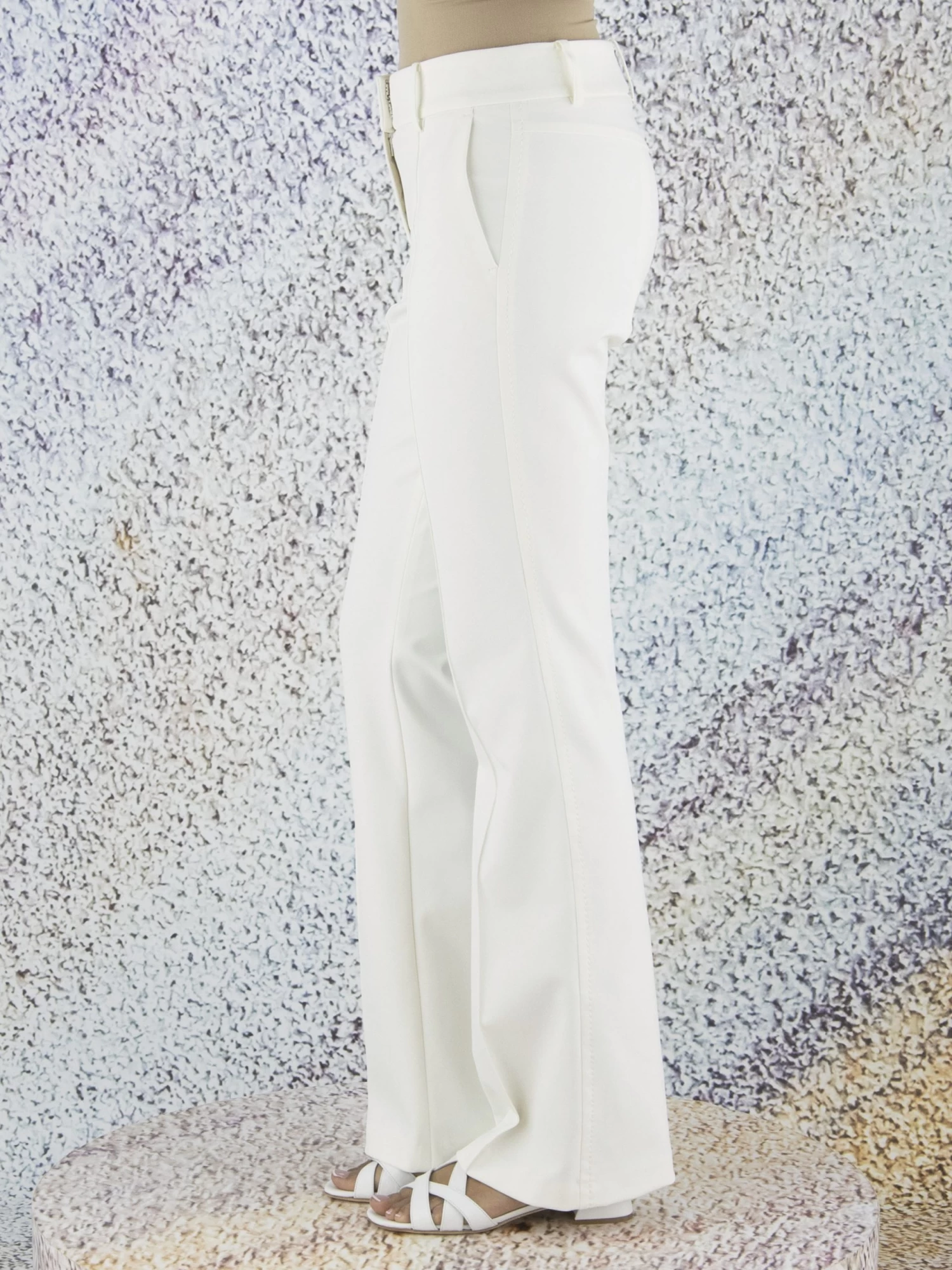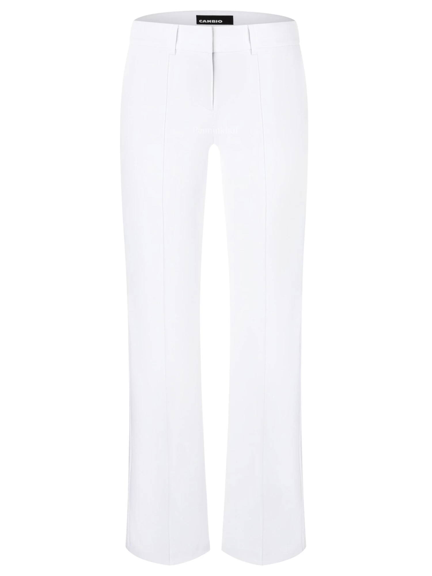 Een flared broek van Cambio in de kleur wit. Aan de zijkanten is een decoratieve doorgestikte naad. In het midden van de pijpen is een stiknaad. De broek heeft steekzakken en mag op 30 graden worden gewassen.
