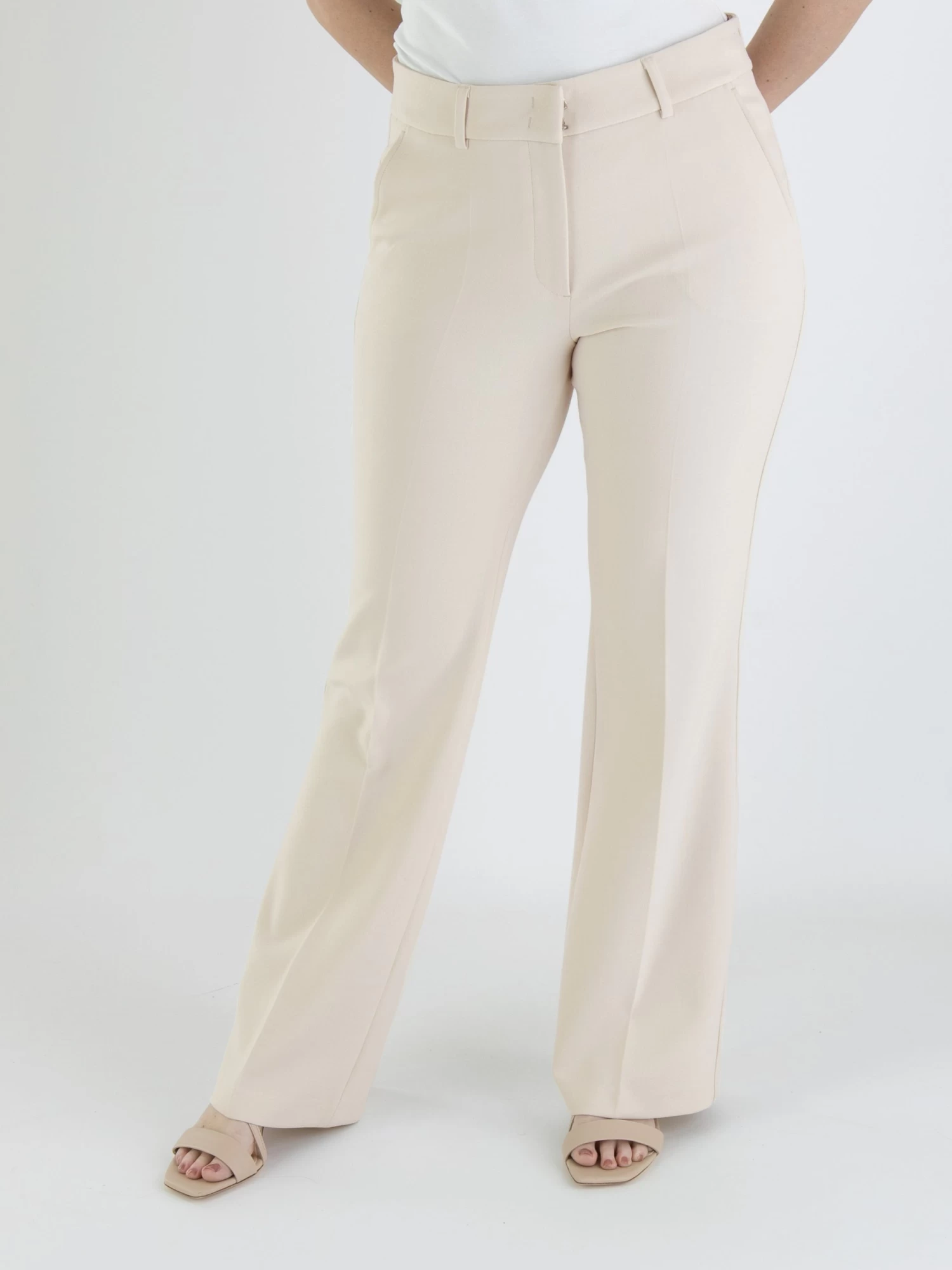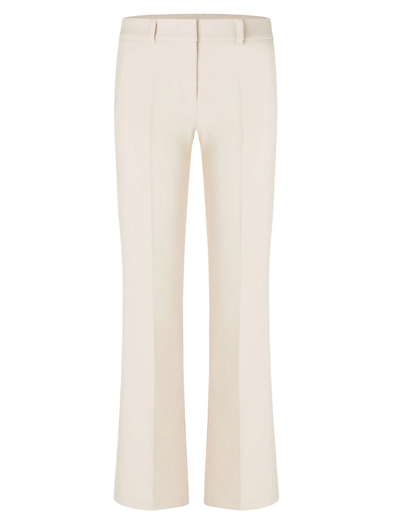 Een broek van Cambio in een beige kleur. Langs de zijkanten van de pijpen is een decoratieve stiknaad. De broek heeft steekzakken en mag op 30 graden worden gewassen.