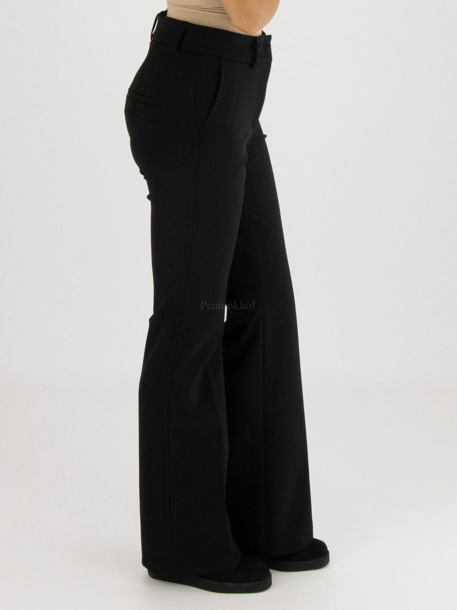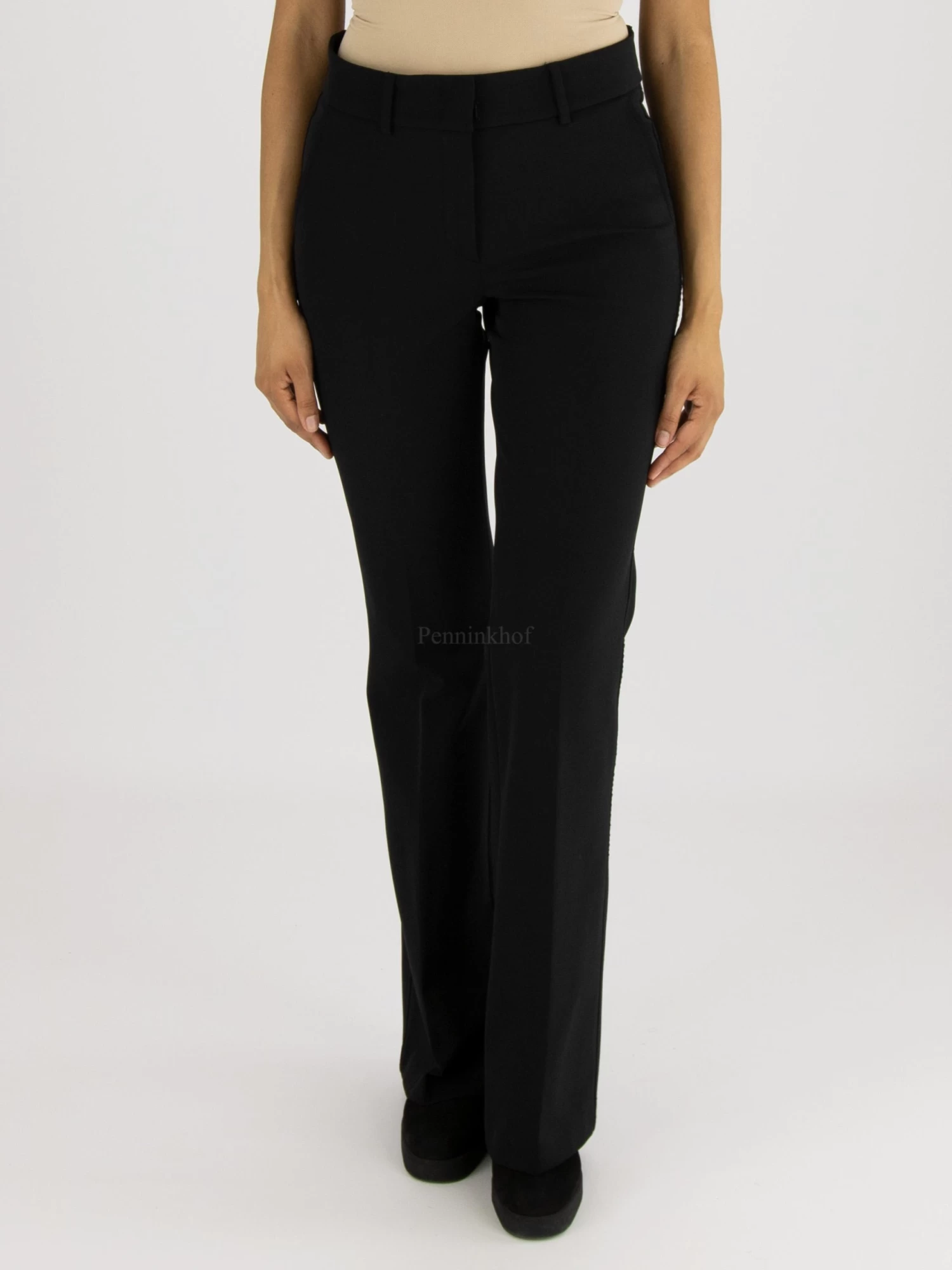 Een flared broek van Cambio in de kleur zwart. In de taille is een elastieken band. Over het midden van de pijpen is een ingestreken stiknaad. Deze broek mag op de hand worden gewassen.