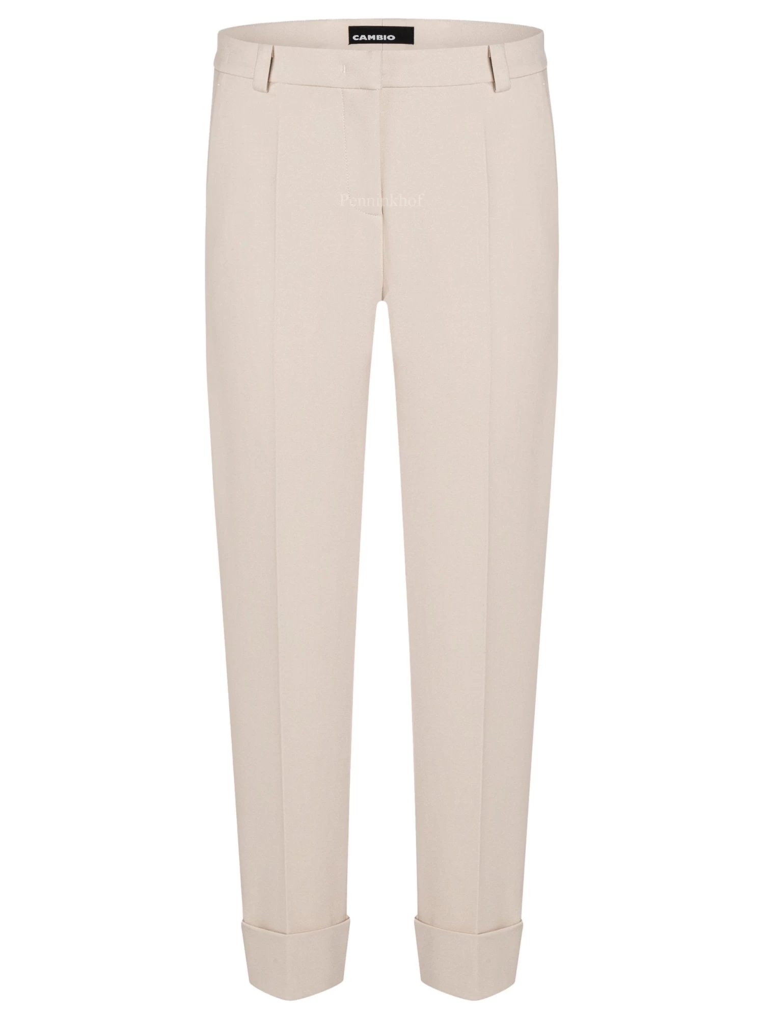 Een broek van Cambio in de kleur roomwit. De broek heeft steekzakken en in het midden van de pijpen is een ingestreken plooi. Aan de onderkant is een brede omslag. Deze broek mag op 30 graden worden gewassen.