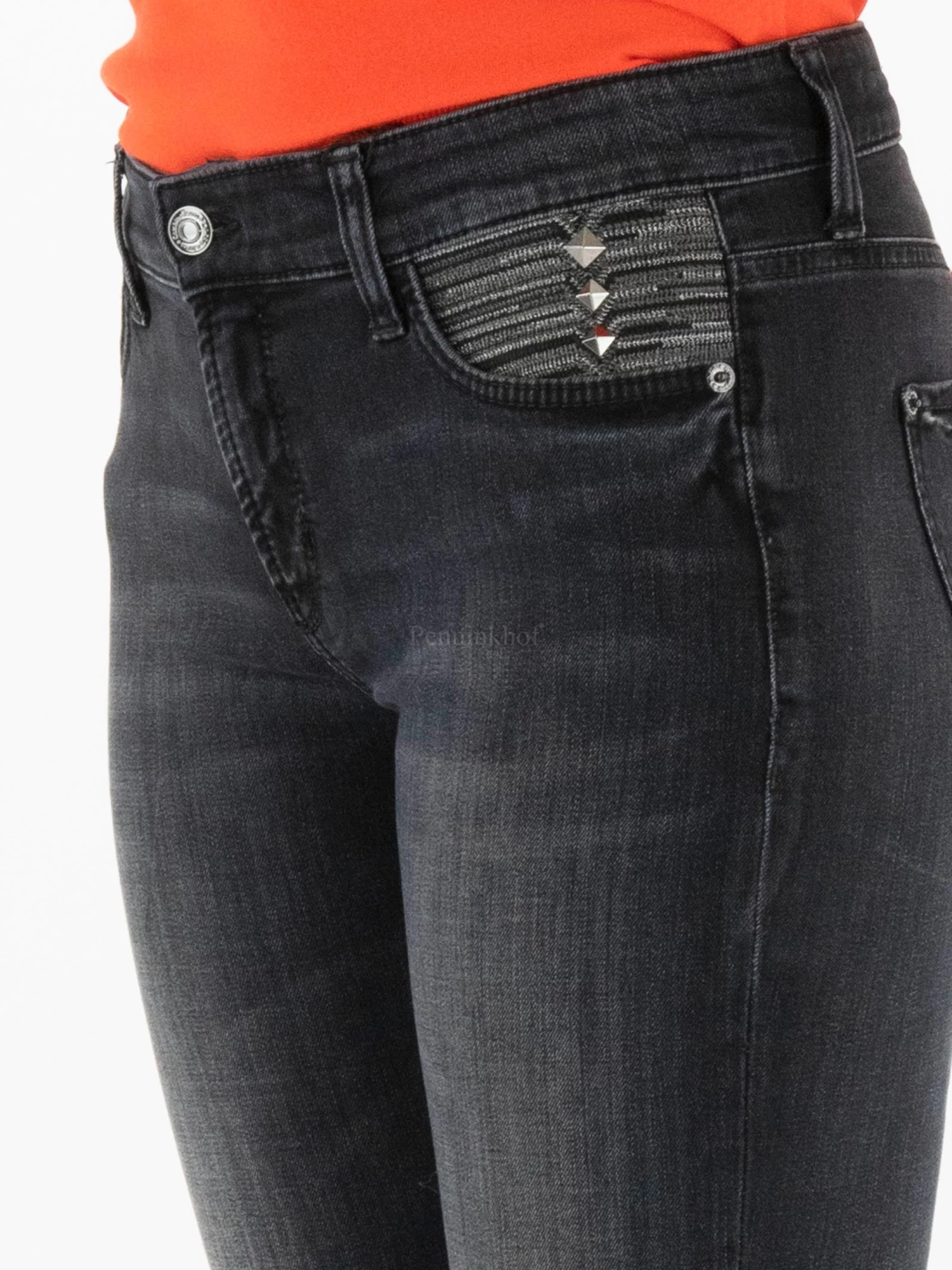 Een jeans van Cambio in de kleur zwart. De jeans is in een 5 pocket model en bij de linker zak zijn enkele decoratieve studs. Deze jeans mag op 30 graden worden gewassen.