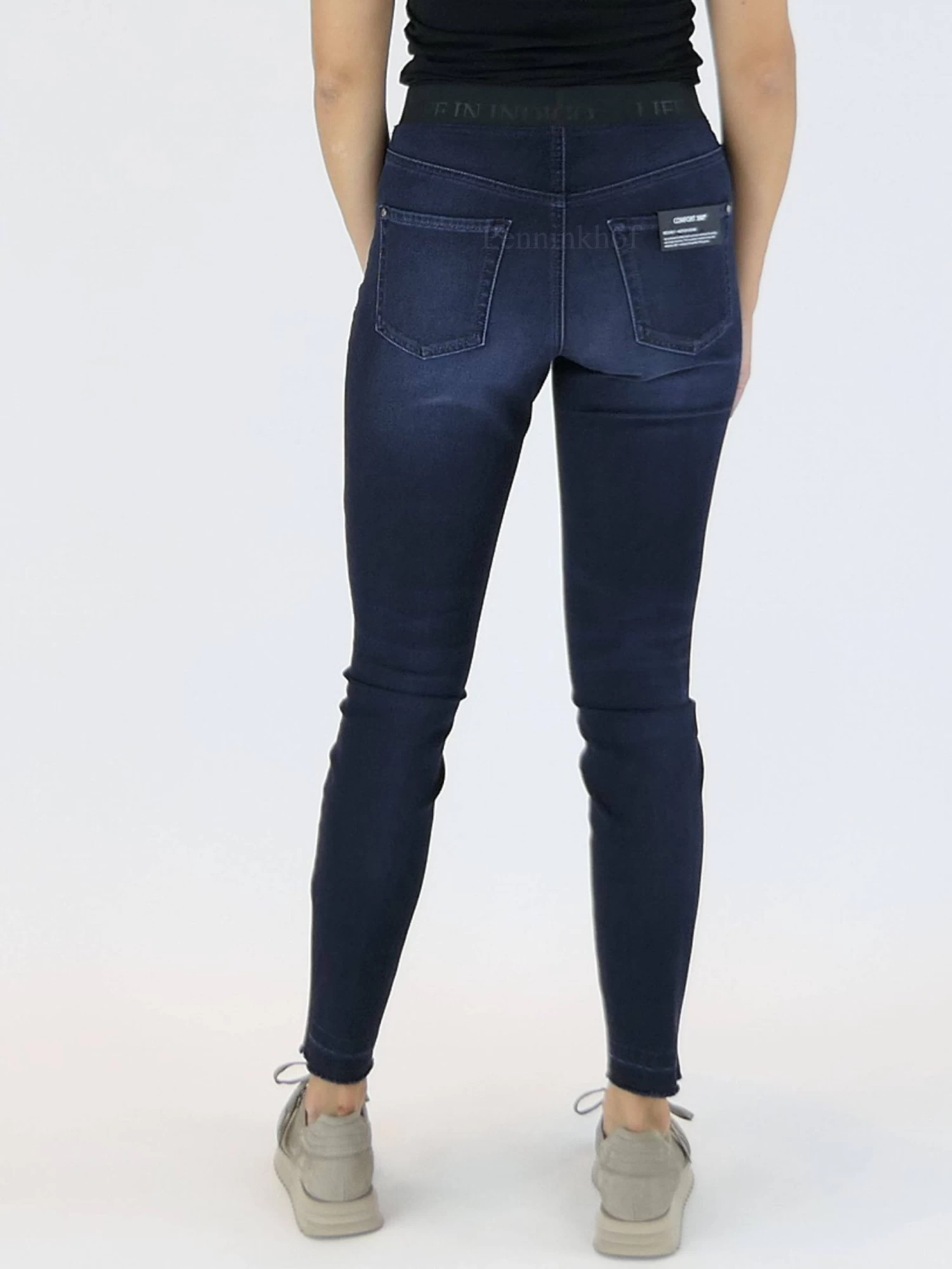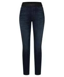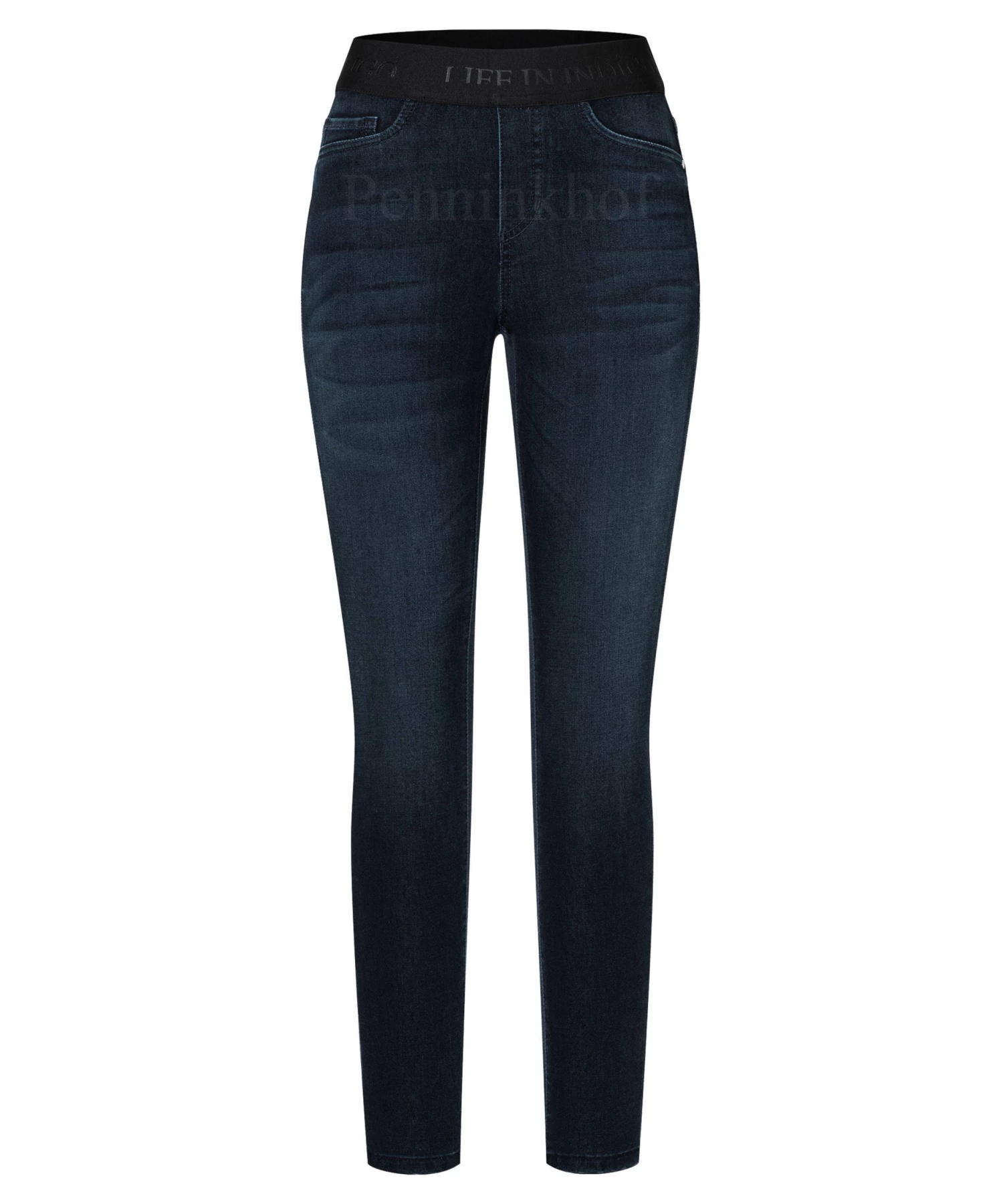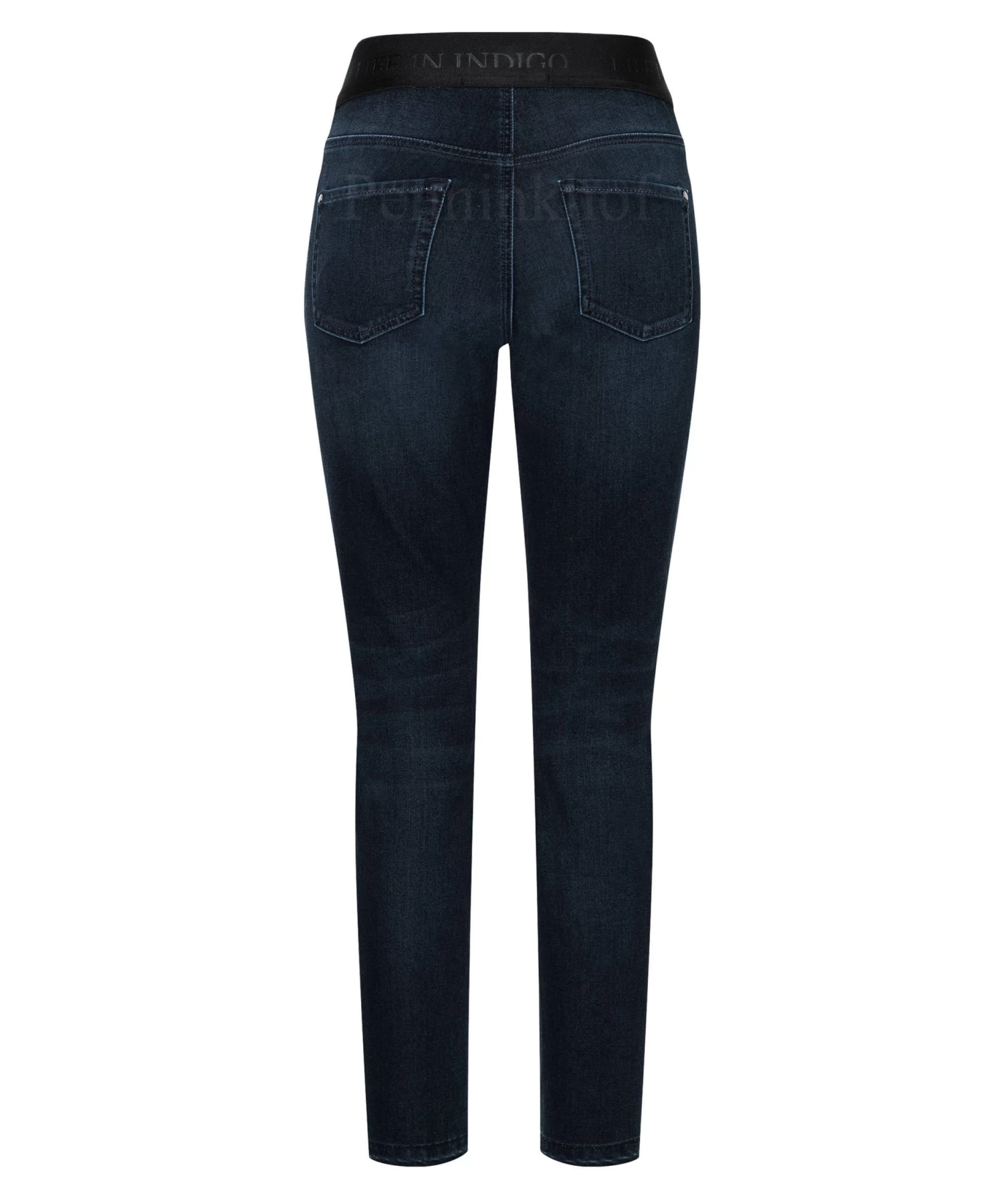 Een jeans van Cambio in een dark denim kleur. In de taille is een elastieken band. De jeans is in een 5 pocket model. Deze jeans mag op 30 graden worden gewassen.