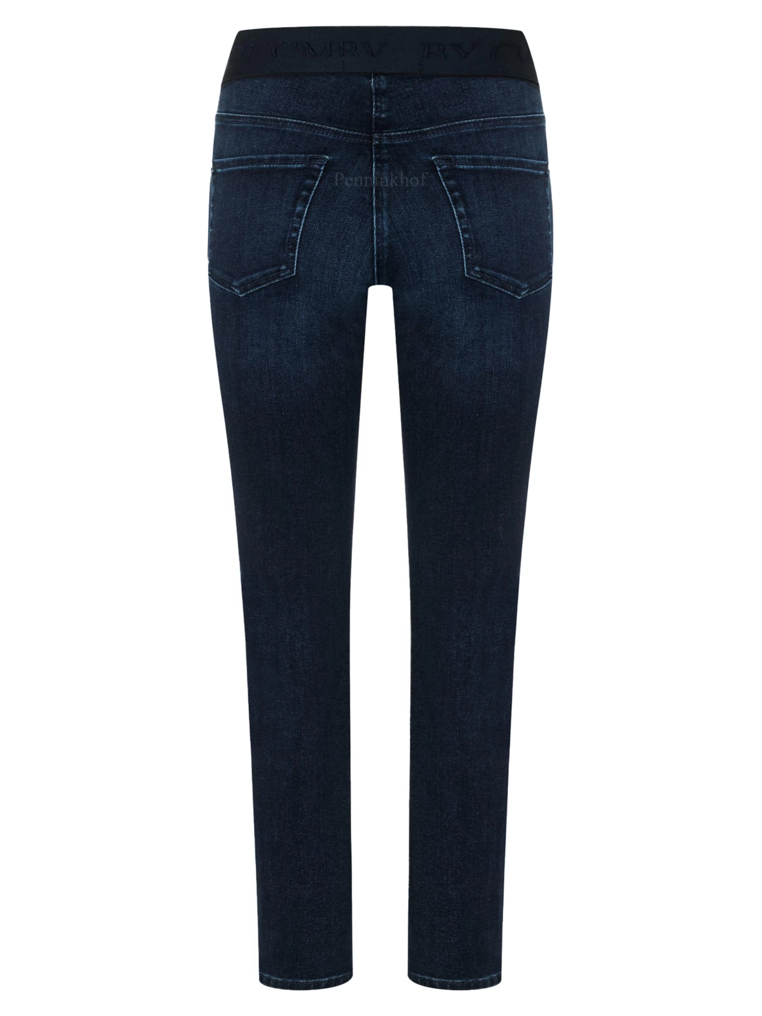 Een gewassen jeans van Cambio in de kleur dark blue. In de taille is een elastieken band. De jeans is in een 5 pocket model. Deze jeans mag op 30 graden worden gewassen.