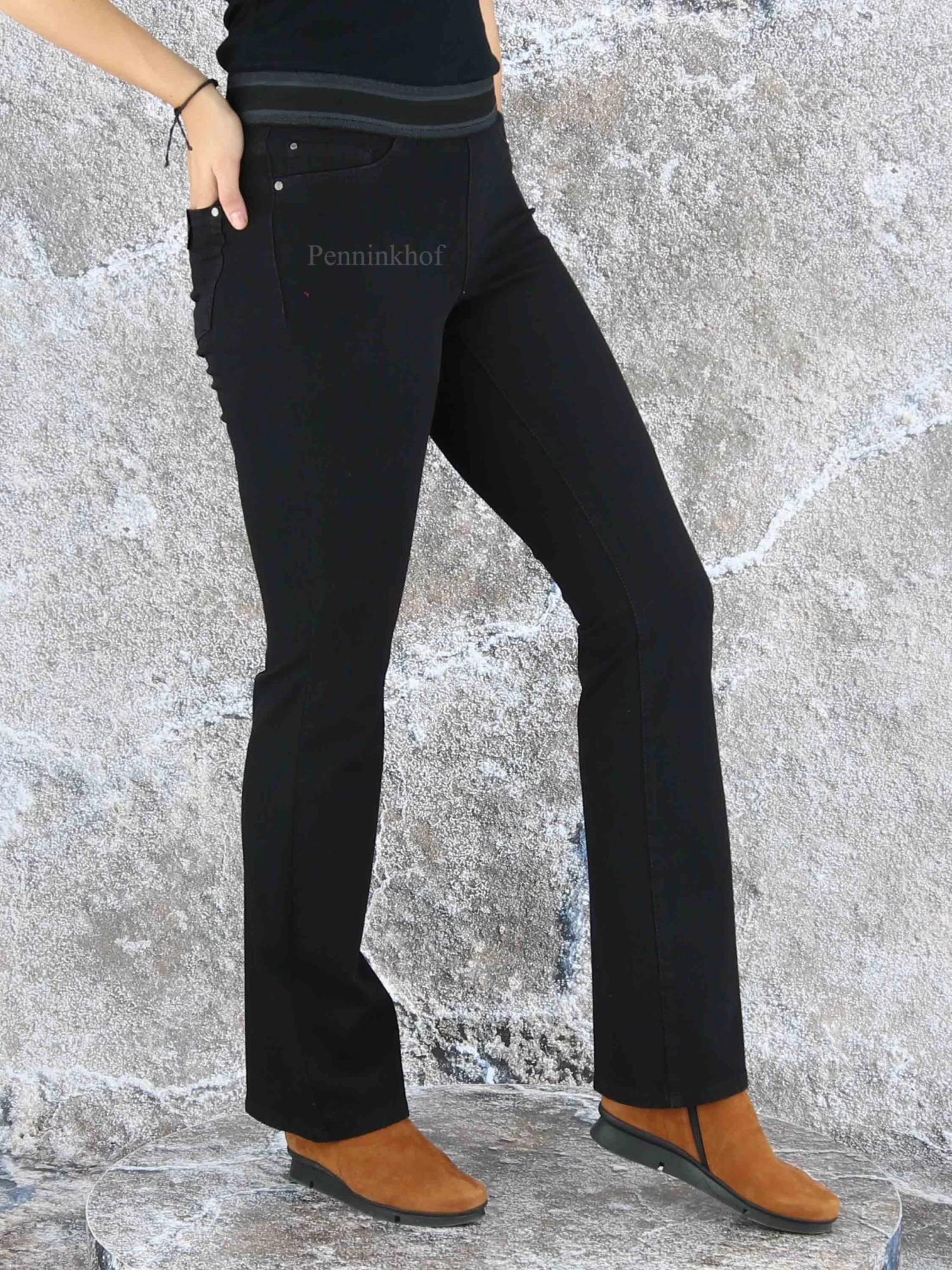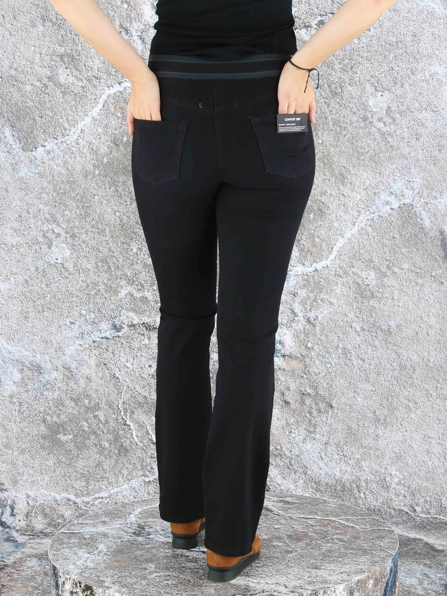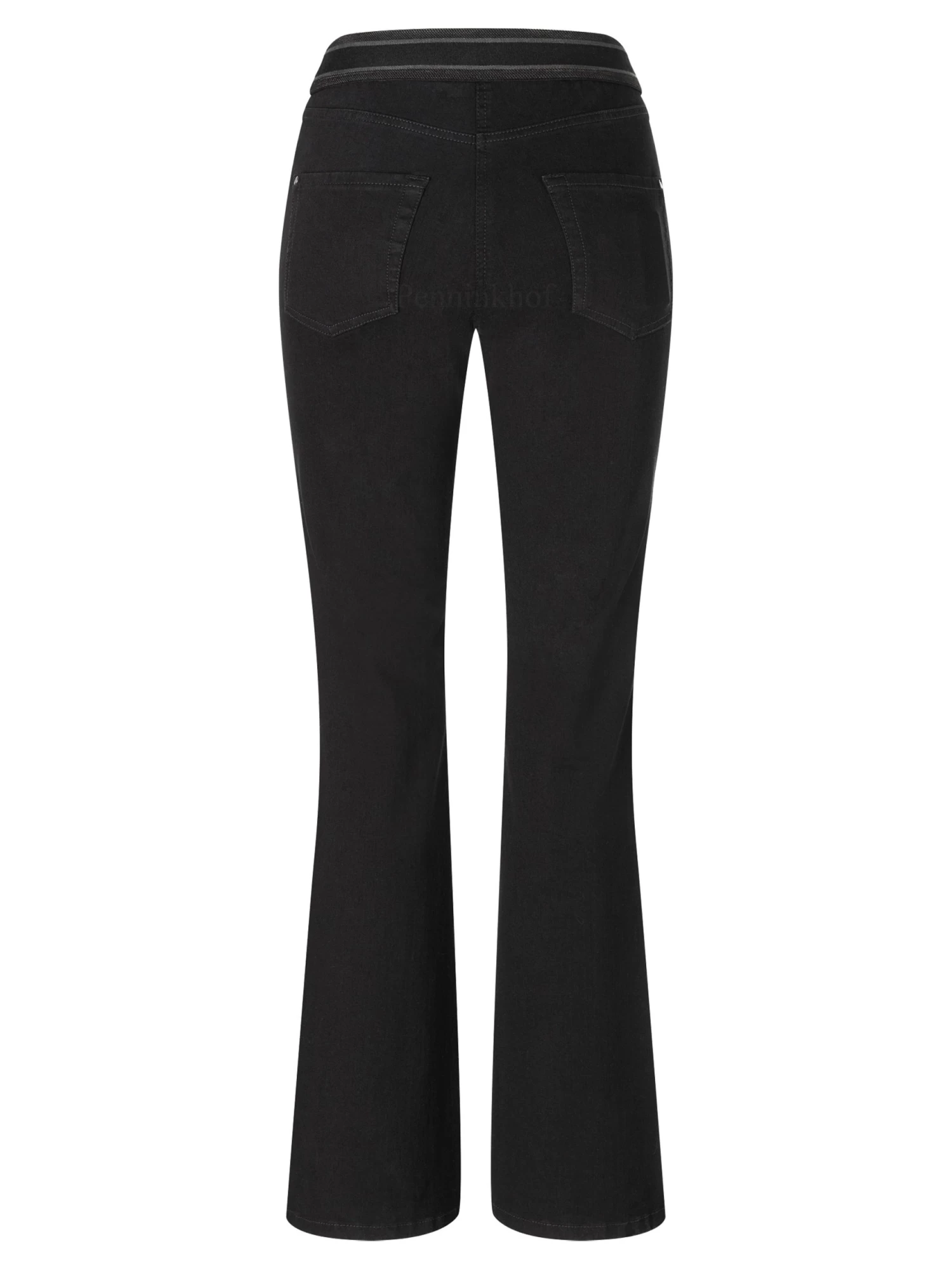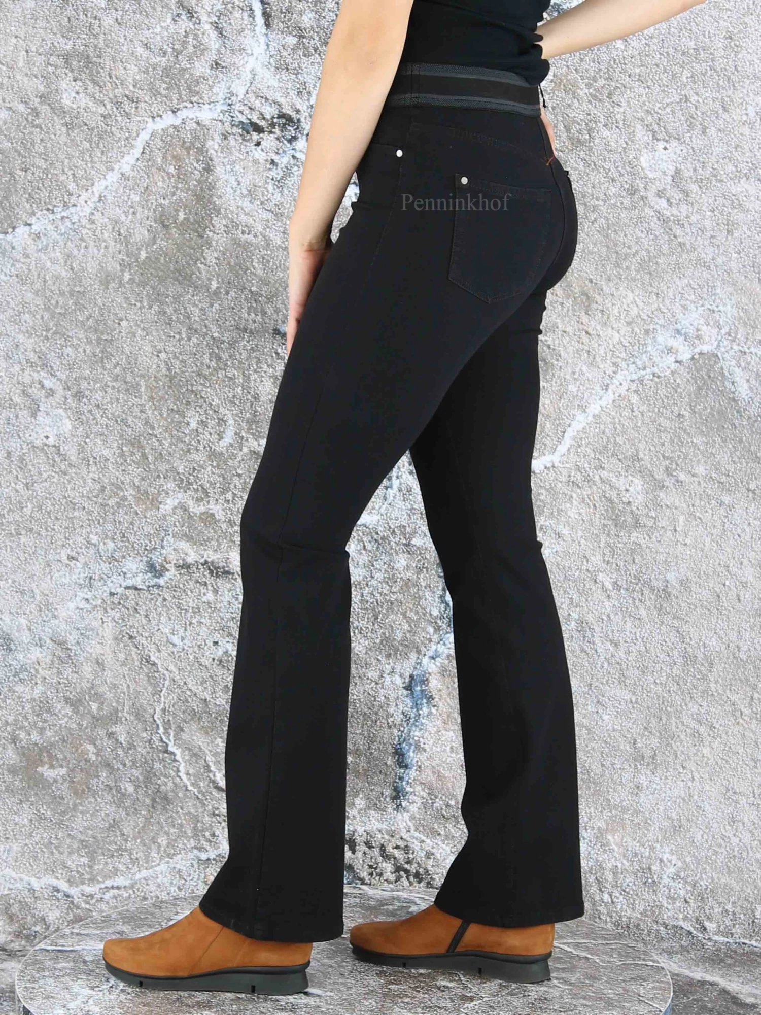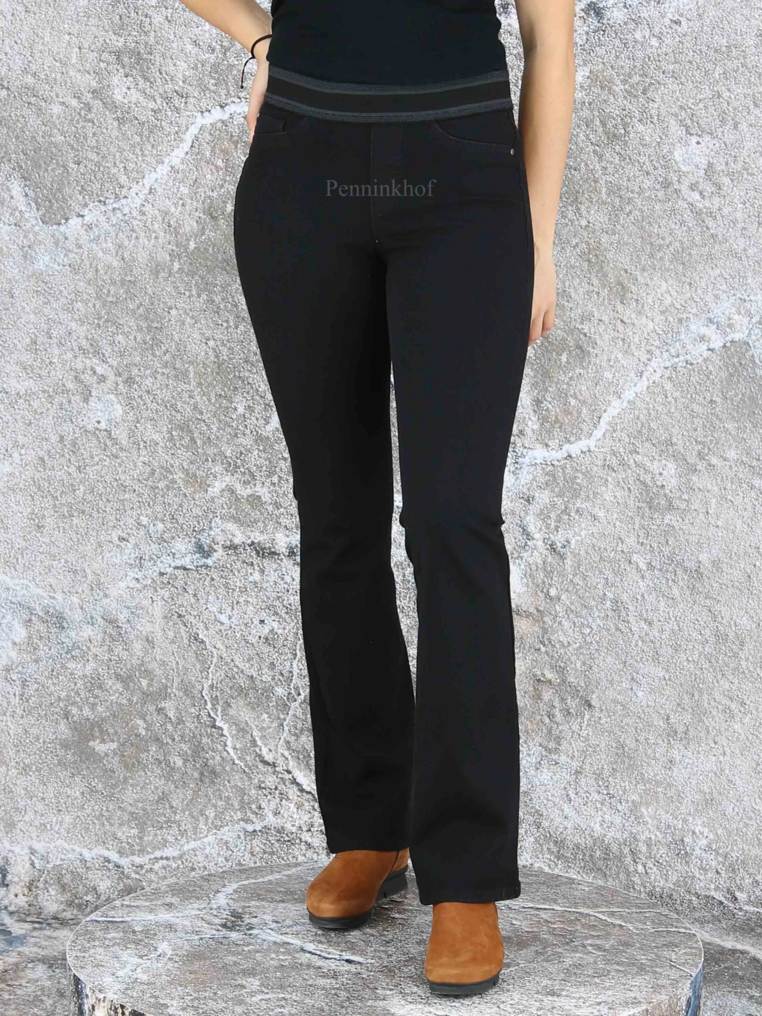 Een flared jeans van het merk Cambio in de kleur zwart. In de taille is een elastieken band. De jeans is in een 5 pocket model en mag op 30 graden worden gewassen.