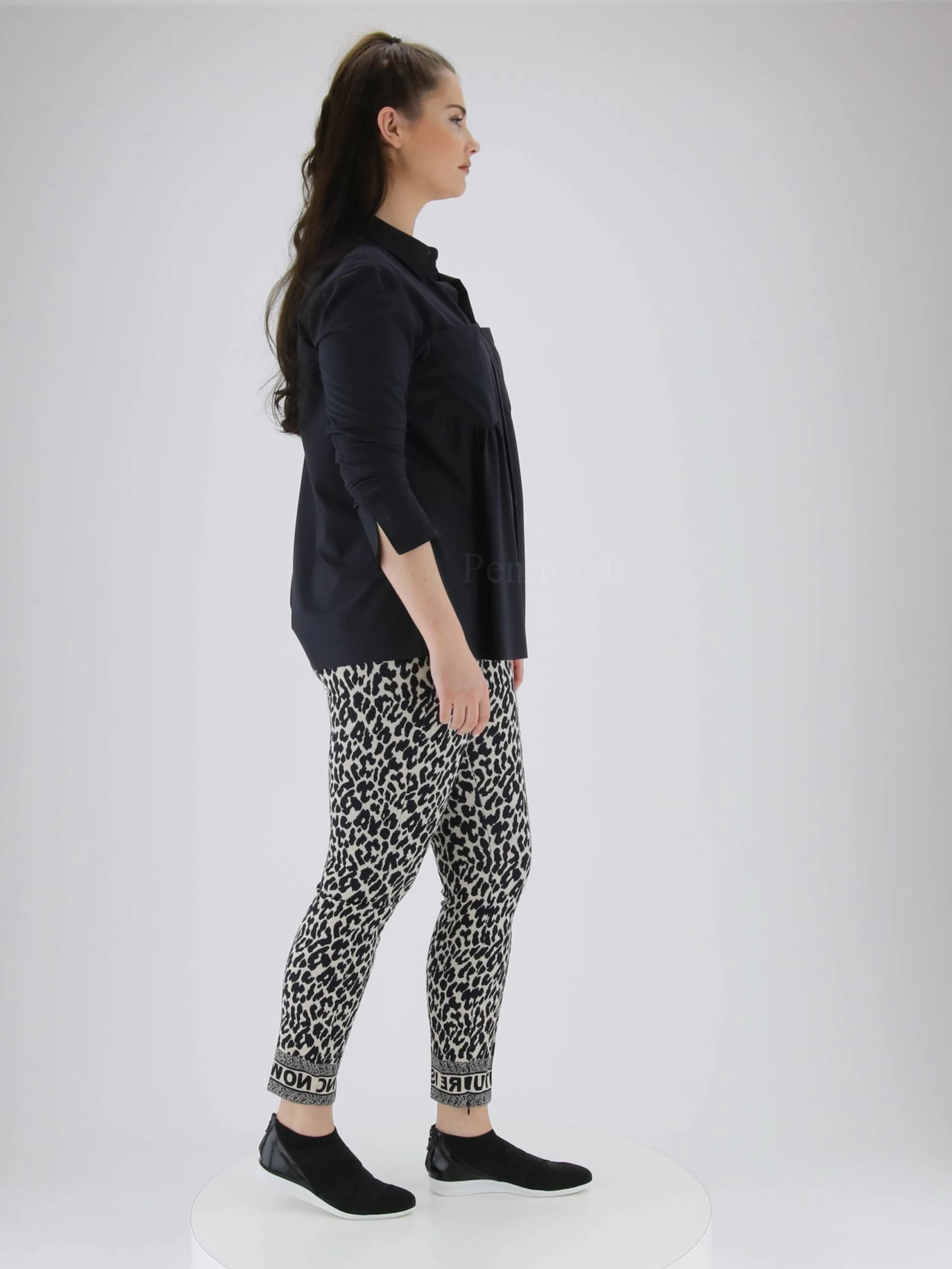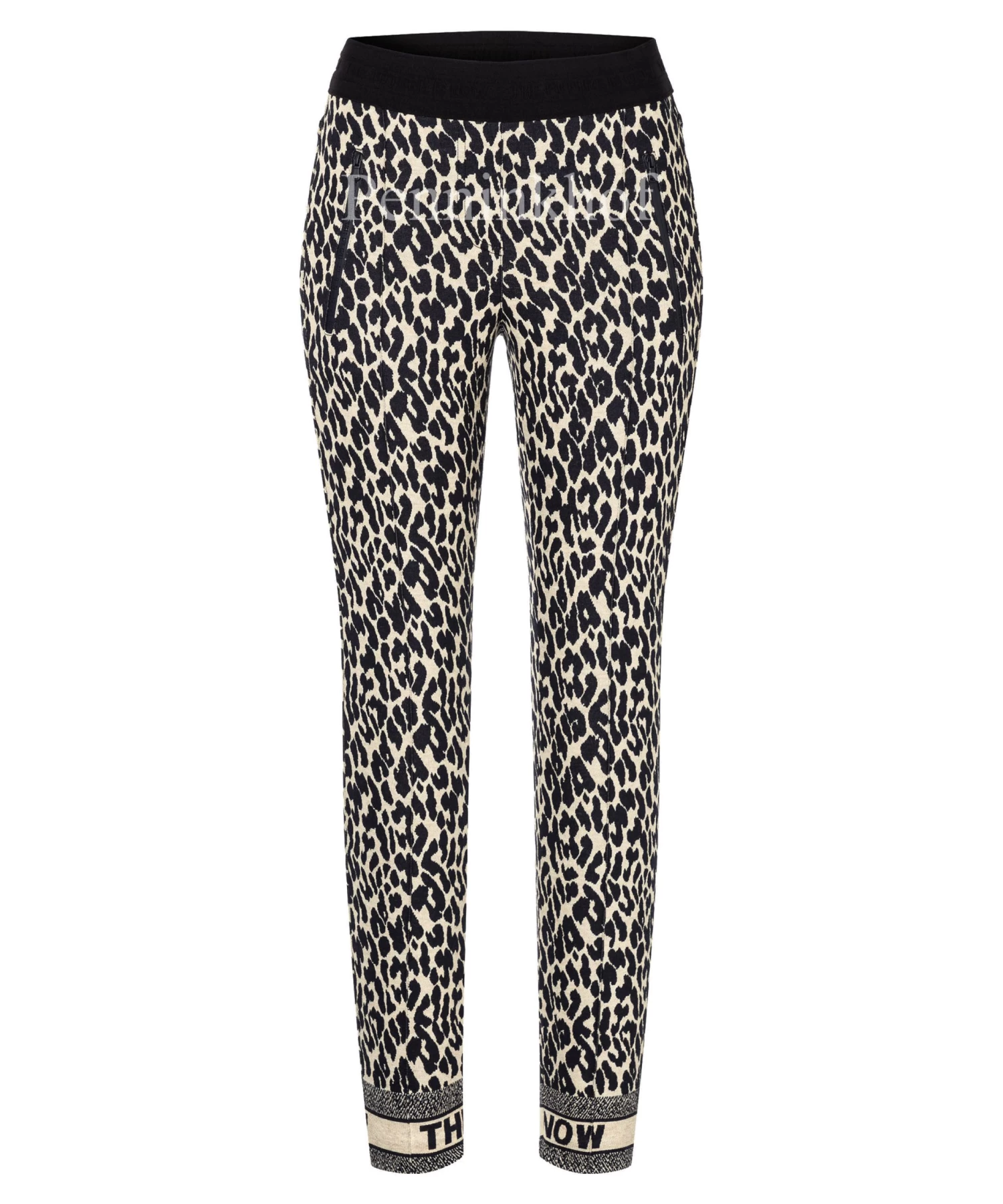 Een broek van Cambio in een panterprint met de kleuren zwart en beige. In de taille is een elastieken band. De zakken aan de voorzijde hebben een ritssluiting met een mat zwarte bies. Aan de onderkant van de pijpen is een geprinte boord met de tekst: now there is. Deze broek mag op de hand worden gewassen.