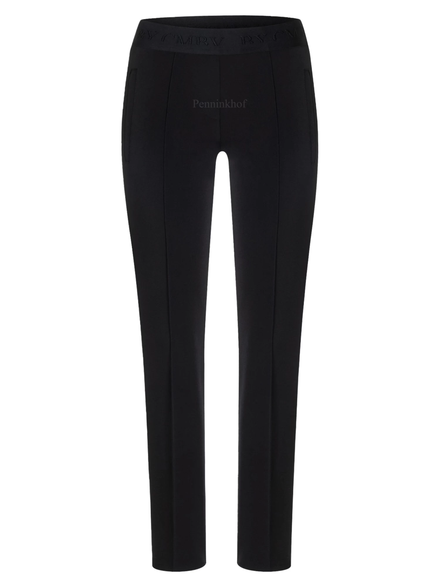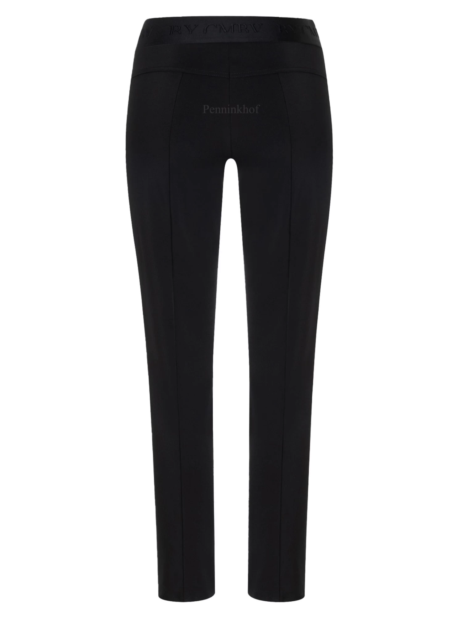 Broek van Cambio in de kleur zwart. In de taille zit een elastische band. In het midden van de pijpen zit een gestikte naad. De zakken aan de voorkant hebben een ritssluiting. Deze broek mag op 30 graden gewassen worden.