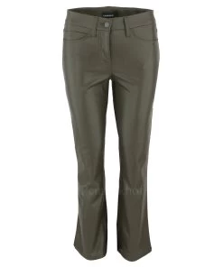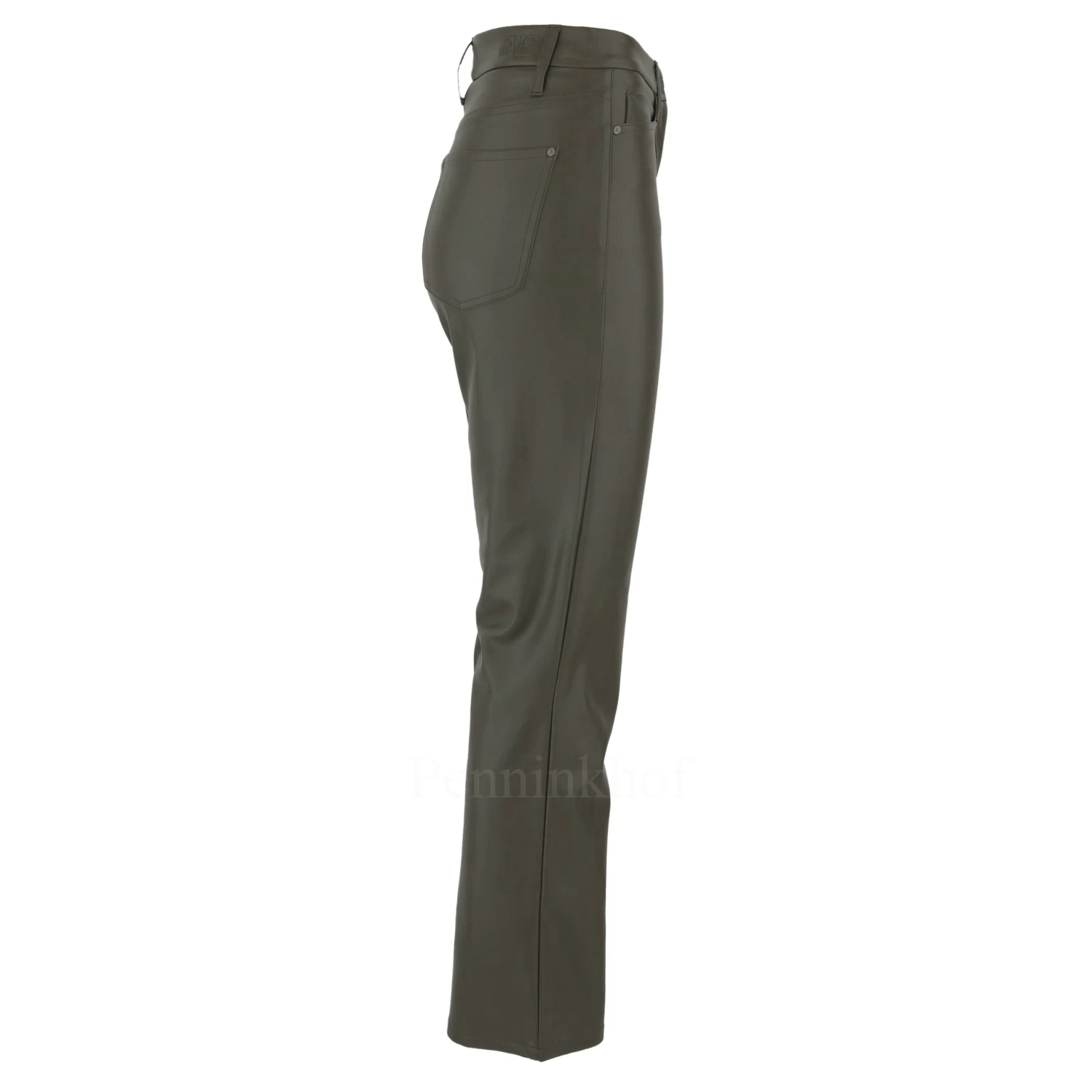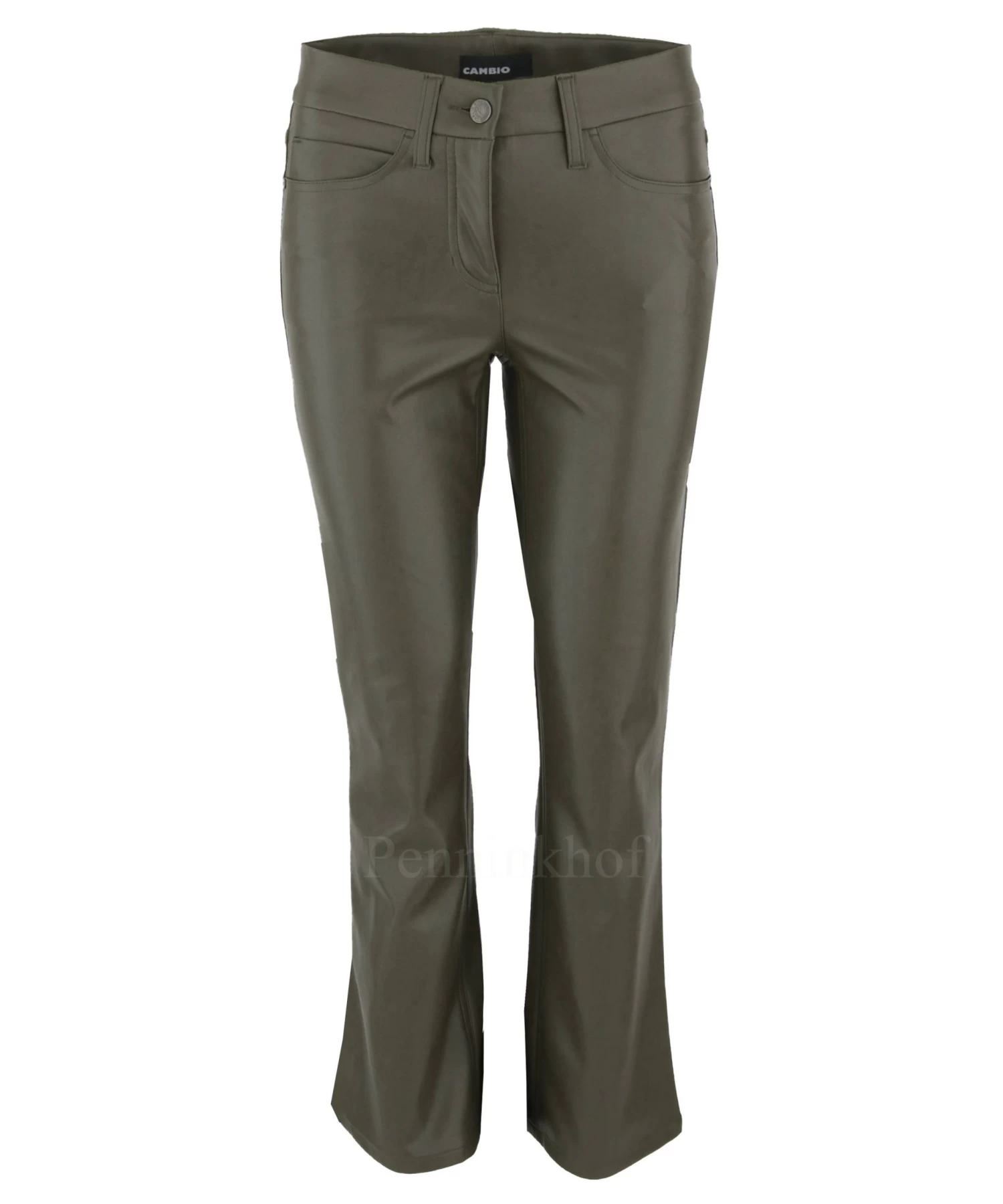 Een imitatie lederen broek van Cambio in de kleur olijfgroen. De broek is in een 5 pocket model en de pijpen zijn recht gesneden. Deze broek mag op de hand worden gewassen.