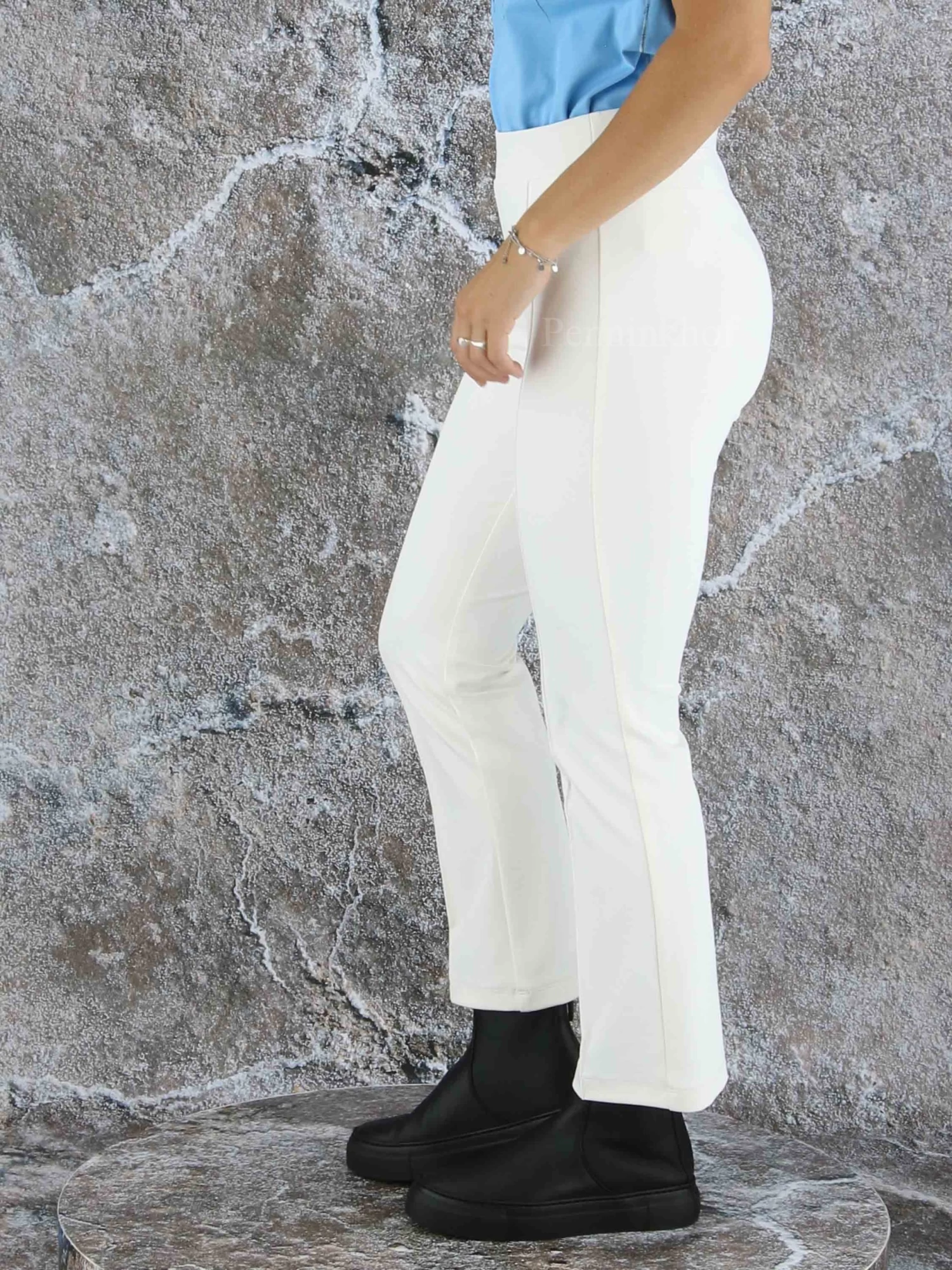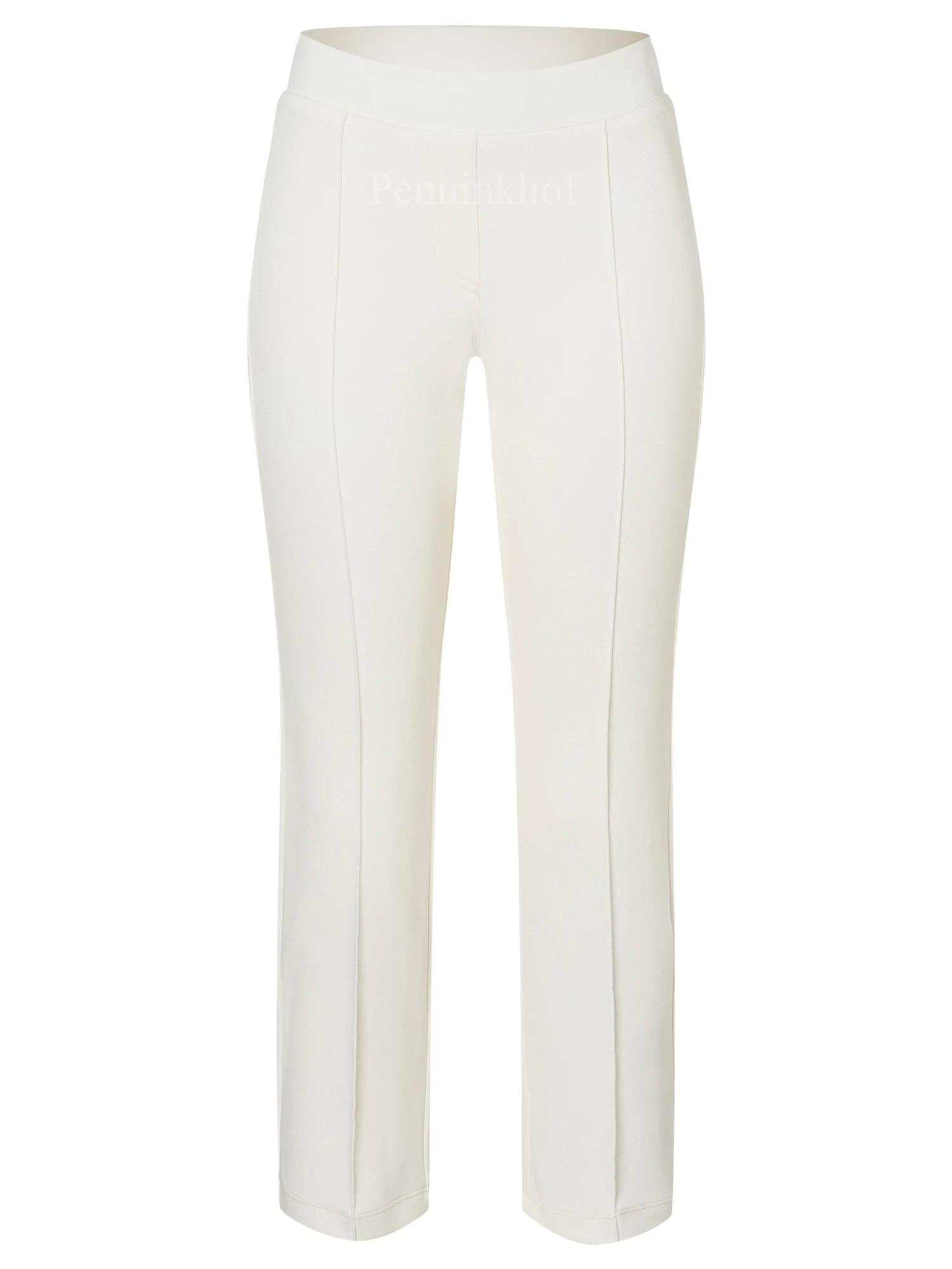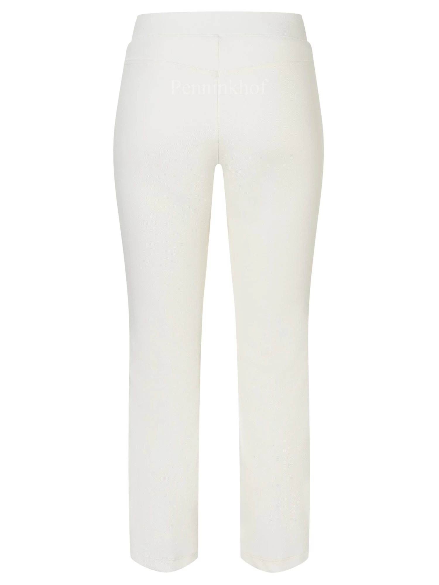 Een broek van Cambio in een roomwitte kleur. In de taille is een elastieken band Over het midden van de pijpen is een stiknaad. Deze broek mag op de hand worden gewassen.