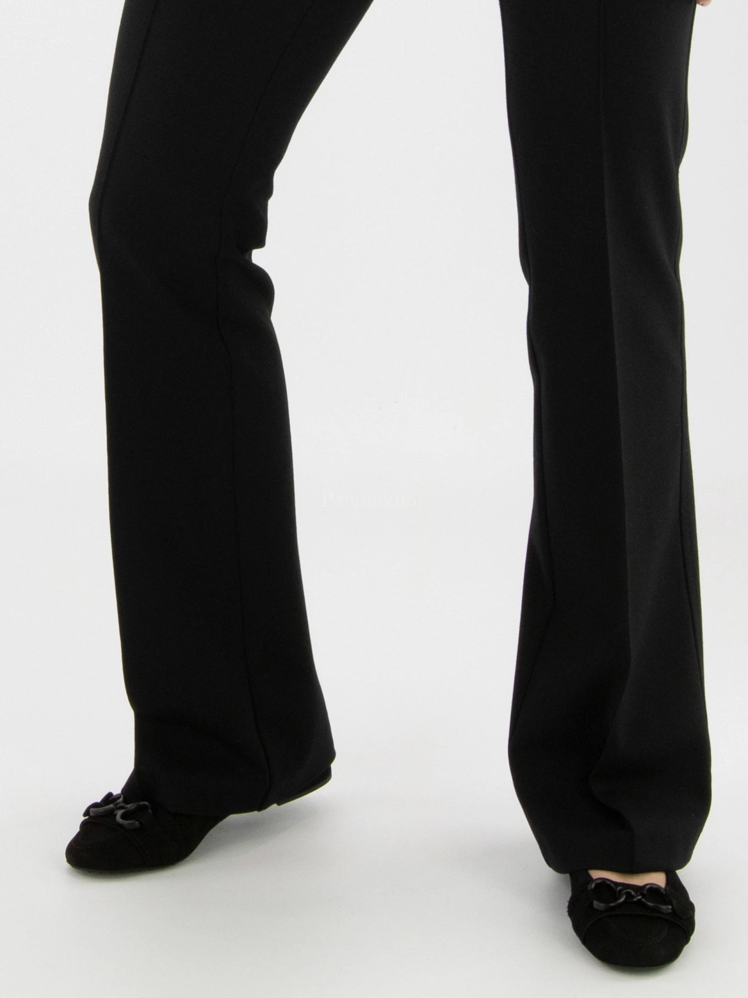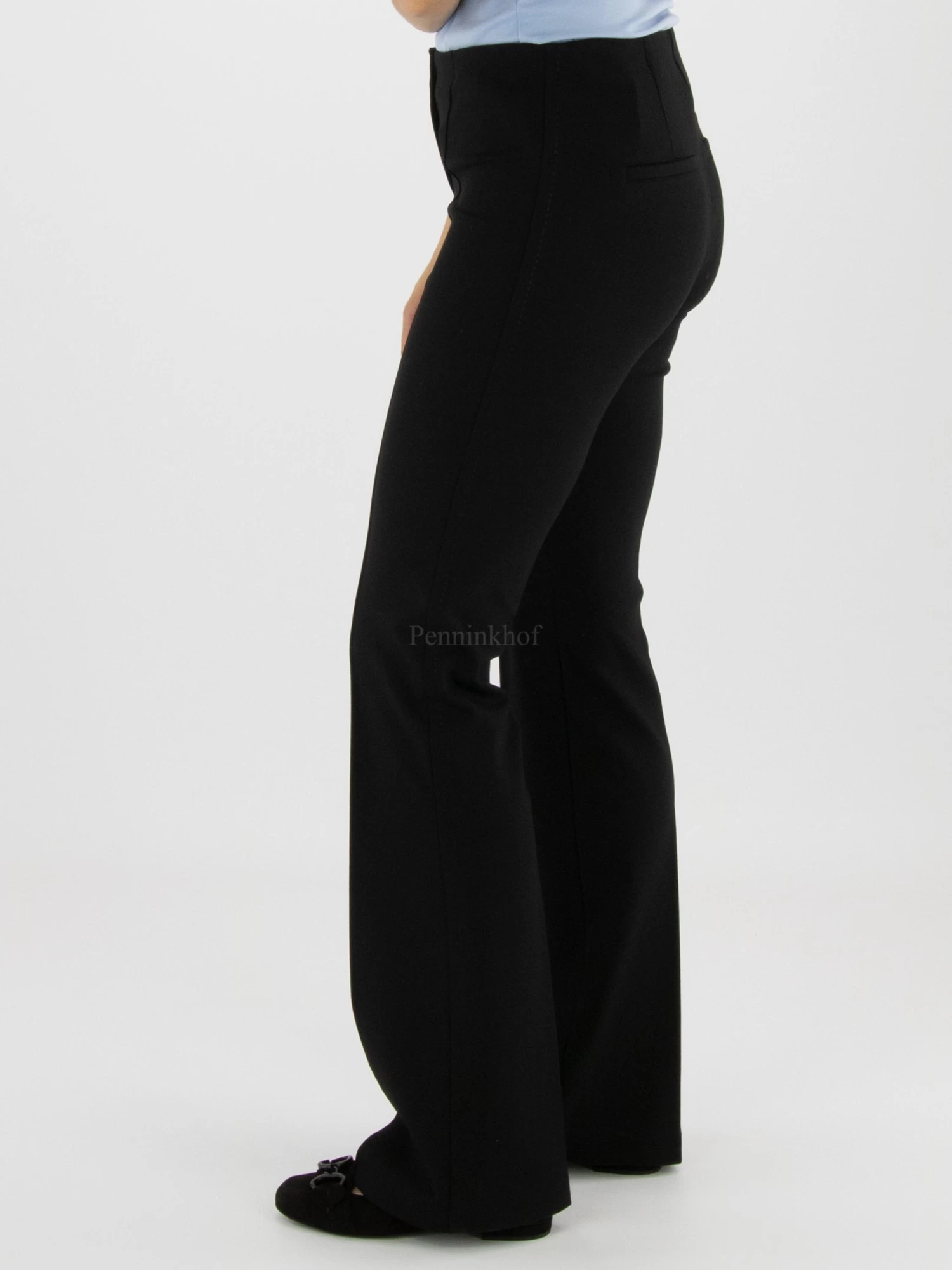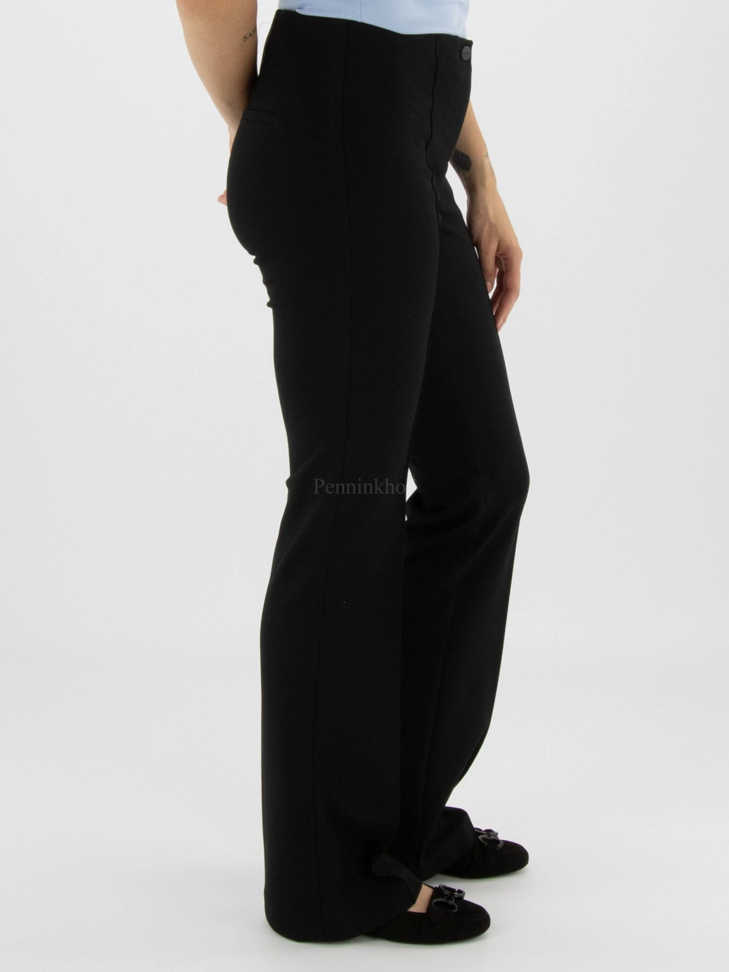 Een flared broek van Cambio in de kleur zwart. In de taille is een elastieken band. In het midden van de pijpen is een stiknaad. Deze broek mag op de hand worden gewassen.
