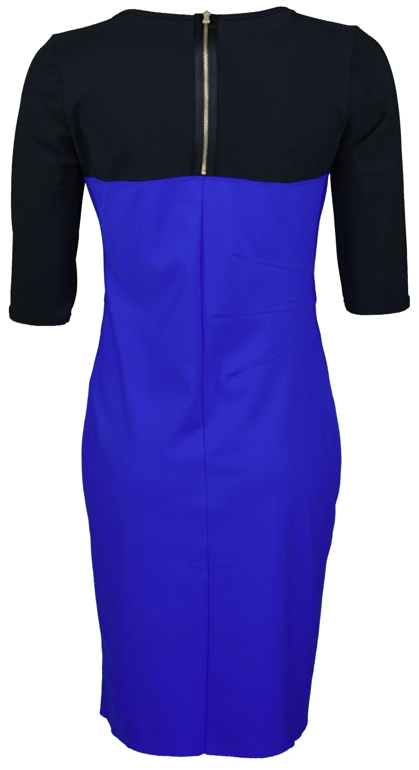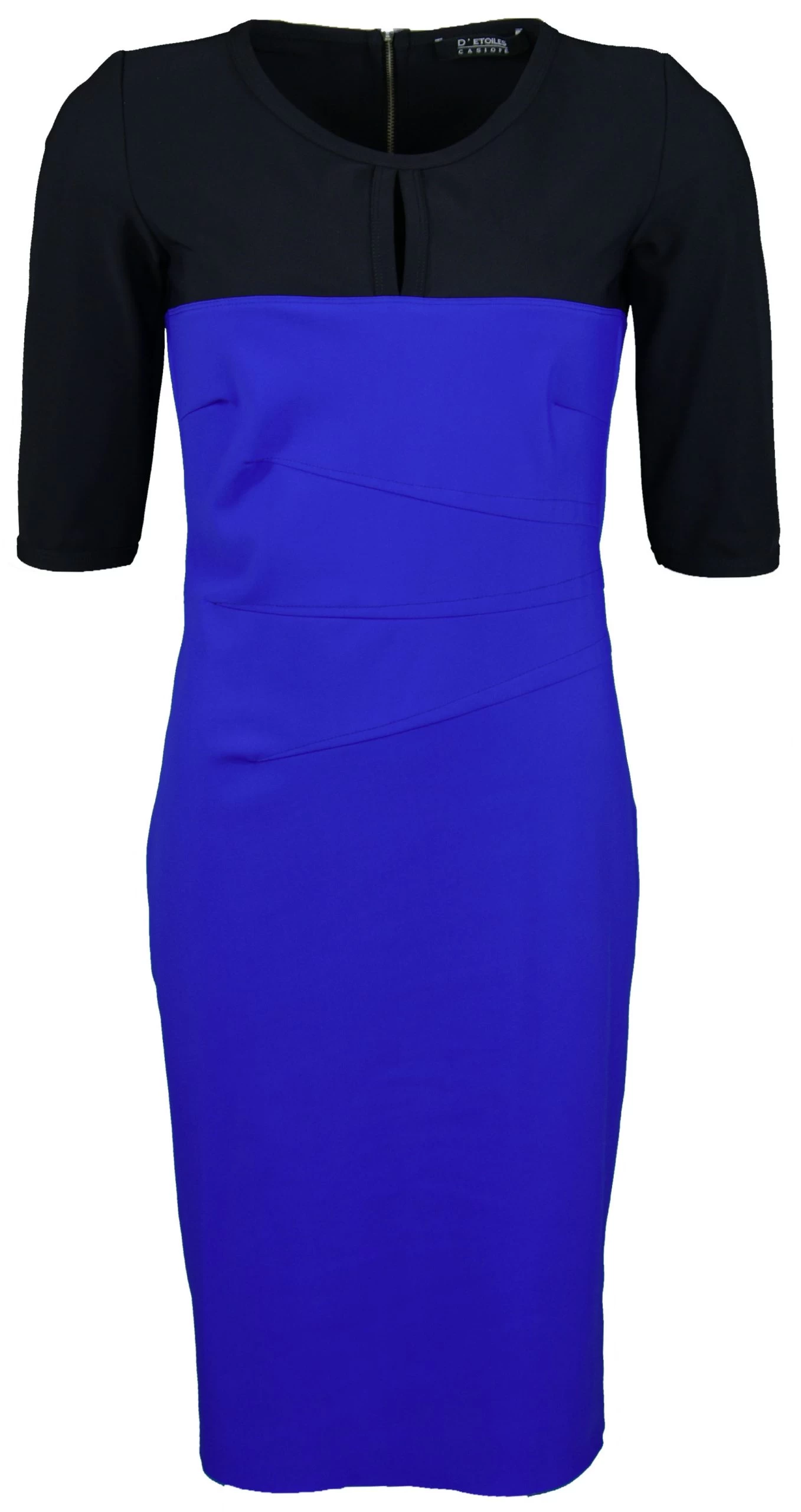 Een jurk van het merk d’Etoiles Casiopé in de kleuren zwart met kobalt blauw. De jurk is licht getailleerd met met vanaf de rechterzijde 3 geplooide stiknaden ter hoogte van de taille. De jurk heeft half lange mouwen en een ronde hals. deze jurk mag op 30 graden worden gewassen.