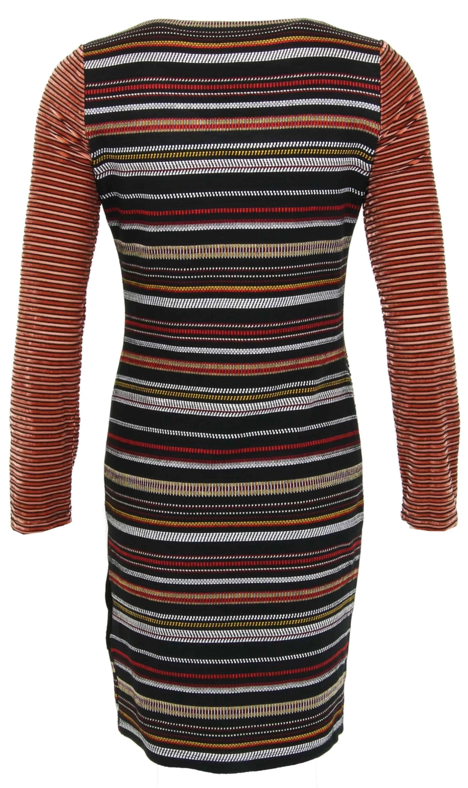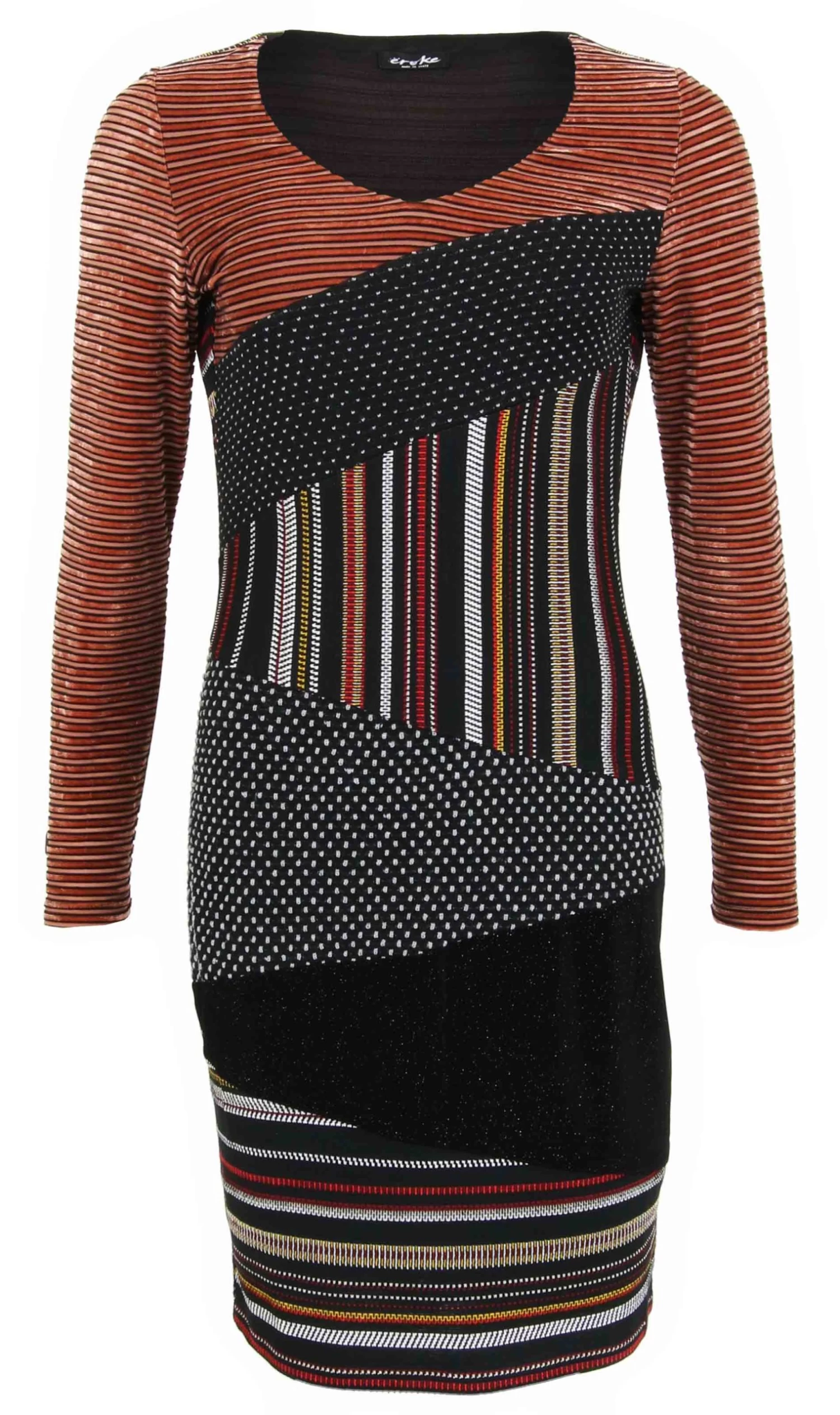 Een jurk van Eroke in meerdere printen in diagonale vlakken. De printen zijn in meerdere tinten bruinen wit op een zwarte achtergrond. De jurk is gevoerd en mag op 30 graden worden gewassen.