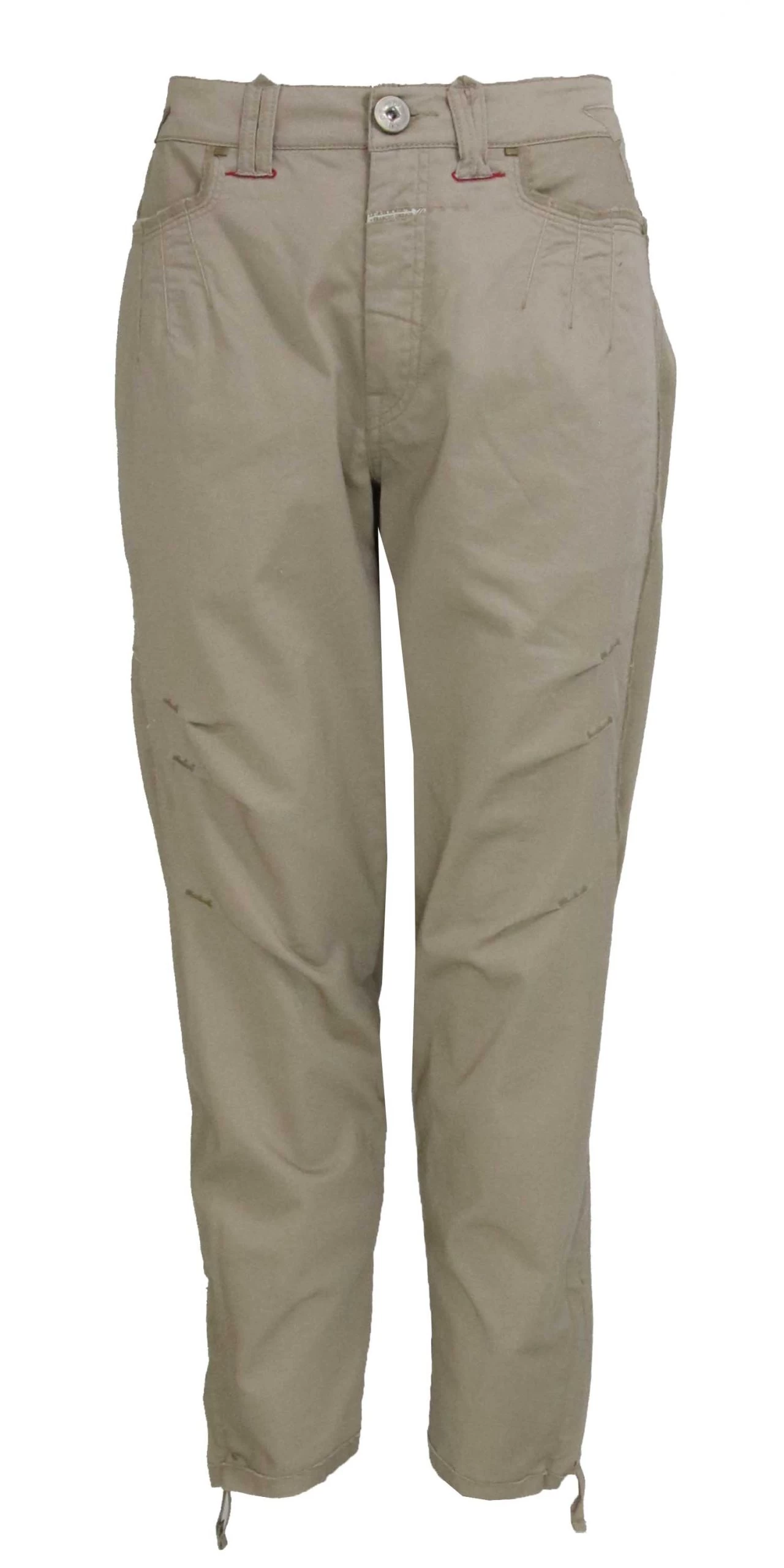 Een broek van Girbaud in een zand kleur. Op de zakken zijn verticale stiknaden. op het bovenbeen zijn aan de zijkanten diagonale stiknaden. Aan de onderkant van de pijpen is aan de zijkanten een lange rits. In de zakken aan de achterzijde is een korte decoratieve rits. deze broak mag op 30 graden worden gewssen.