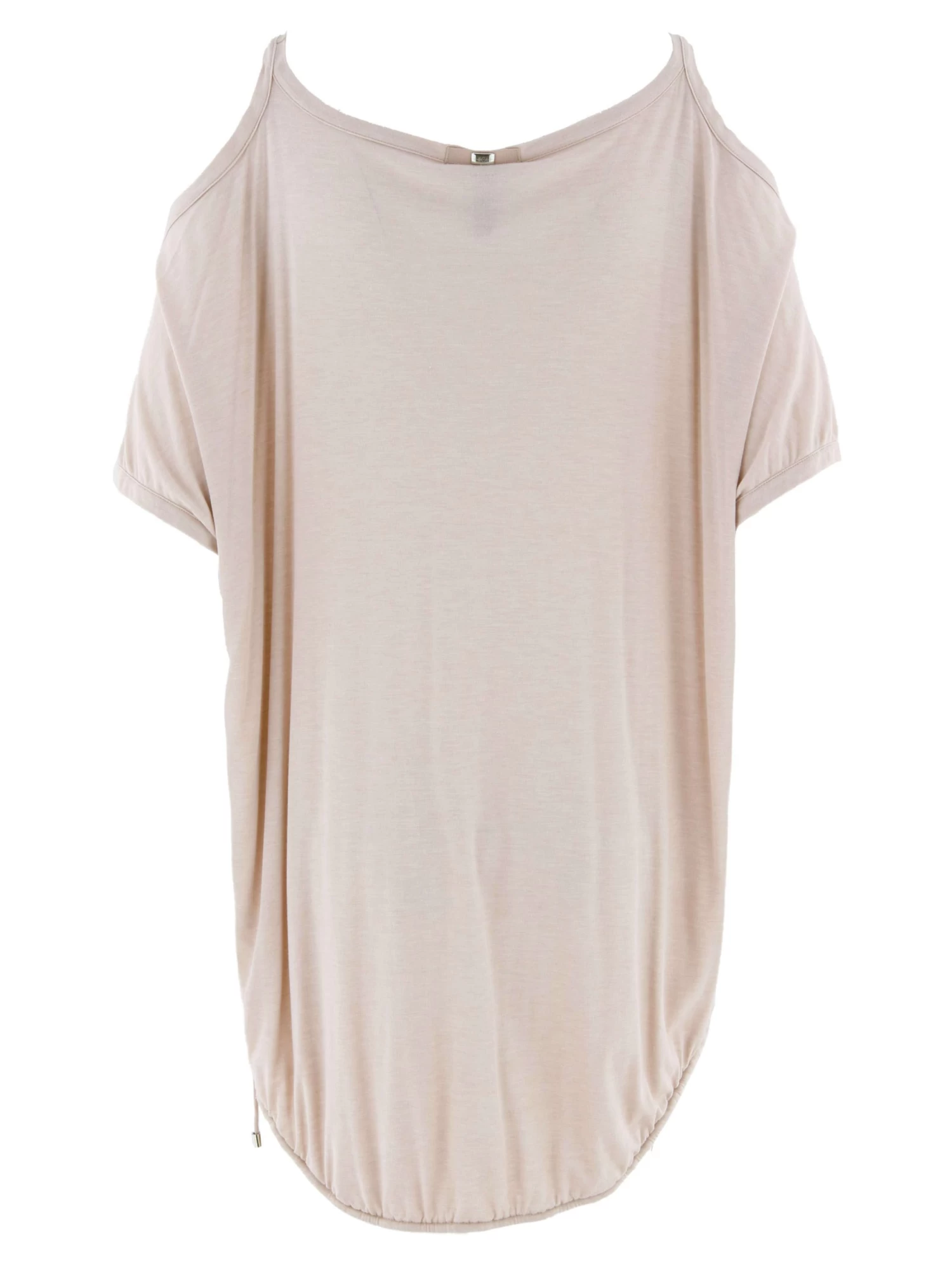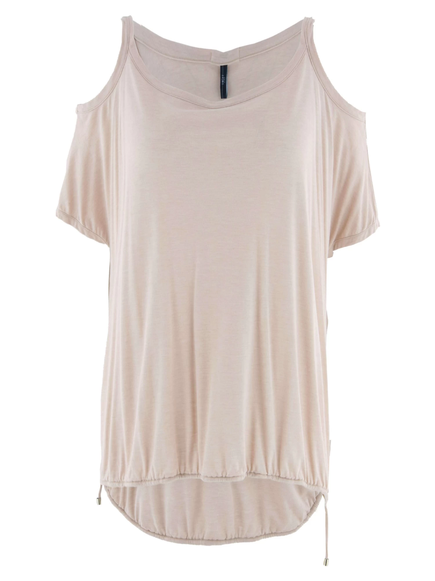 Een lange top van High in de kleur zand. De top heeft open schouders met een korte mouw. Aan de onderkant is een tunnelverwerking met een koord. Deze top mag op 30 graden worden gewassen.