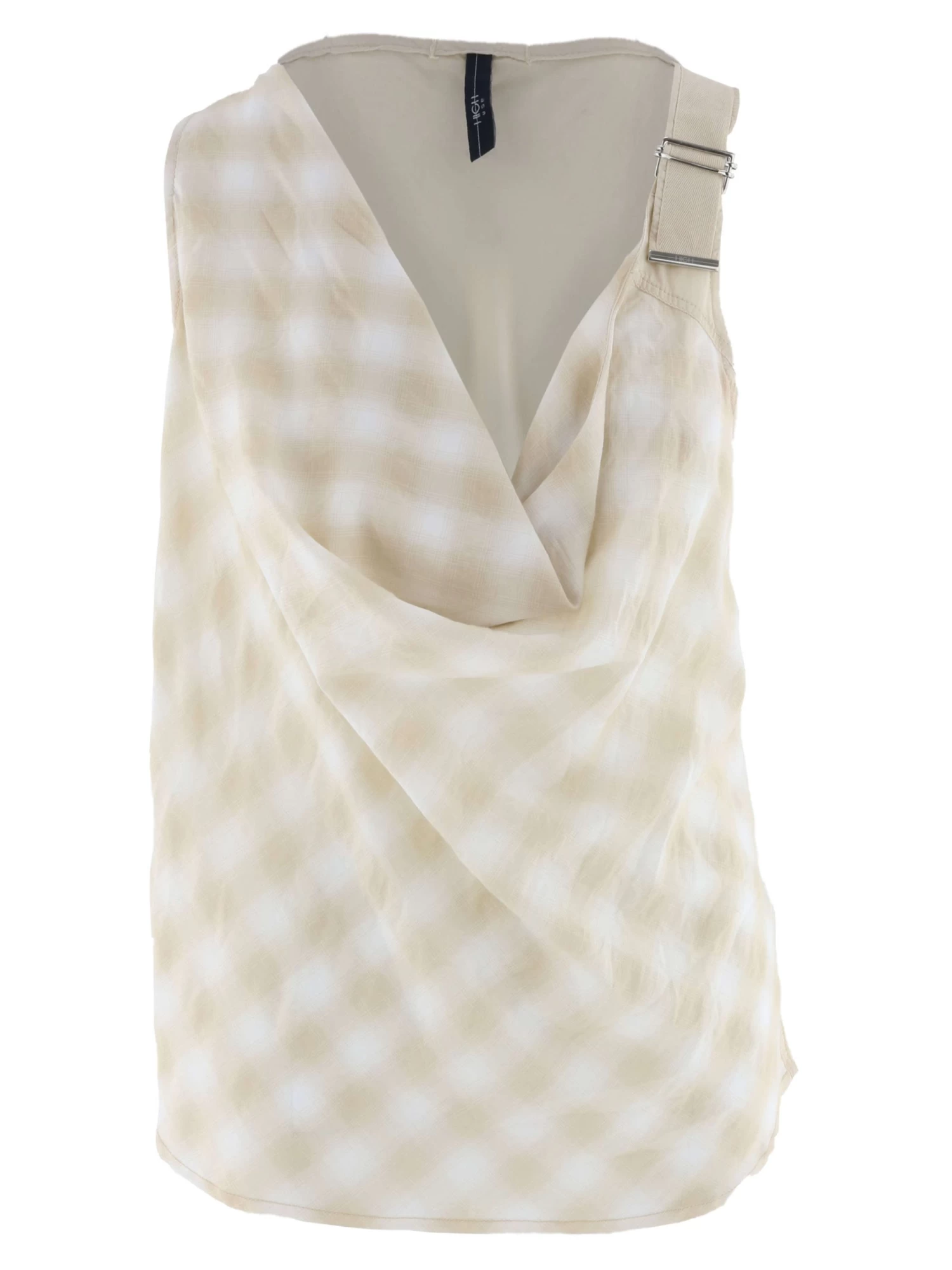 Een top met een vallende hals van High in een diagonale ruitprint met de kleuren zand en wit. De rechter schouderband is in een jeans materiaal en is verstelbaar. Deze top mag niet worden gewassen.