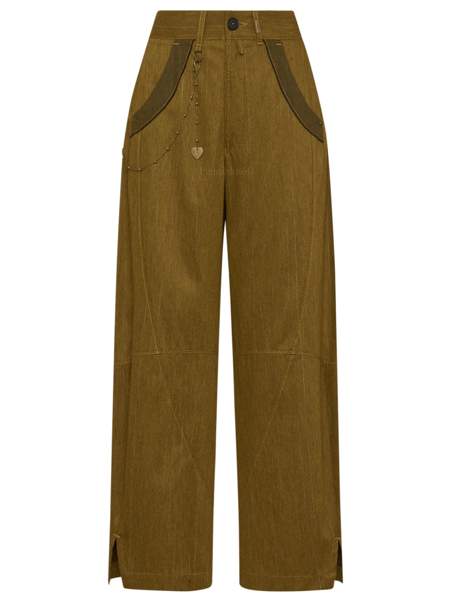 Een broek van High in een krijtstreep met de kleuren pistachegroen en platina. Langs de rand van de steekzakken is een rondlopende roomwitte bies. De broek heeft enkele diagonale stiknaden en aan de onderkant van de rechtgesneden pijpen is een split. Vanaf de lus van de ceintuur is aan de rechterkant een smalle ketting die naar de achterkant loopt. Deze broek mag niet worden gewassen.