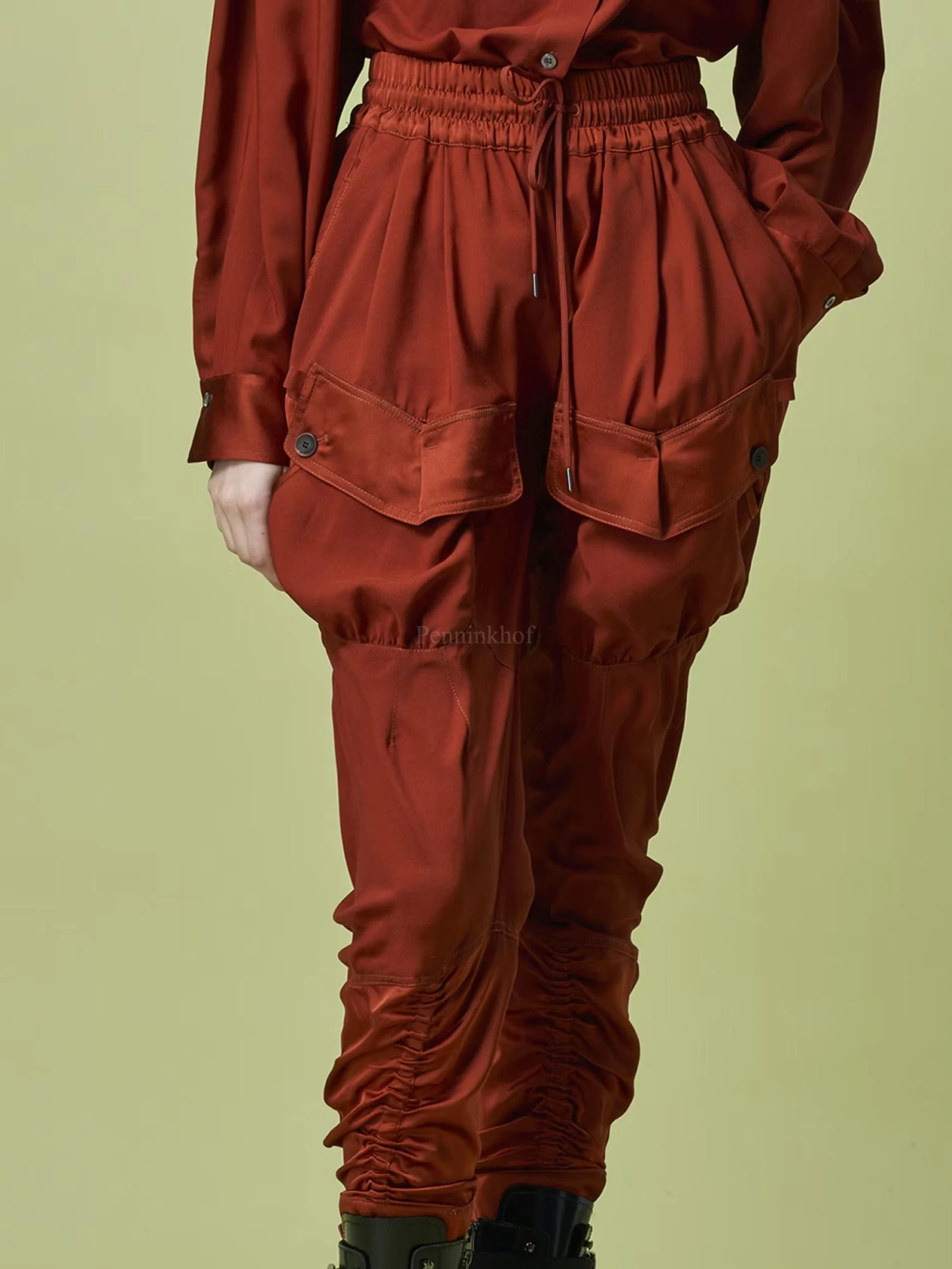 Een luxe joggingbroek van High in de kleur roest. In de taille is een fijn geribbelde mat satijnen en elastische band. Op het bovenbeen zijn grote decoratieve zakken. Bij de kuiten is een mat satijnen stof met in het midden een koord in een tunnelverwerking waarme een plooi effect kan worden gecreëerd. Deze broek mag op de hand worden gewassen.