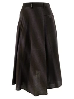 Een rok van High in een grafische strepen patroon met de kleuren paars en mokka bruin. Aan de linker zijkant van de rok zijn 2 brede plooien die diagonaal naar beneden lopen en een drapeer effect geven. Deze rok mag niet worden gewassen.