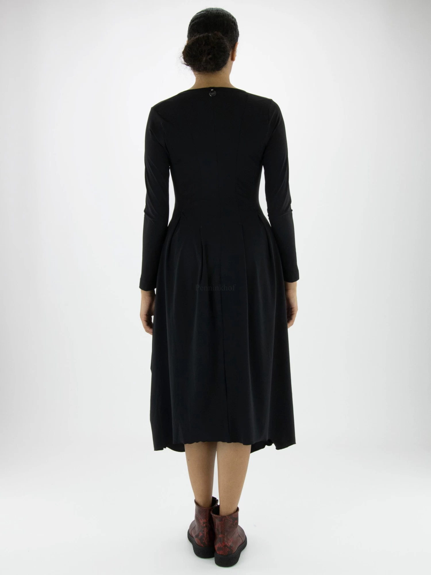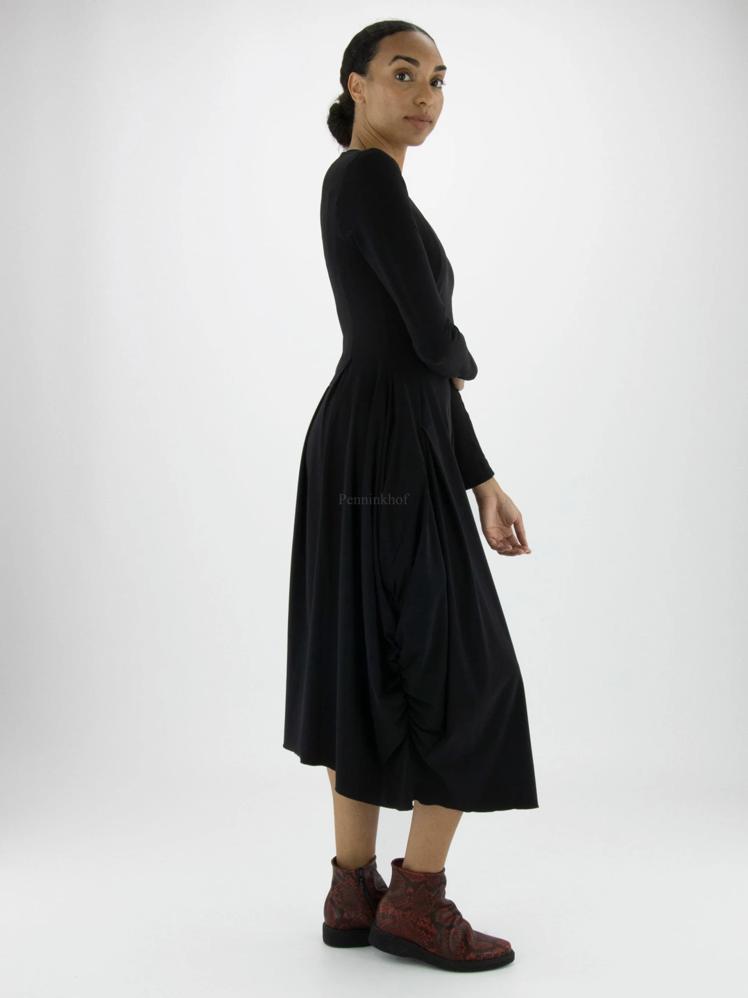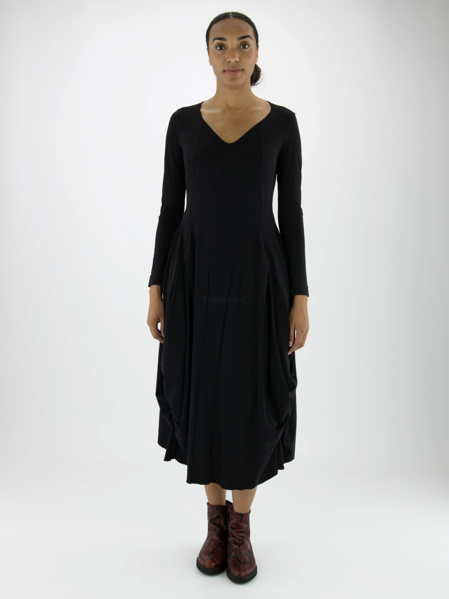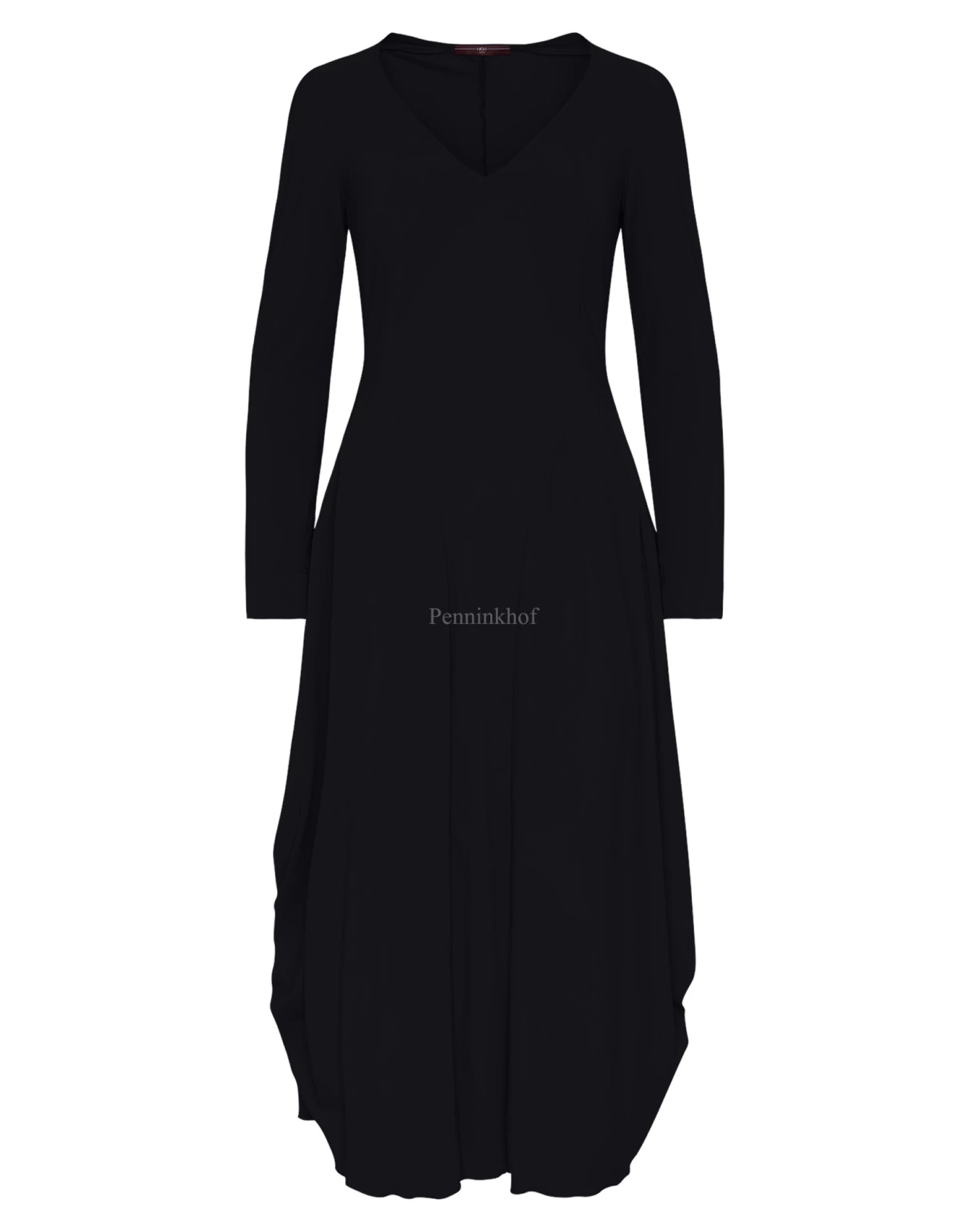 Een jurk van High in de kleur zwart met lange mouwen. De jurk heeft een V – Hals en vanuit de taille heeft de jurk een ballon vorm. Ter hoogte van de taille zijn steekzakken. Deze jurk mag op 30 graden worden gewassen.