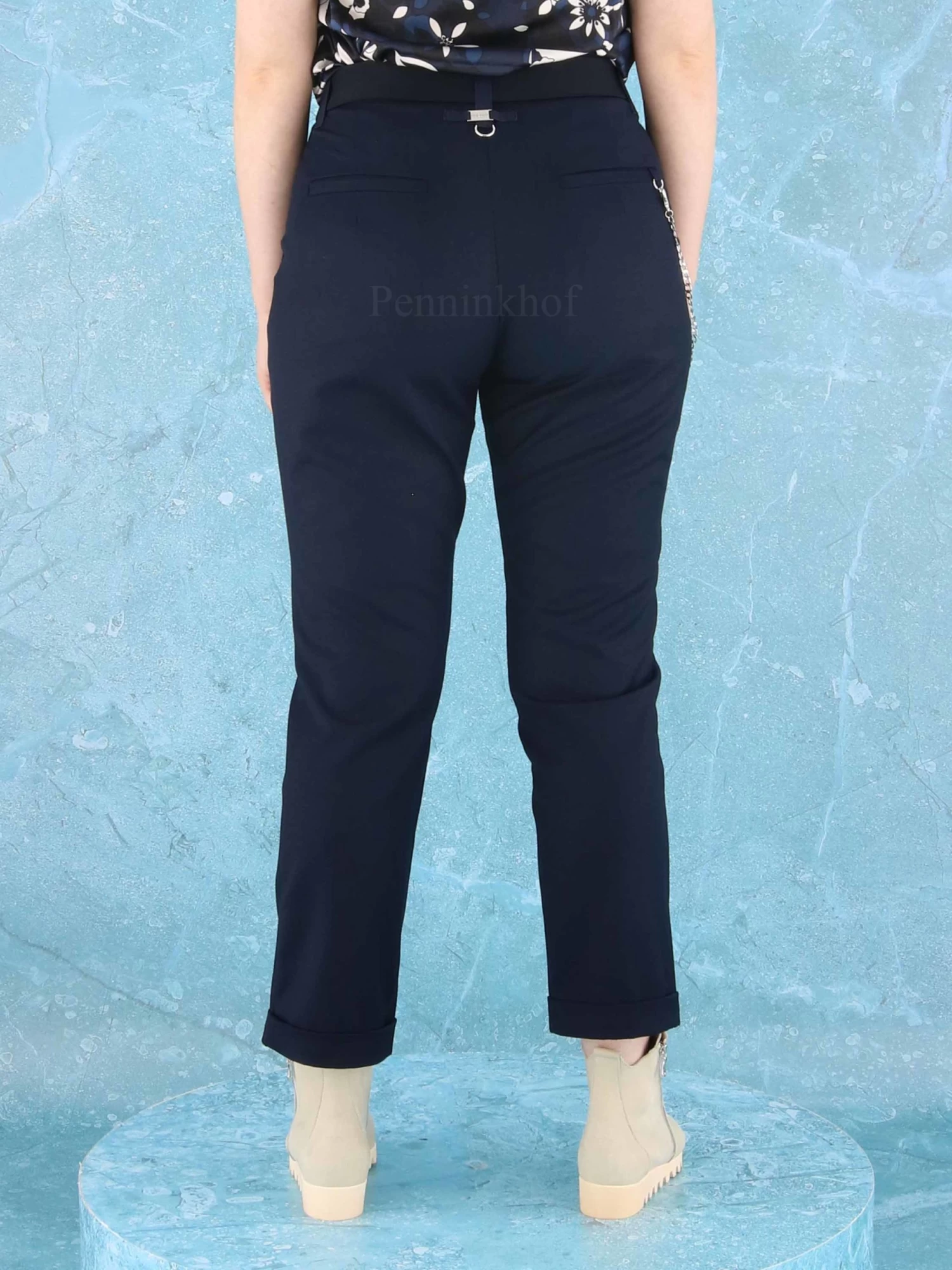 Een broek van High in de kleur marineblauw. In de taille is een elastieken ceintuur met een ronde zilverkleurige gesp. Vanuit de taille zijn aan de voorzijde enkele bandplooien. Aan de onderkant van de pijpen is een korte omslag. Vanuit de rechter ceintuurlus is een zilverkleurige ketting die naar de achterkant gaat. De broek heeft steekzakken en mag op 30 graden worden gewassen.