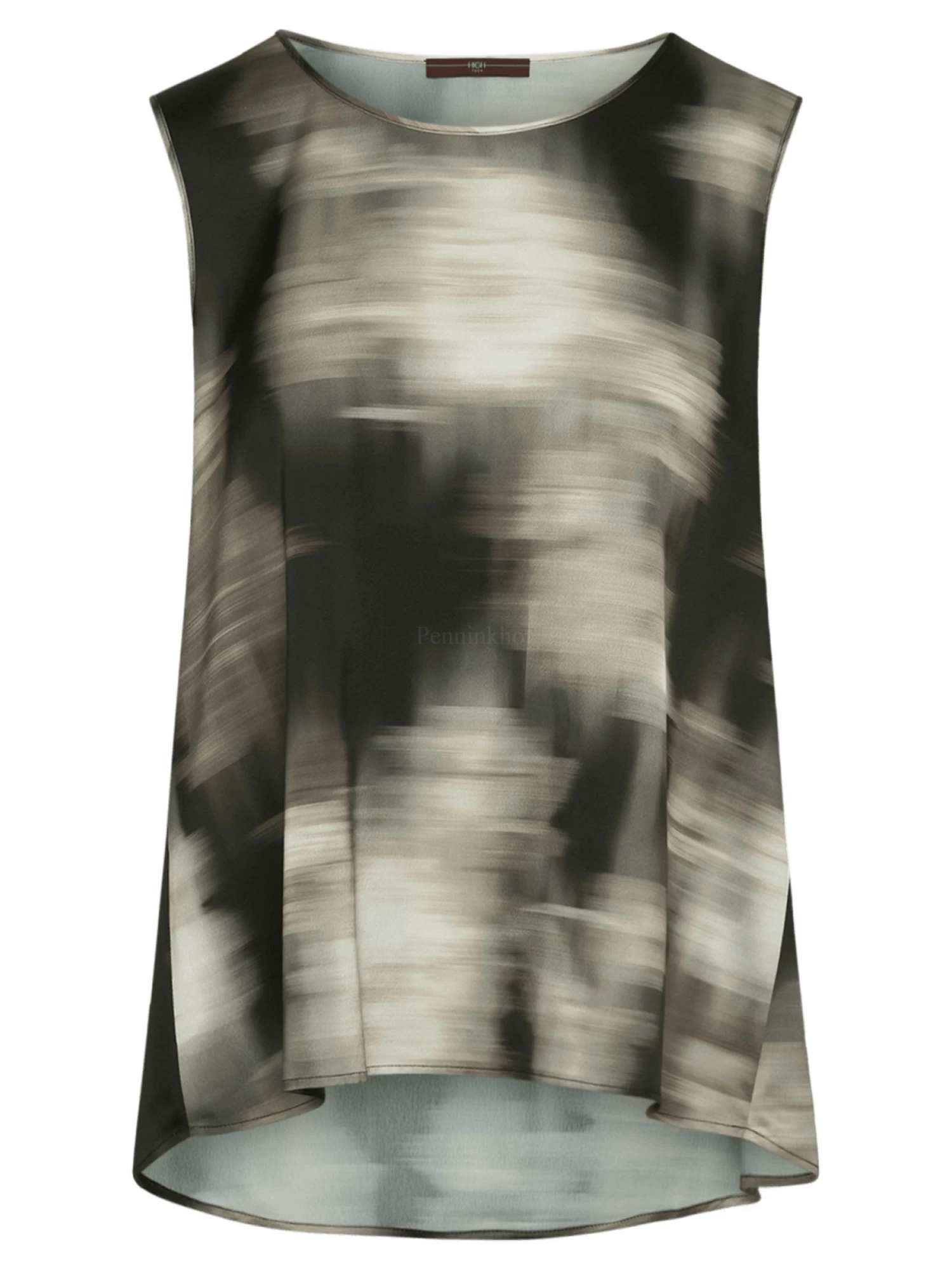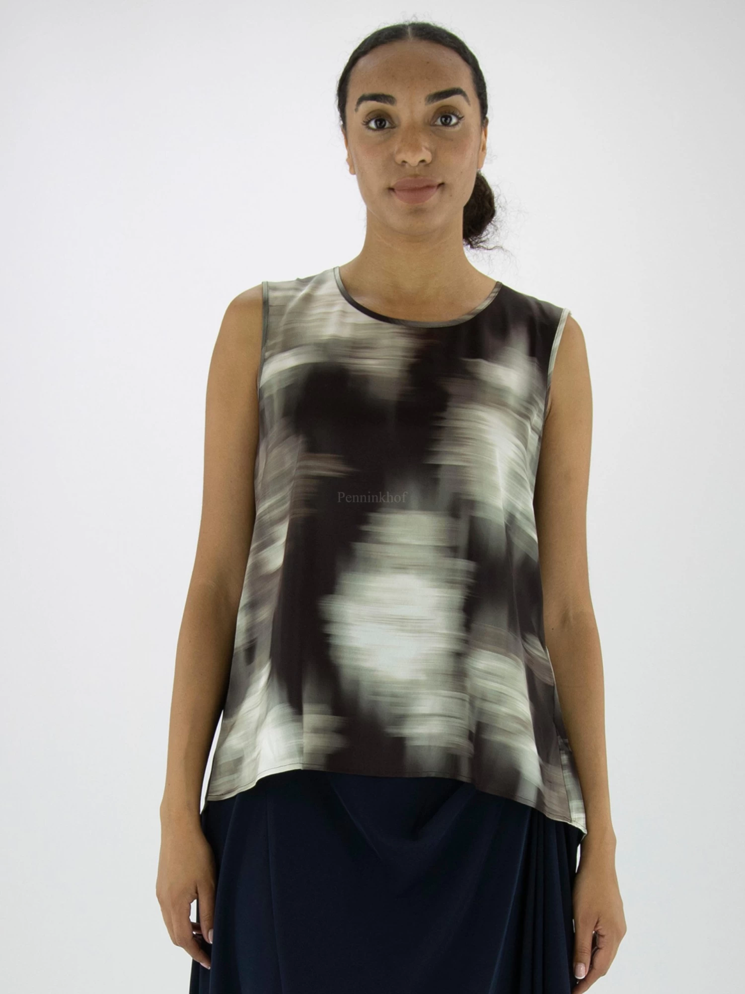 Een top van High in een camouflage print met meerdere tinten khaky en roomwit. De top heeft een A- Lijn en mag op de hand worden gewassen.