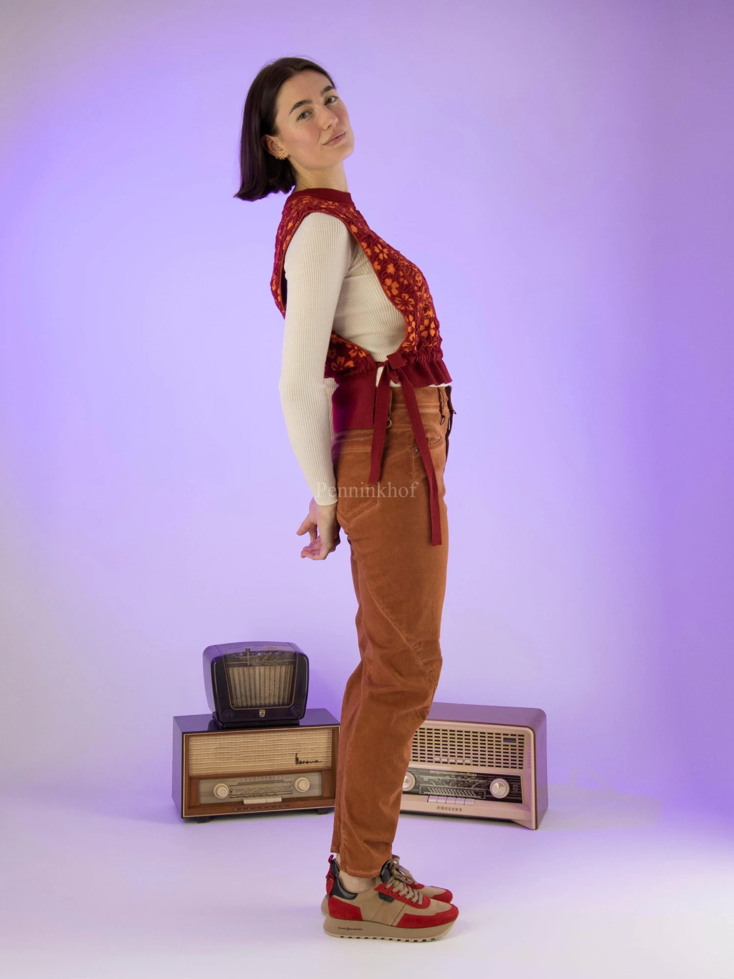 Een hes van High in een barok print met de kleuren roest en oranje. De zijkanten zijn open en aan de onderkant zijn linten waarmee het hes kan worden gesloten. Deze linten zijn in een tunnel verwerking horizontaal in de stof waarmee ook een plooi effect kan worden gecreëerd. Het hes heeft een ronde hals met een fijn geribbelde tricot boord. Dit hes mag op de hand worden gewassen.