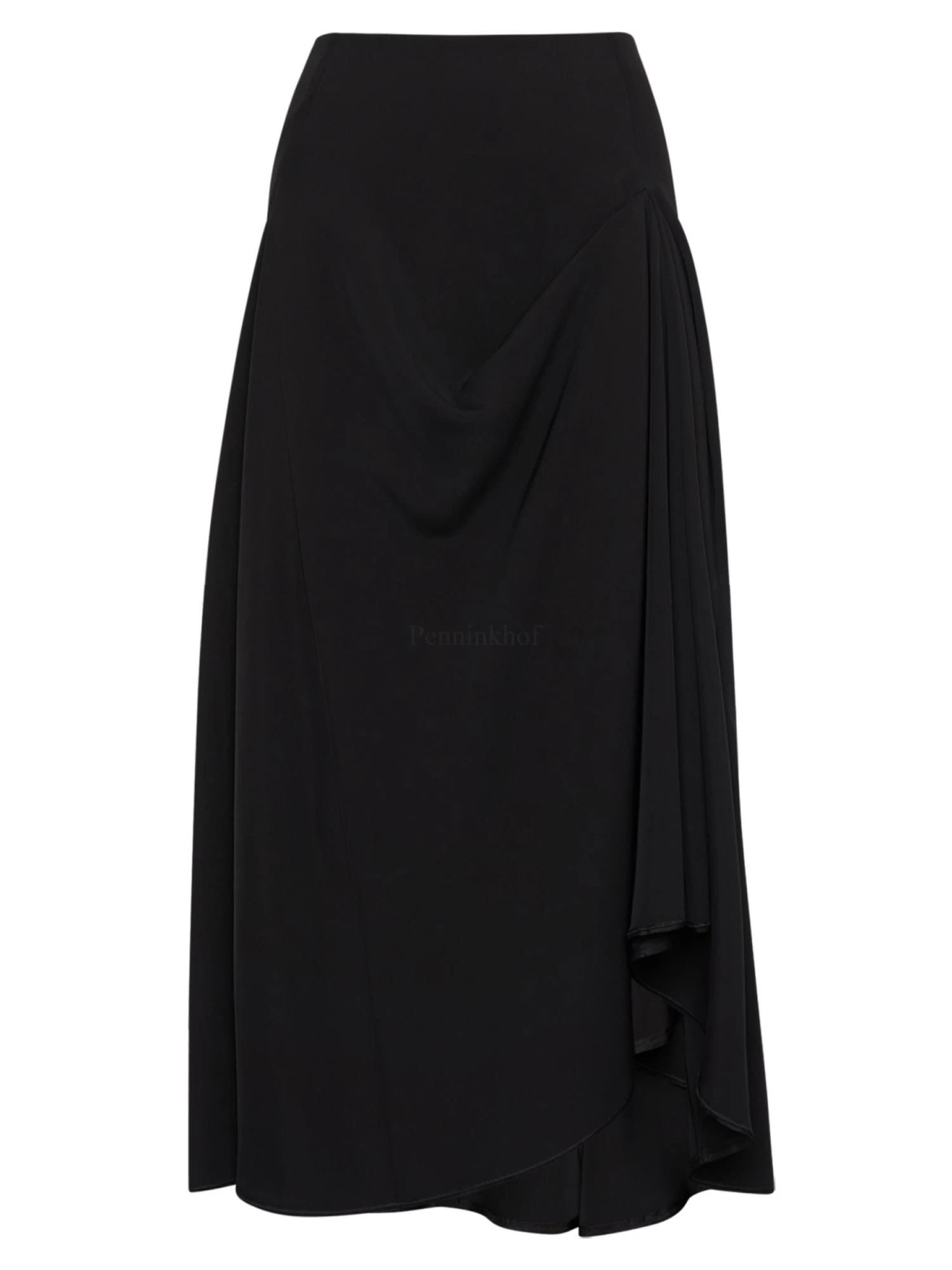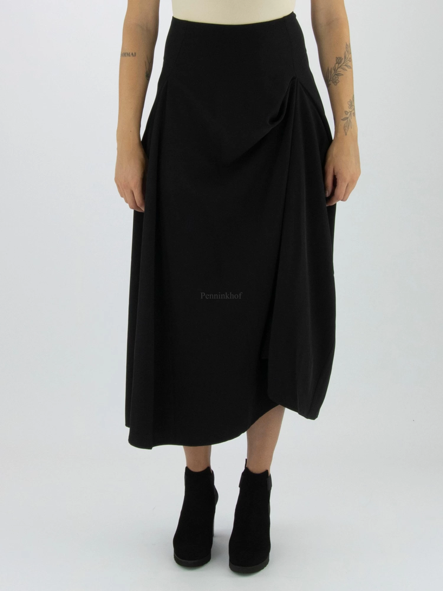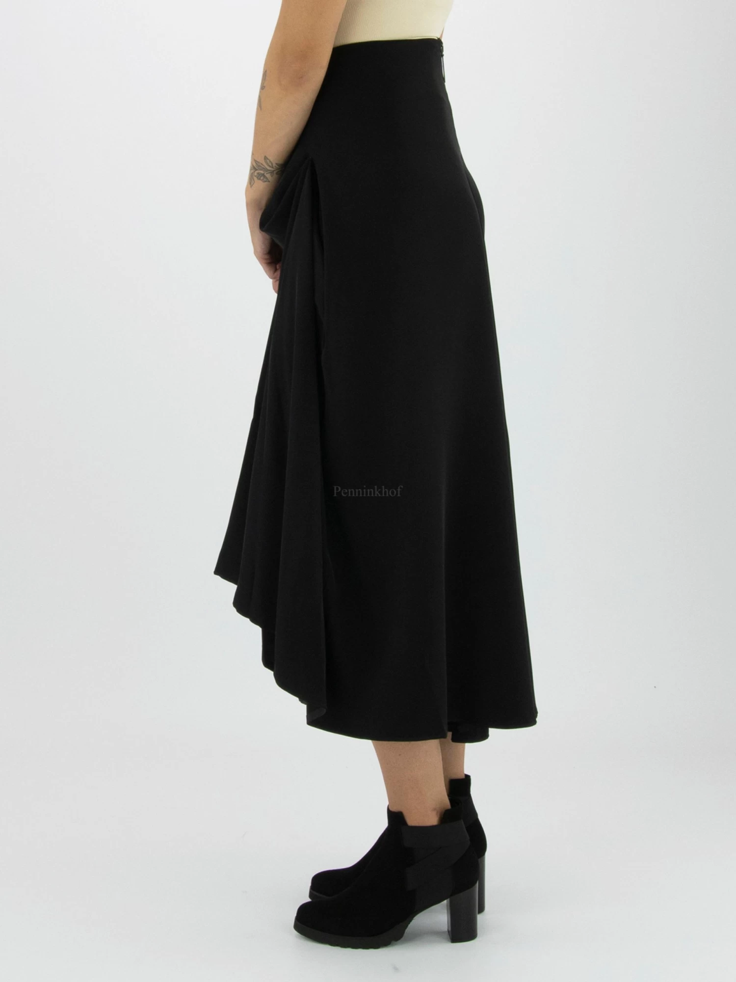 Een lange rok van High in de kleur zwart. Rechts van het midden is aan de voorzijde een ophaal ter hoogte van de heup wat een drapeer effect geeft. Deze rok mag op de hand worden gewassen.