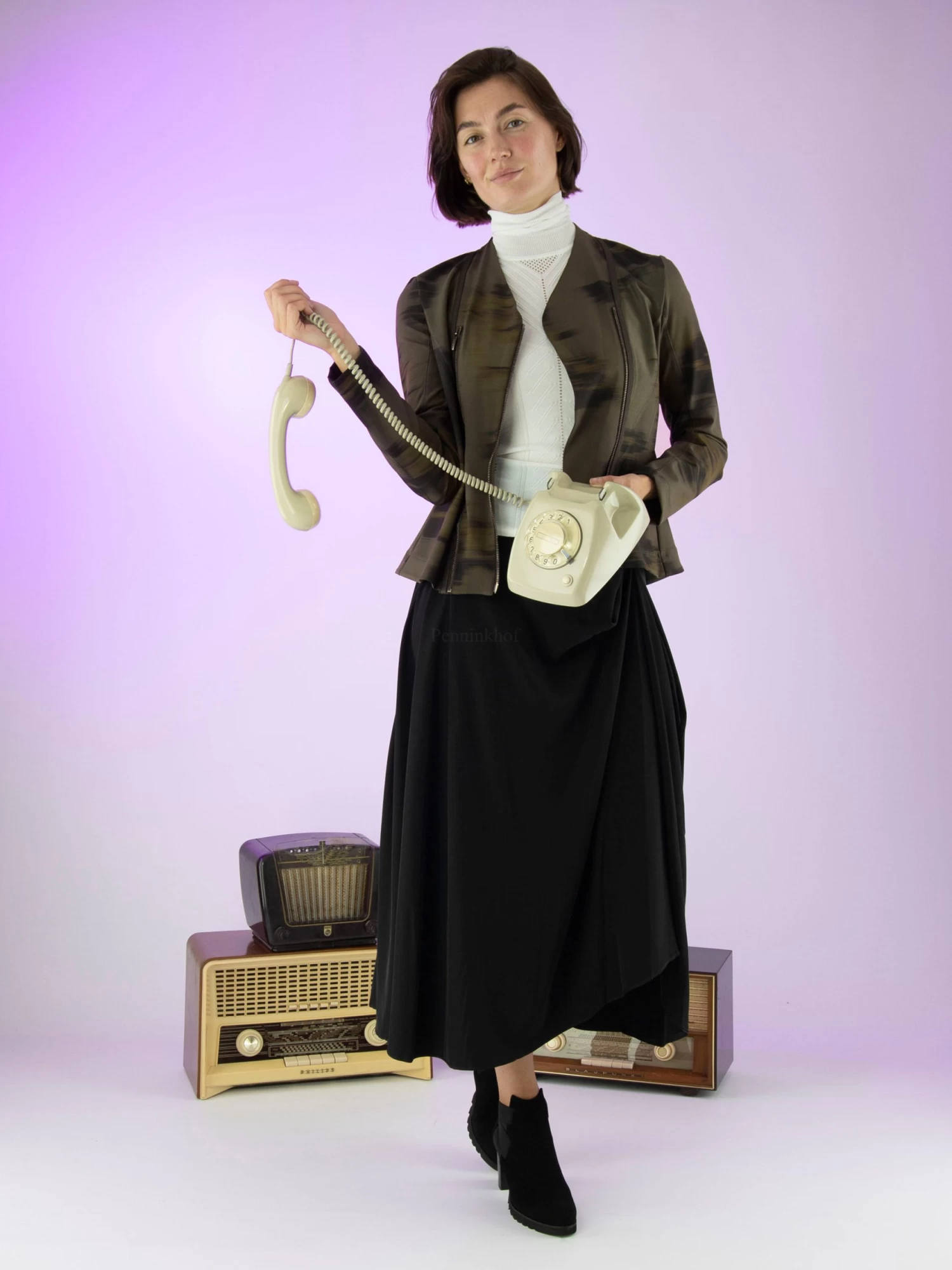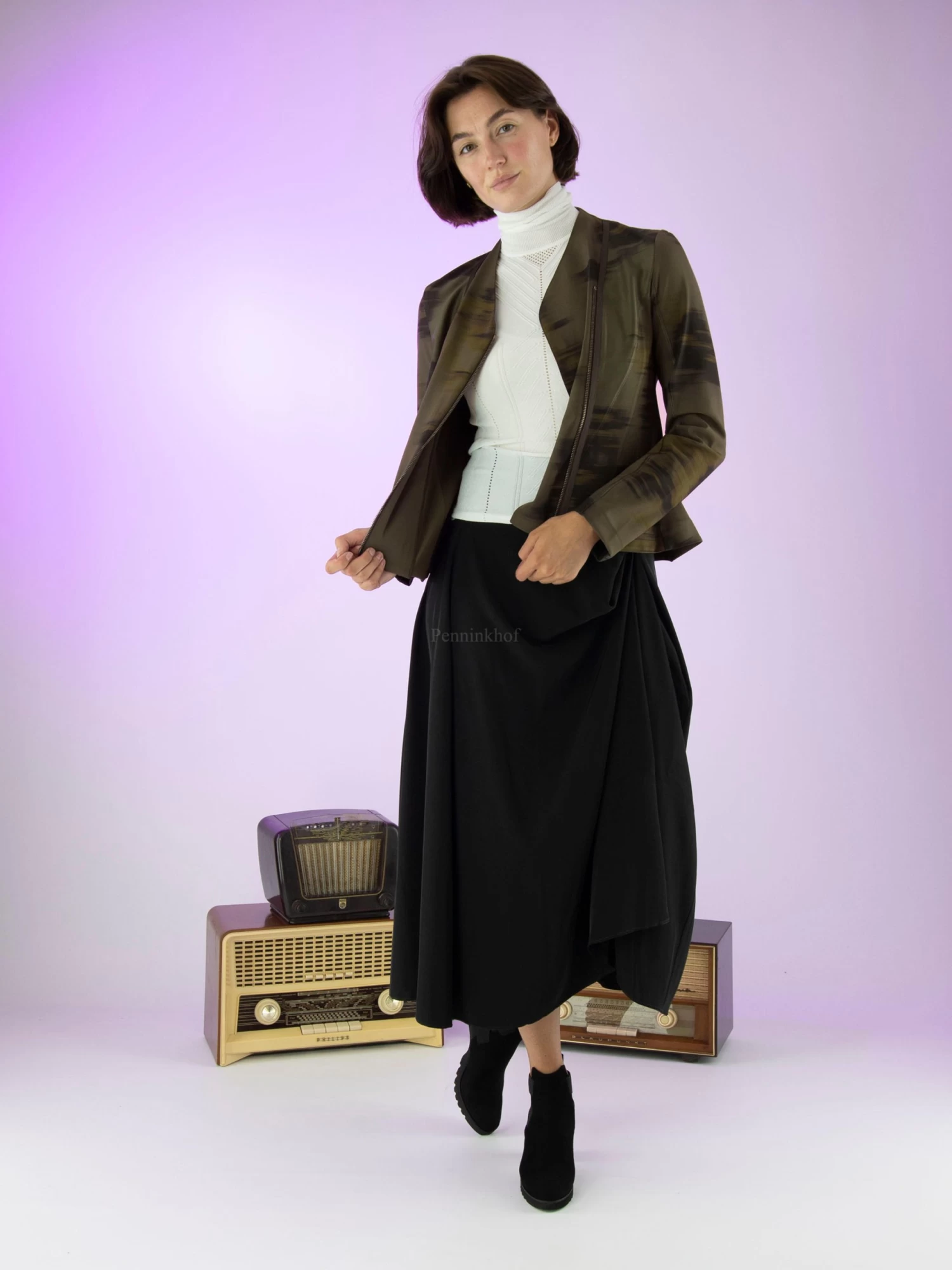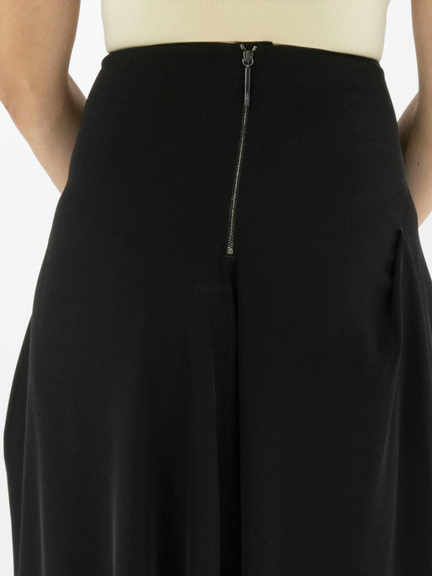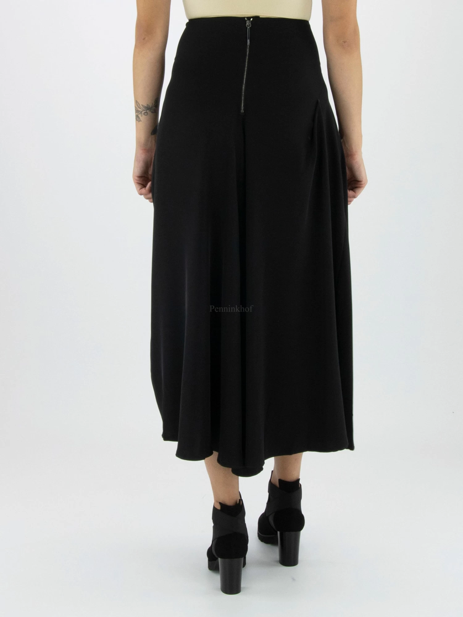 Een lange rok van High in de kleur zwart. Rechts van het midden is aan de voorzijde een ophaal ter hoogte van de heup wat een drapeer effect geeft. Deze rok mag op de hand worden gewassen.