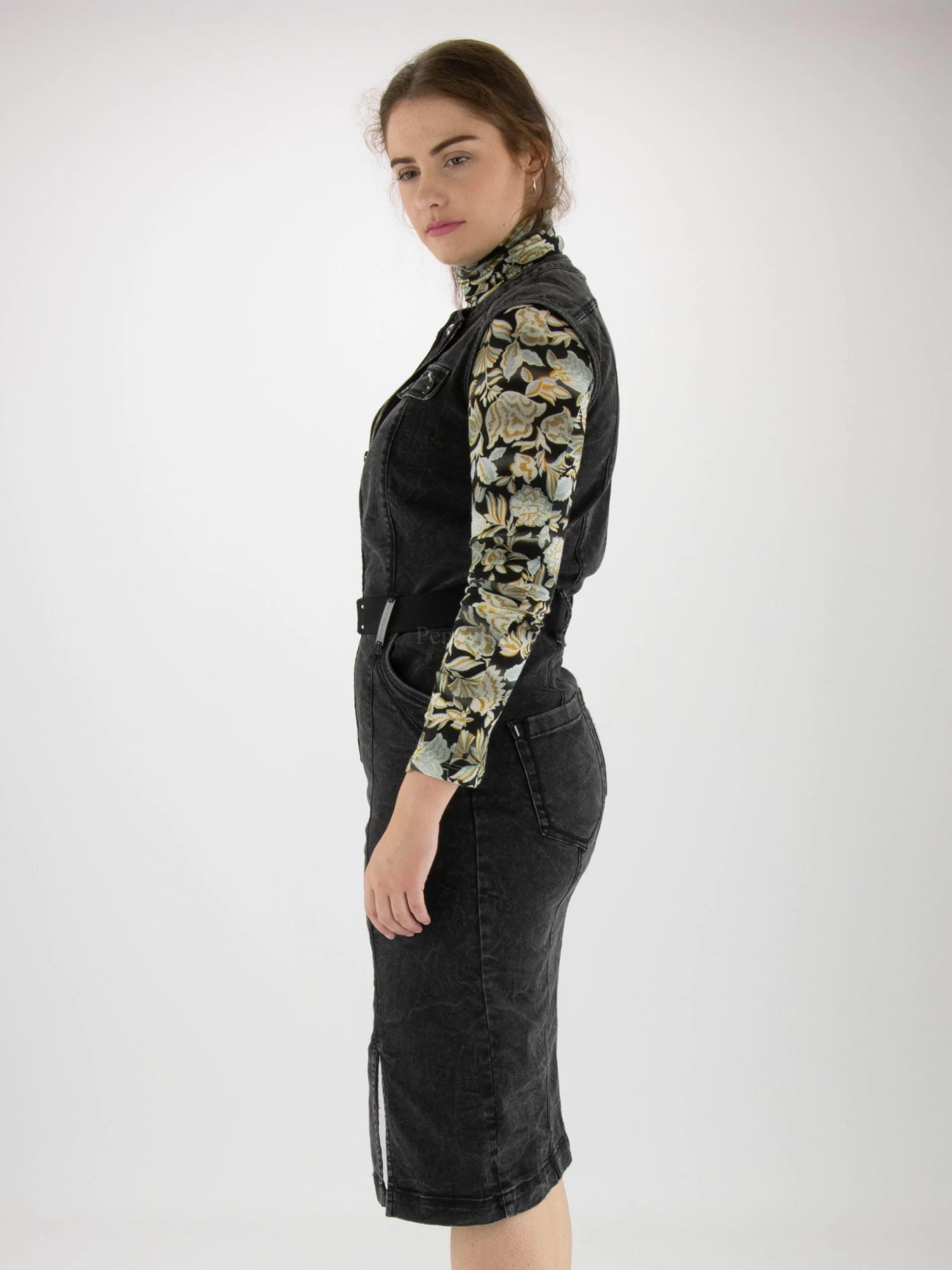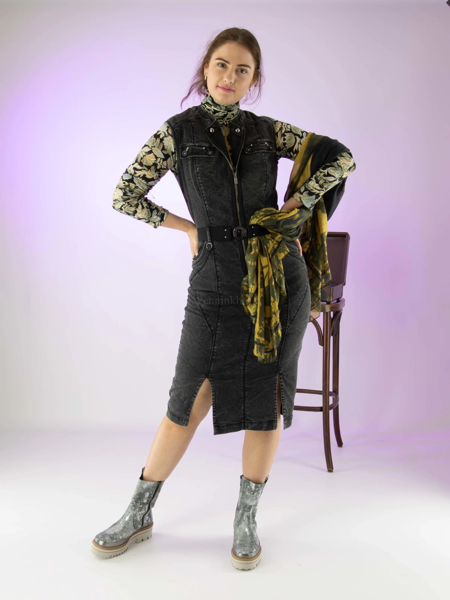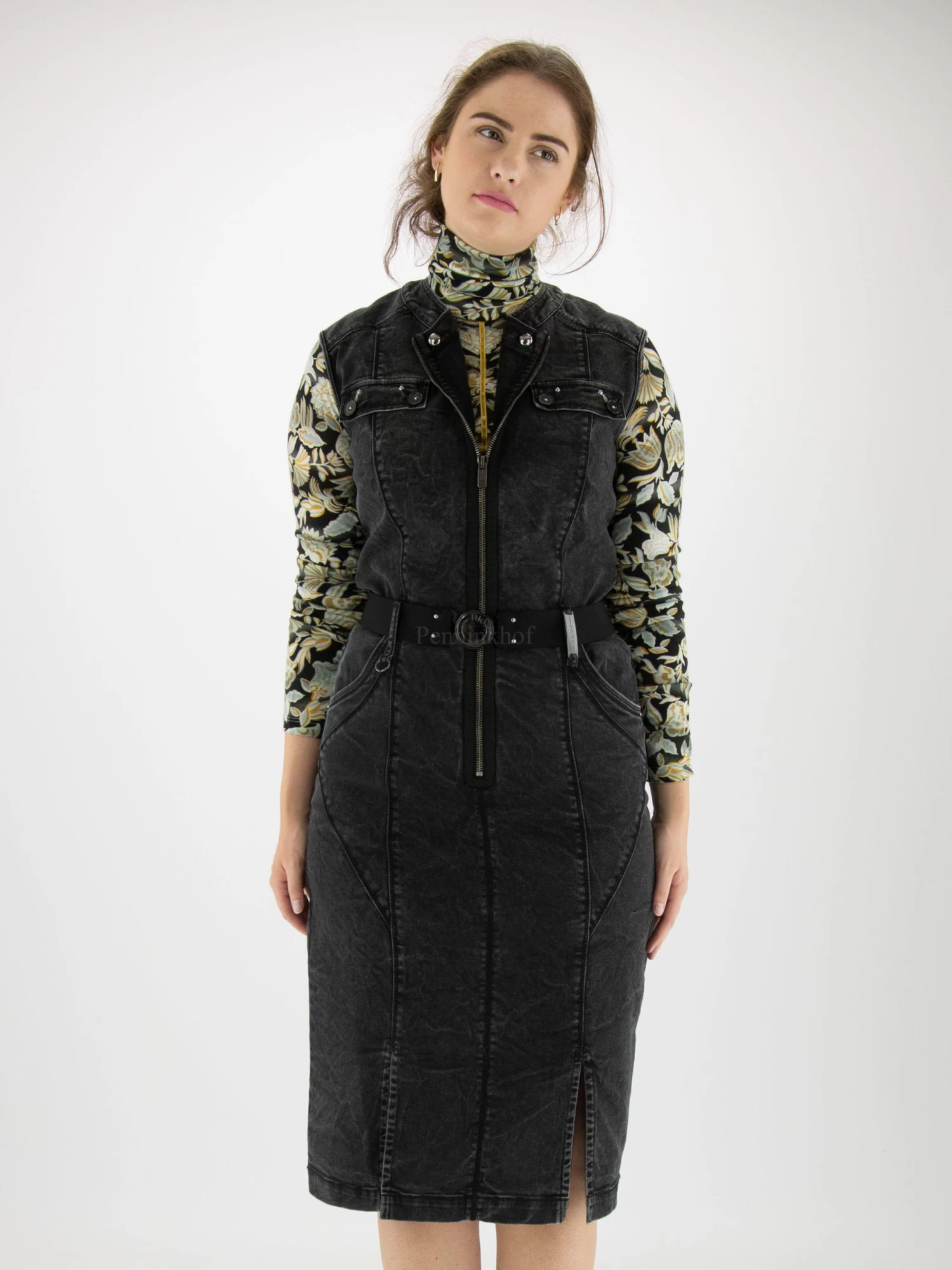 Een jeans jurk van High in een donkere grijze kleur. Vanuit de hals is een rits tot onder de taille die aan de bovenkant open is en omgeslagen met 2 decoratieve zilverkleurige studs.In de taill is een elastieken ceintuur met een ronde nikkel kleurige gesp. De jurk heeft steekzakken enaan de onderkant zijn aan beide zijden van het midden diepe splitten. Deze jurk mag op 30 graden worden gewassen.