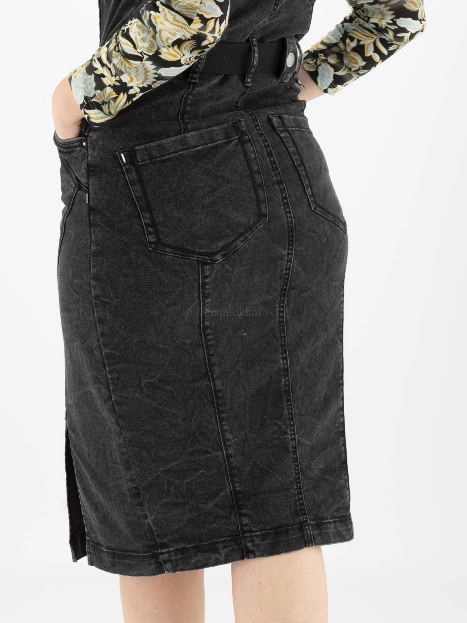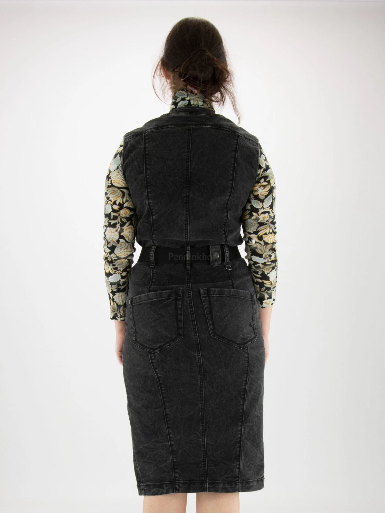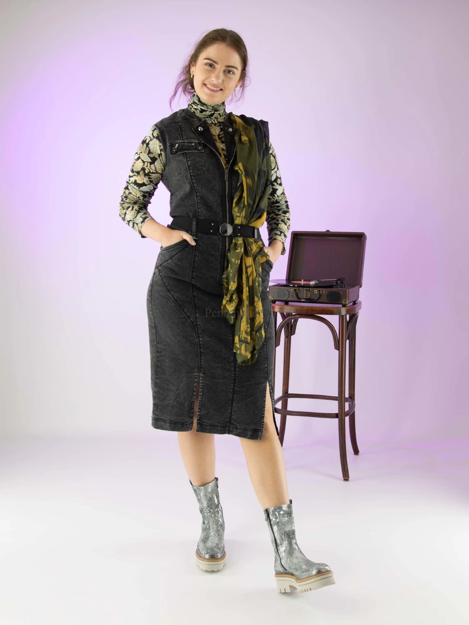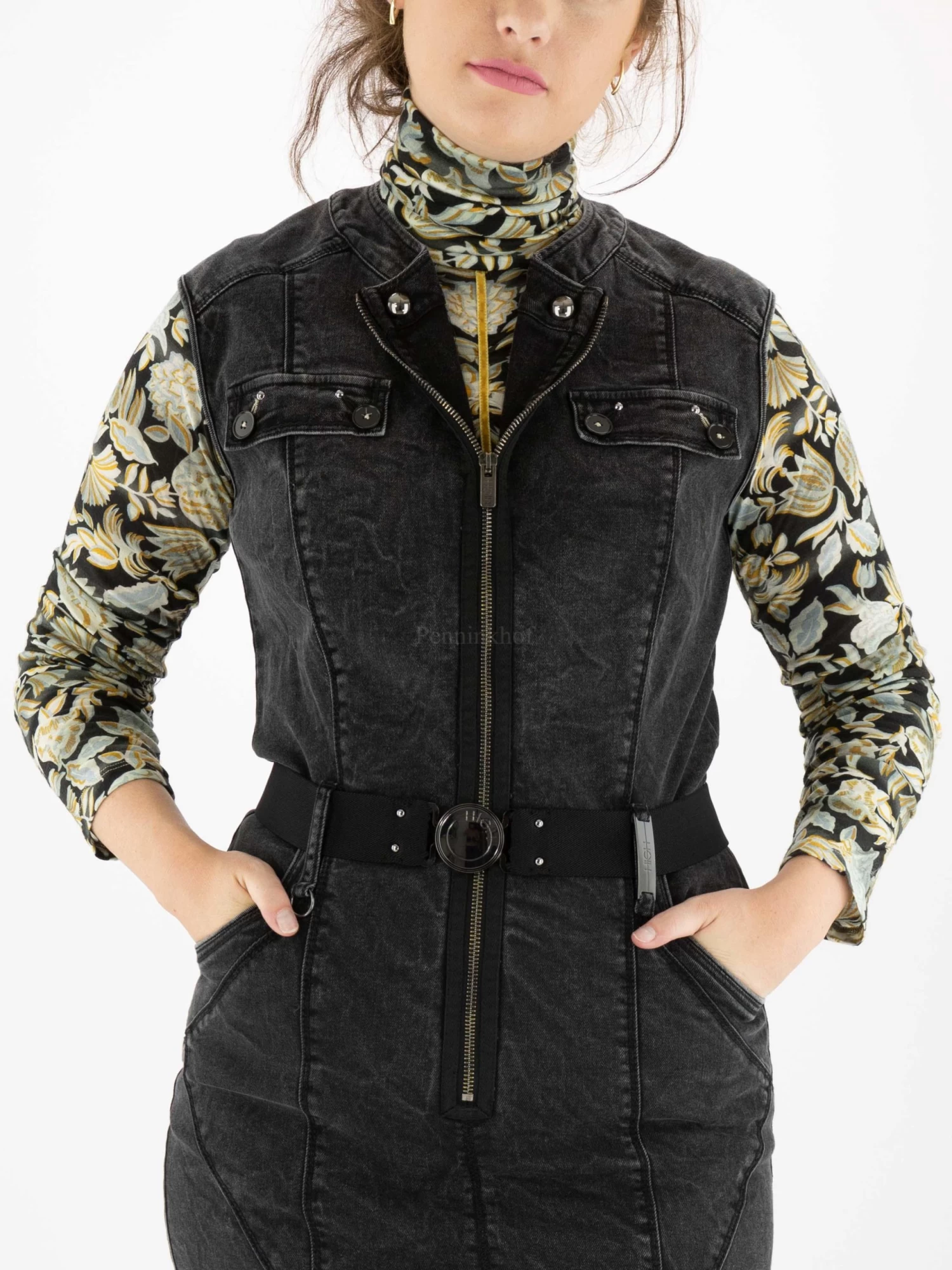 Een jeans jurk van High in een donkere grijze kleur. Vanuit de hals is een rits tot onder de taille die aan de bovenkant open is en omgeslagen met 2 decoratieve zilverkleurige studs.In de taill is een elastieken ceintuur met een ronde nikkel kleurige gesp. De jurk heeft steekzakken enaan de onderkant zijn aan beide zijden van het midden diepe splitten. Deze jurk mag op 30 graden worden gewassen.