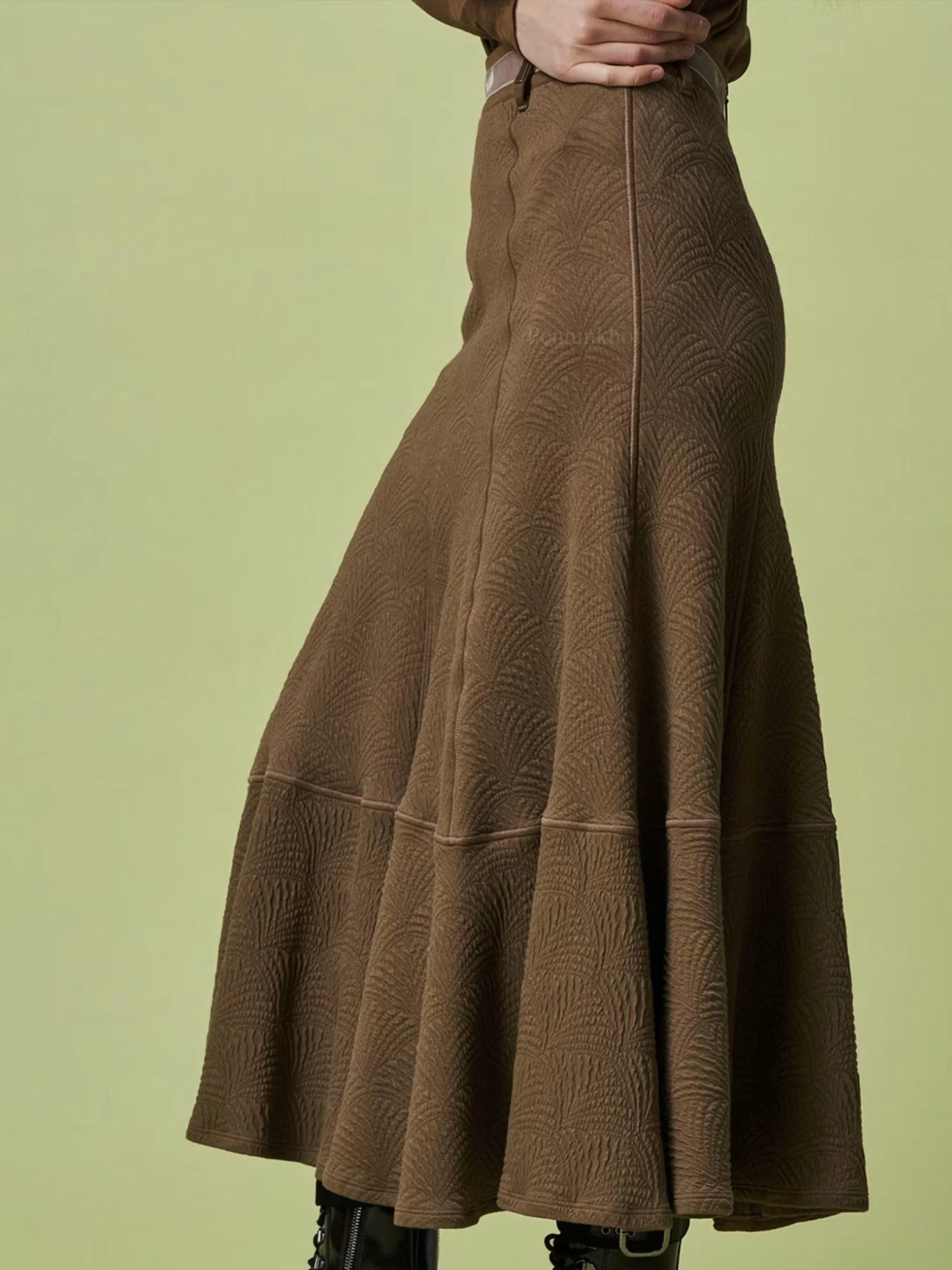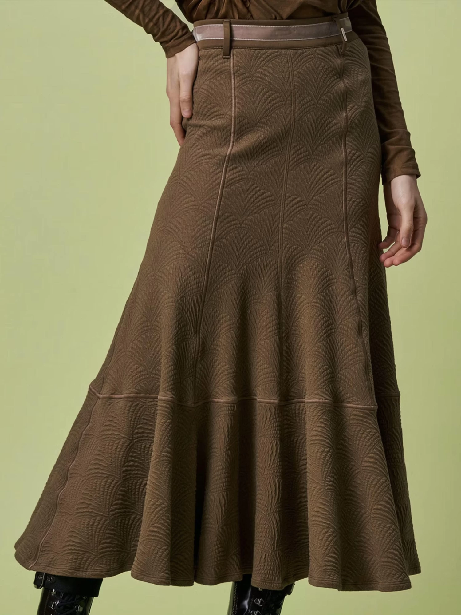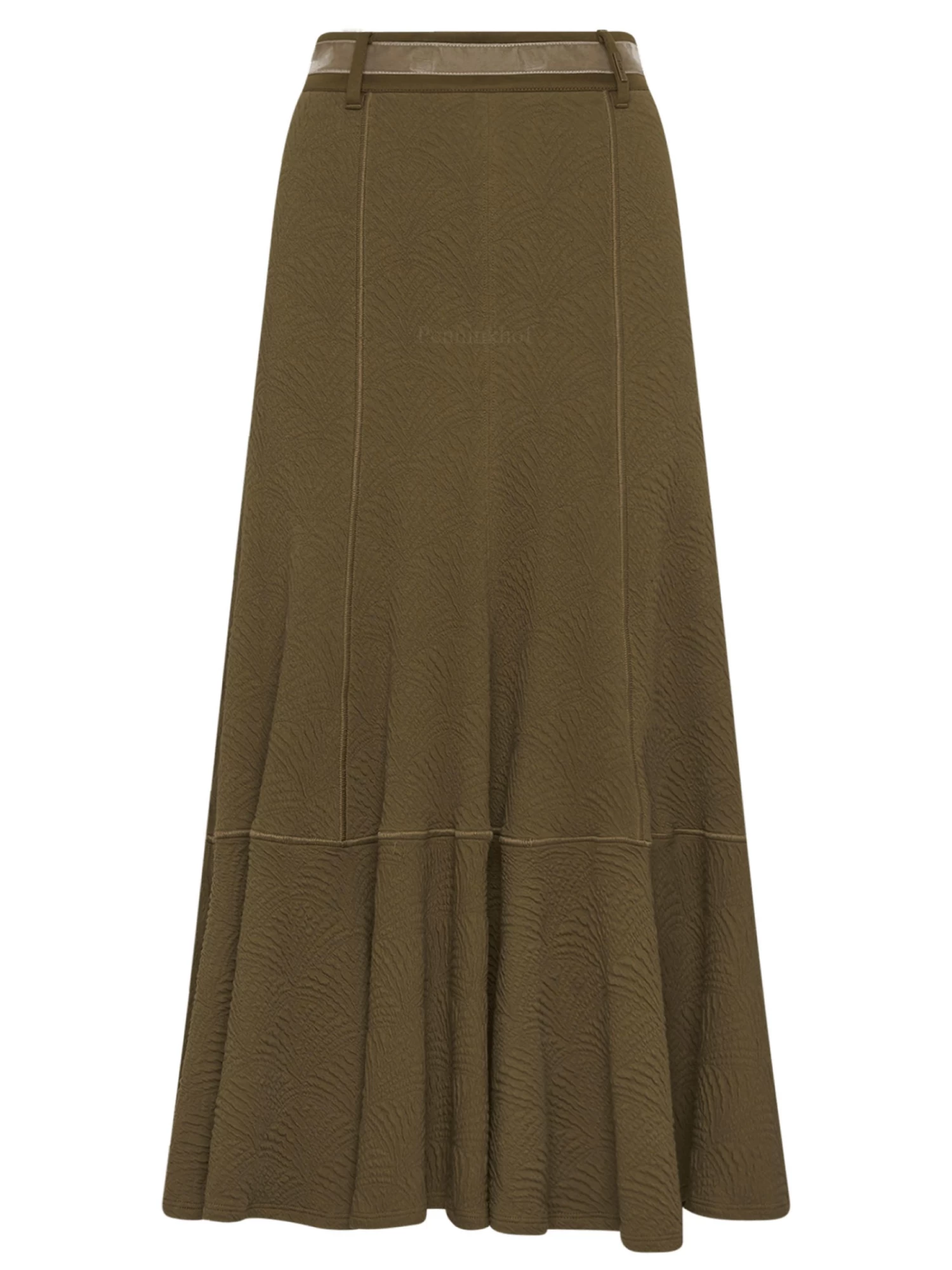 Een rok van High in de kleur olijfgroen. De stof is in een barok structuur.Ttot op de heup is de rok aangesloten en vanaf de heup is er een wijde A – Lijn. In de taille is een velour bies. Deze rok mag op de hand worden gewassen.