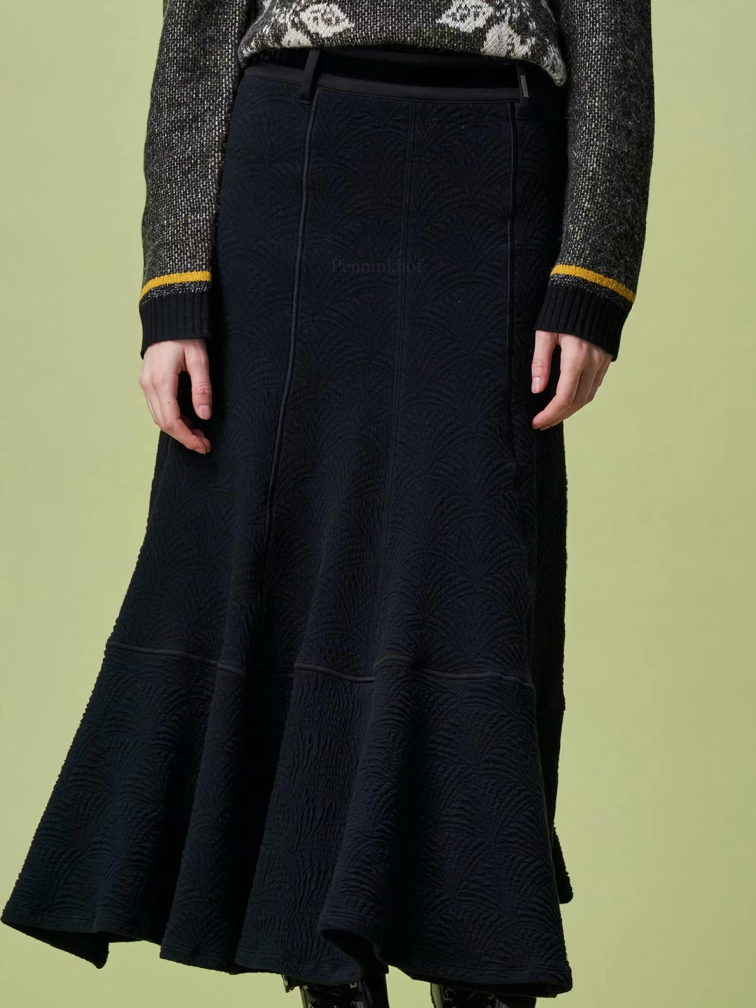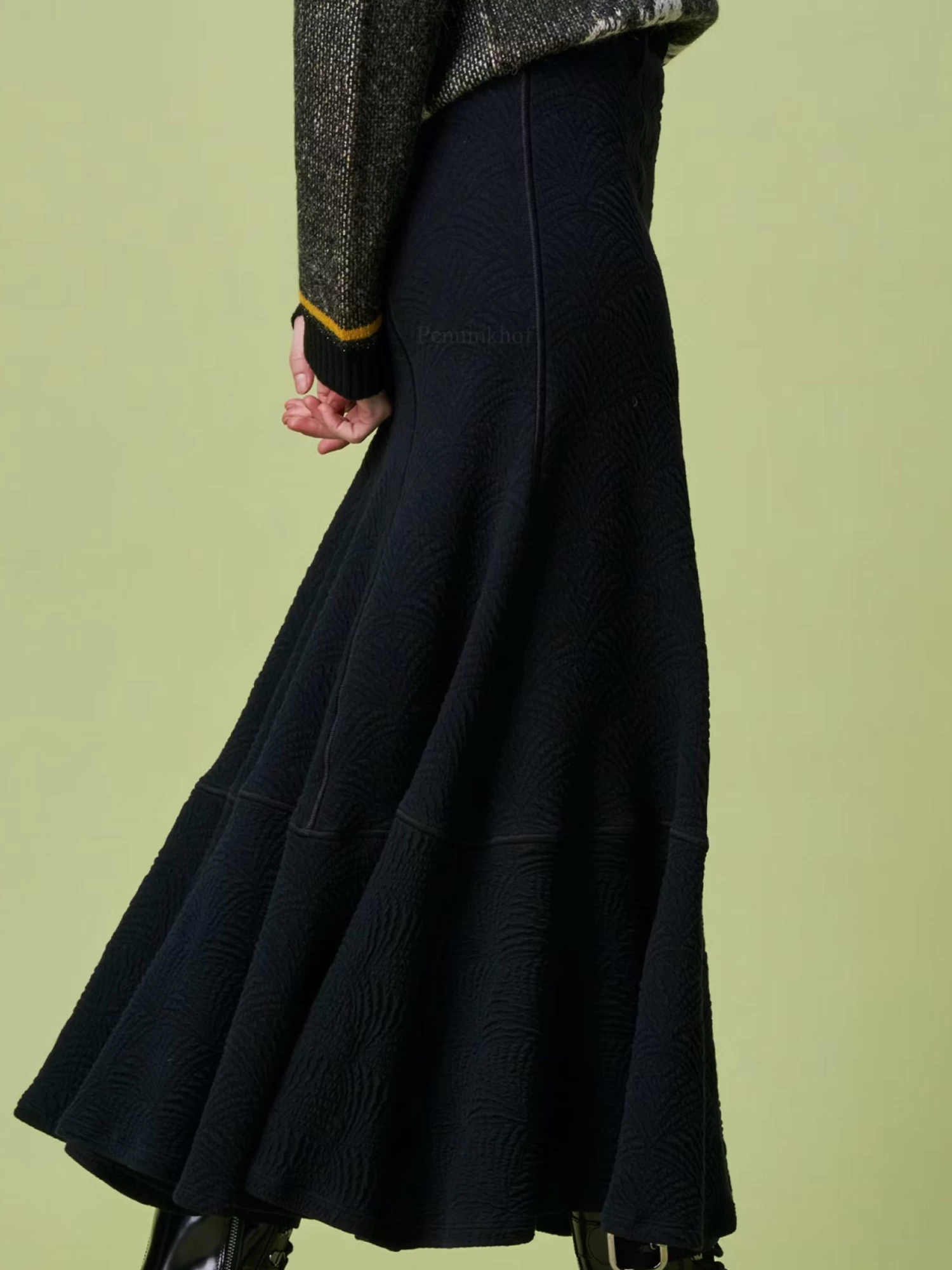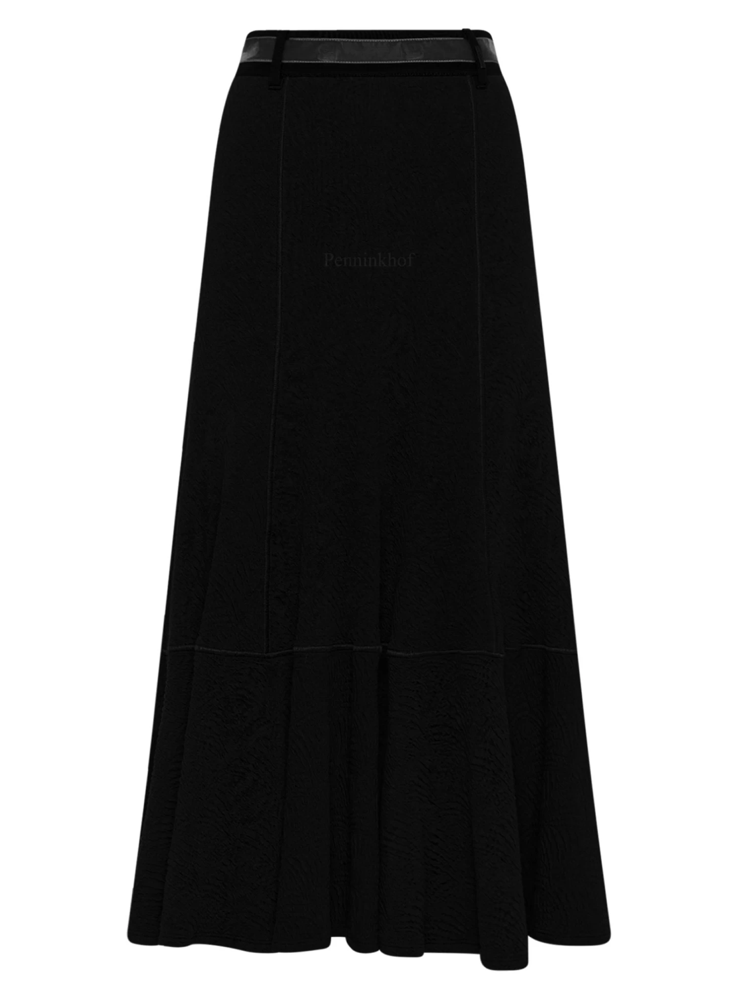 Een rok van High in de kleur zwart. De stof is in een barok structuur.Ttot op de heup is de rok aangesloten en vanaf de heup is er een wijde A – Lijn. In de taille is een velour bies. Deze rok mag op de hand worden gewassen.