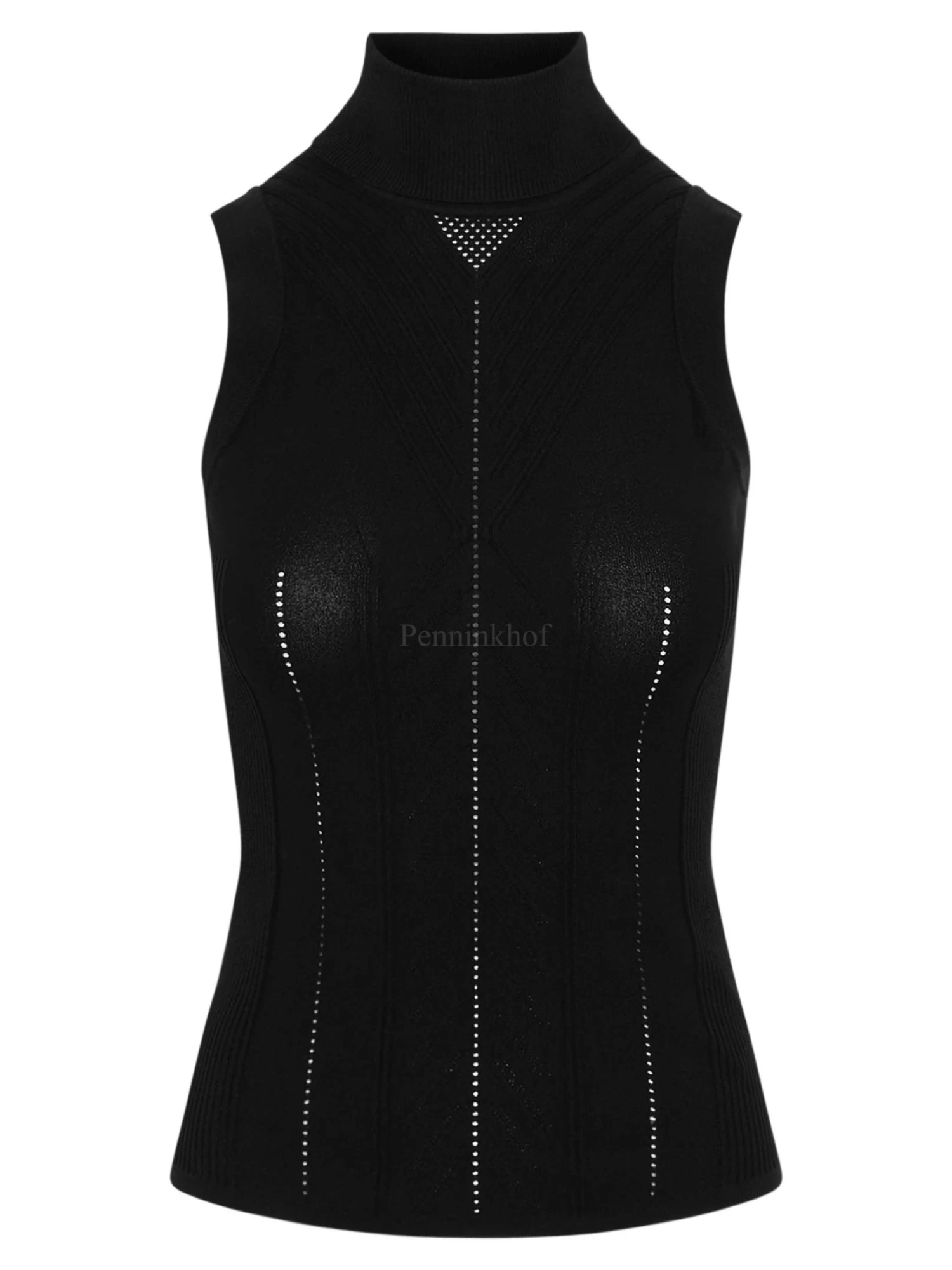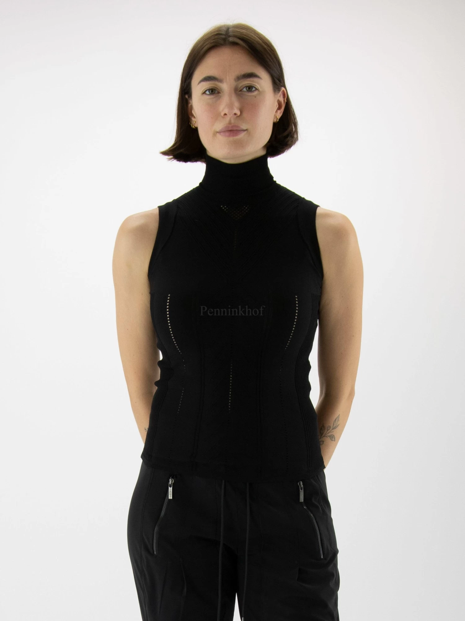 Een top van High in de kleur zwart. Zowel aan de voor als ook aan de achterkant zijn meerdere ajour patronen in de stof. Langs de zijkanten is de stof fijn geribbeld. De top heeft een col en mag op de hand worden gewassen.
