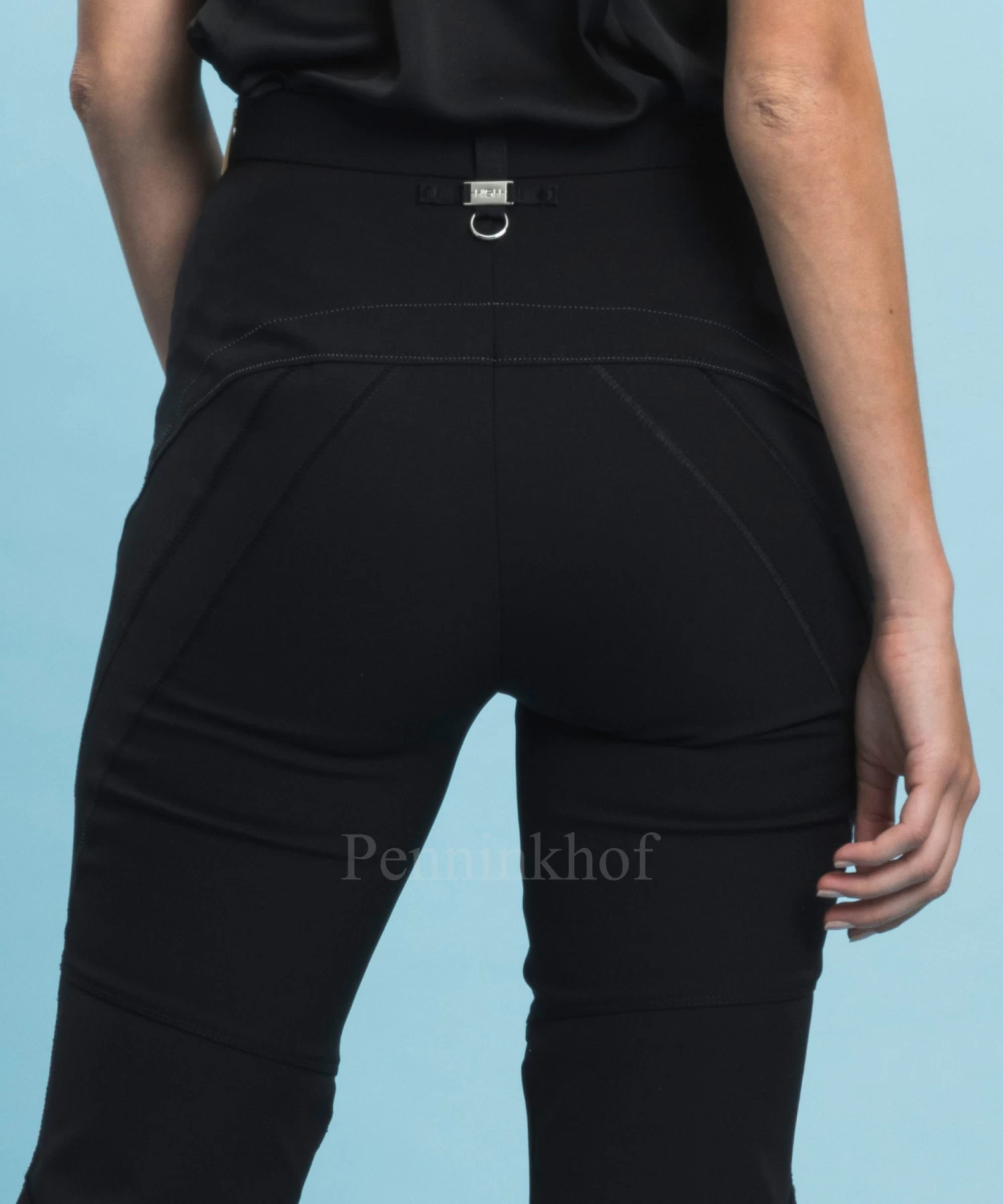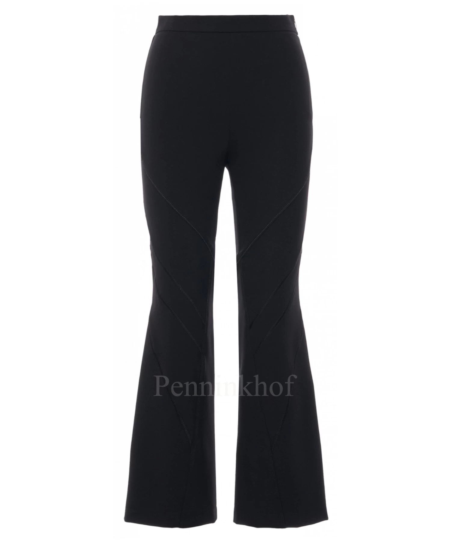 Een broek van High in de kleur zwart. Op het bovenbeen is een diagonale witte stiknaad. Vanaf de knie zijn er 3 mat satijnen diagonale stiknaden. De broek heeft een zij rits en mag op de hand worden gewassen.