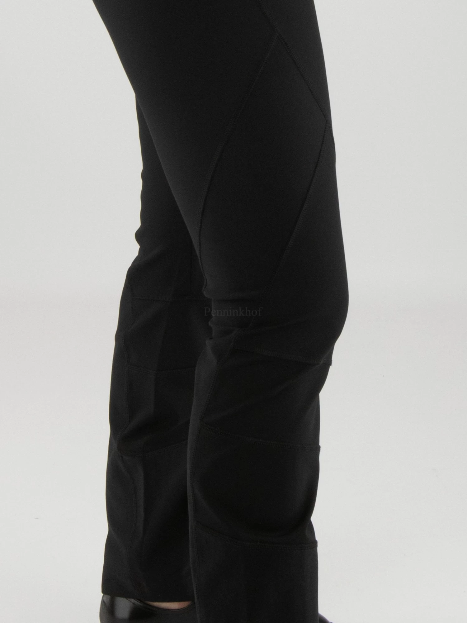 Een broek van High in de kleur zwart. In de taille is een elastieken band. Aan de onderkant is een de stof fijn geribbeld. De broek heeft meerdere decoratieve stiknaden en mag op de hand worden gewassen.