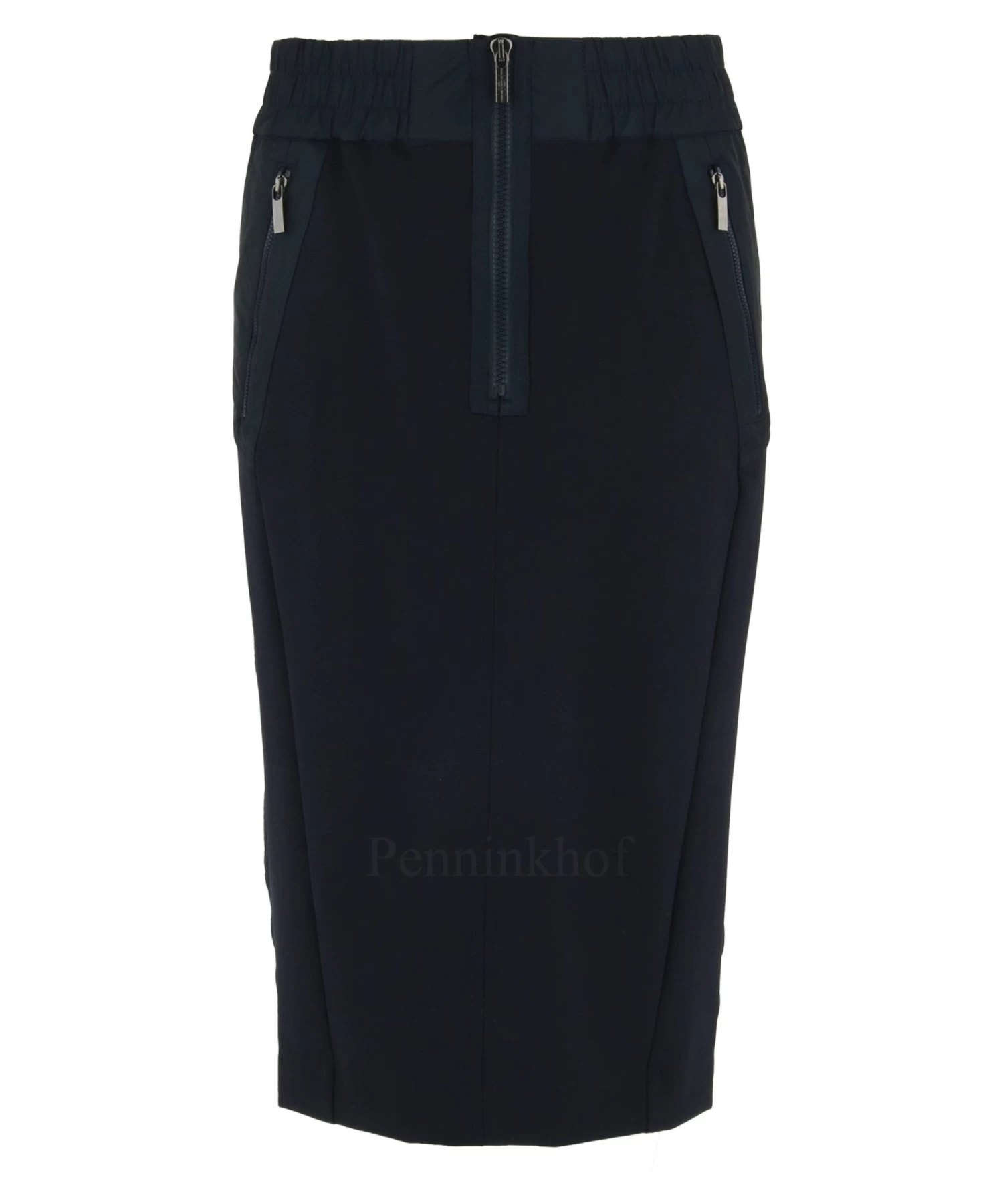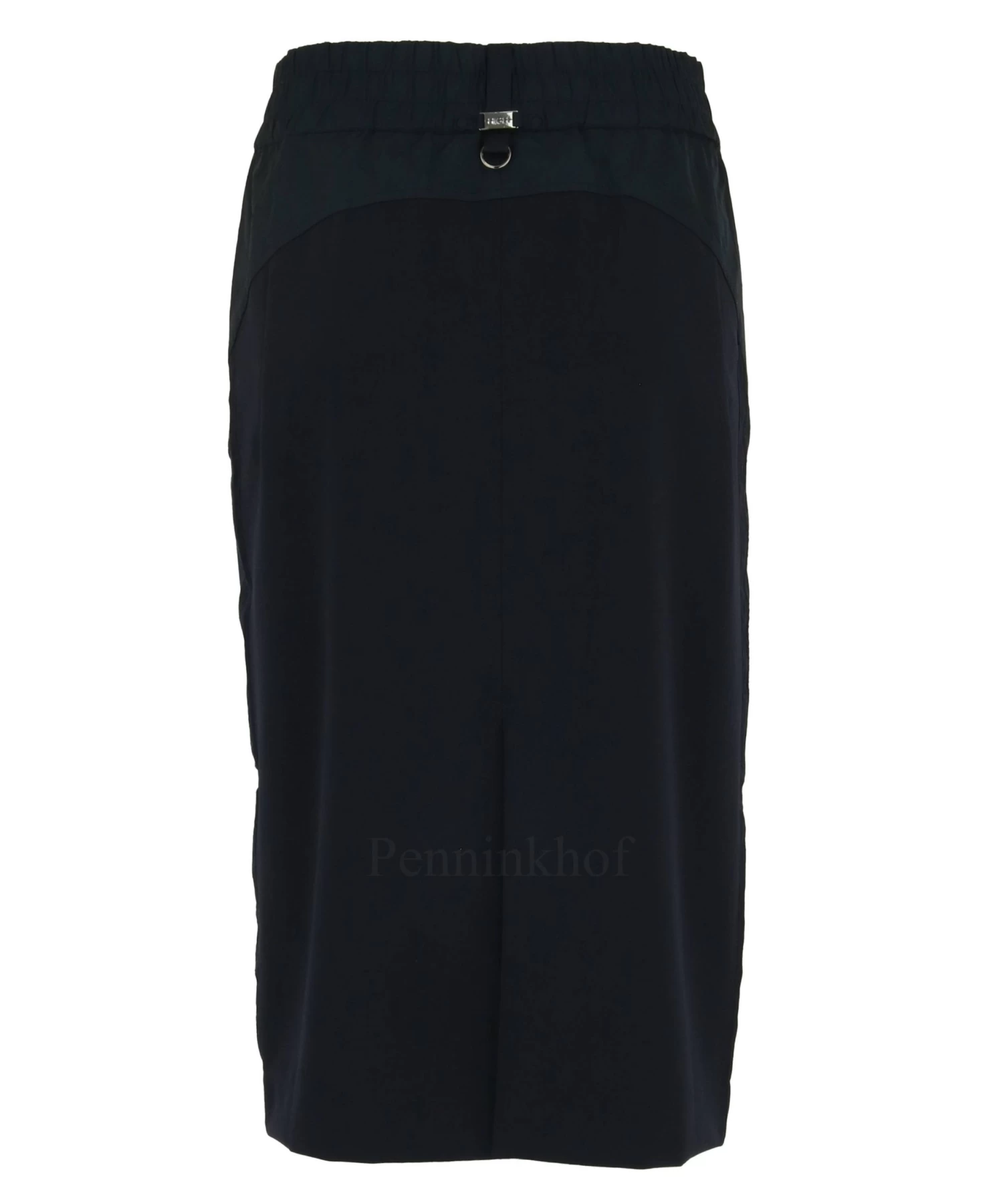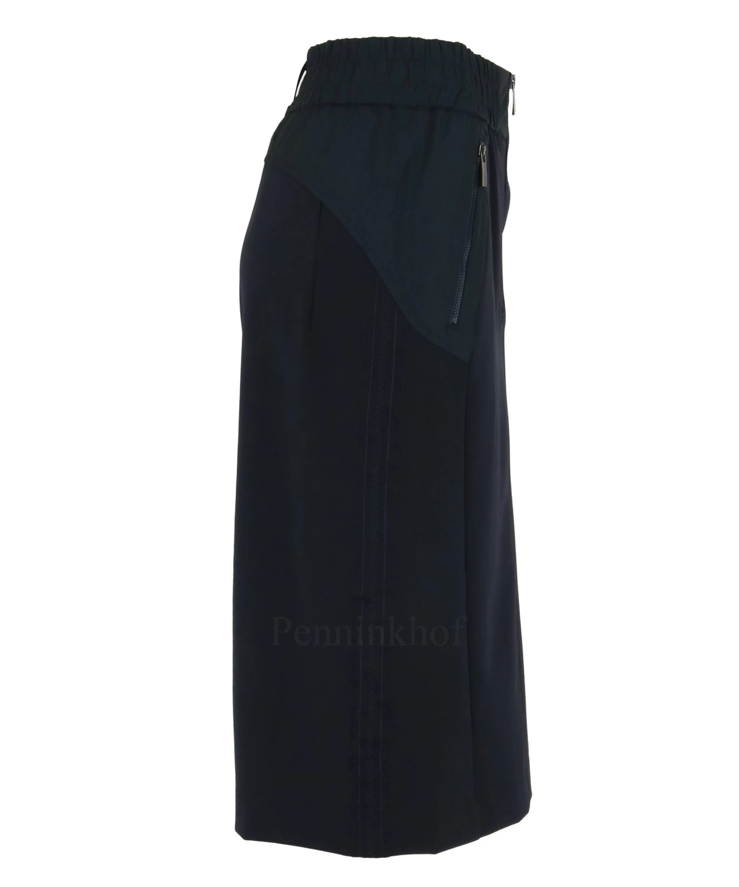 Een rok van High in de kleur marineblauw. In de taille is een elastieken band met een mat satijnen stof. deze stof is ook als bies langs de zijkanten en bij de zakken met een ritssluiting. Deze rok mag niet worden gewassen.
