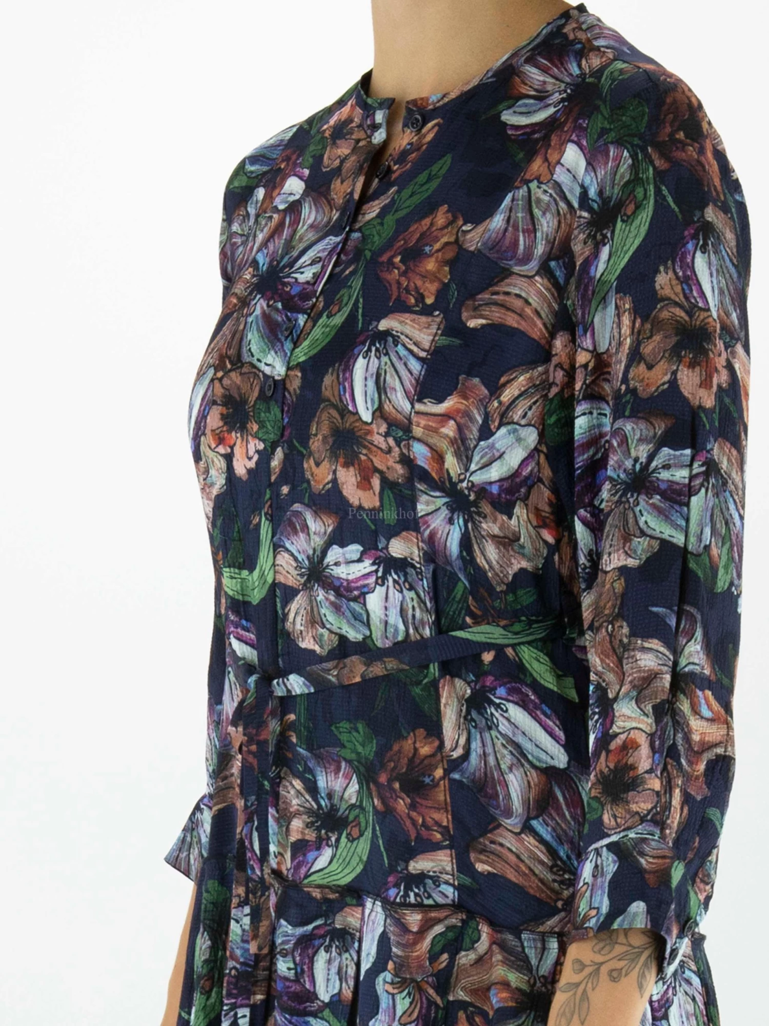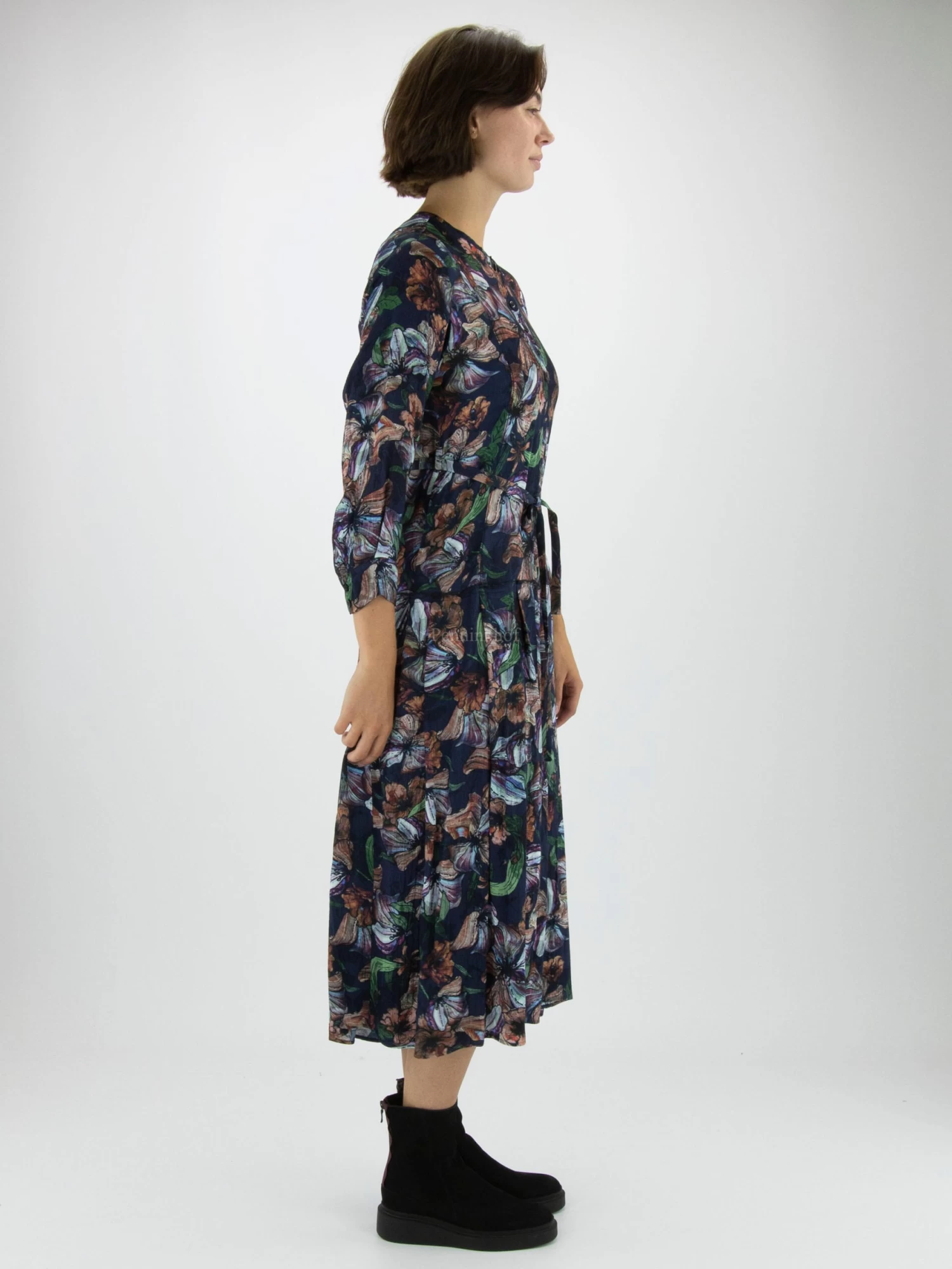 Een jurk van High in een print van orchideeën in meerdere kleuren op een indigo blauwe achtergrond. De jurk heeft een knoopsluiting vanuit de hals tot onder de buste. Ter hoogte van de taille is een stiknaad waaronder de jurk een plooistructuur heeft. In de taille is een smalle ceintuur in dezelfde stof als de jurk. Onder de ceintuur zijn steekzakken. Deze jurk mag op de hand worden gewassen.